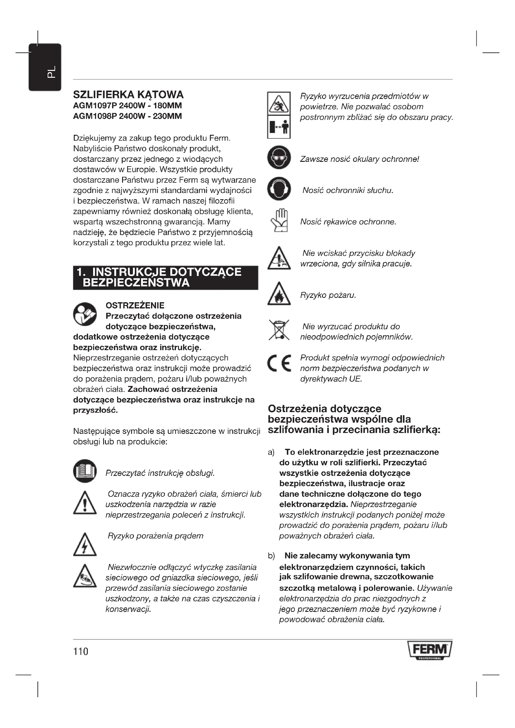 AGM1098P - Szlifierka kątowa elektryczna Ferm - Bezpłatna instrukcja obsługi