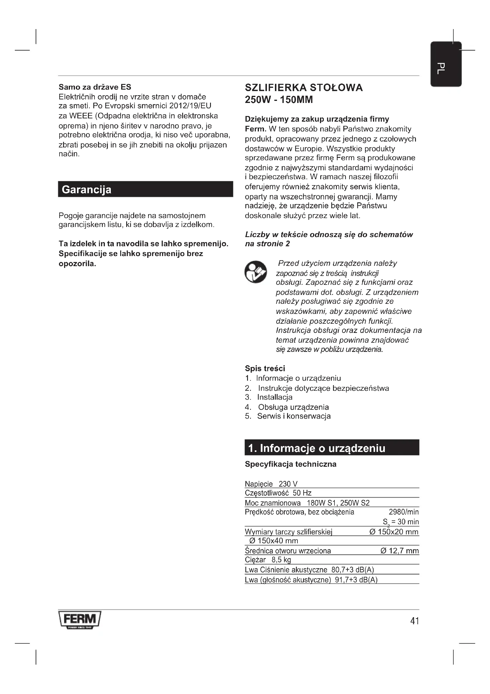 250W - 150MM Dziękujemy za zakup urządzenia firmy Ferm. W ten sposób nabyli Państwo znakomity produkt, opracowany przez jednego z czołowych dostawców w Europie. Wszystkie produkty sprzedawane przez firmę Ferm są produkowane zgodnie z najwyższymi standardami wydajności i bezpieczeństwa. W ramach naszej filozofii oferujemy również znakomity serwis klienta, oparty na wszechstronnej gwarancji. Mamy nadzieję, że urządzenie będzie Państwu doskonale służyć przez wiele lat. Liczby w tekście odnoszą się do schematów na stronie 2 Przedużyciemurządzenianależy zapoznaćsięztreściąinstrukcji obsługi.Zapoznaćsięzfunkcjamioraz podstawamidot.obsługi.Zurządzeniem należyposługiwaćsięzgodnieze wskazówkami,abyzapewnićwłaściwe działanieposzczególnychfunkcji. Instrukcjaobsługiorazdokumentacjana tematurządzeniapowinnaznajdować sięzawszewpobliżuurządzenia. Spis treści