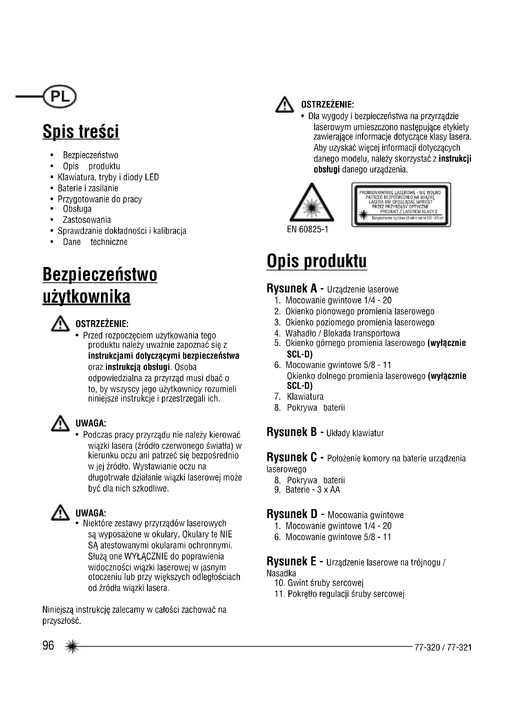 - 1,5 mm ≤ 2,0 mm (PRAWDA, urządzenie zachowuje kalibrację)102 77-320 / 77-321 Dane techniczne Urządzenie laserowe SCL SCL-D Dokładność w poziomie: ≤ 3 mm / 15 m Dokładność promienia poziomego / pionowego ≤ 3 mm / 15 m Dokładność promienia górnego: ≤ 3 mm / 15 m Dokładność promienia dolnego: ≤ 6 mm / 15 m Zakres kompensacji: Samopoziomowanie do ± 4° Odległość robocza: Linia: ≥ 10 m ≥ 15 m z detektorem wiązki laserowej: ≥ 25 m ≥ 50 m Punkt: ≥ 30 m Klasa lasera: Klasa 2 (EN60825-1) Pasmo wiązki laserowej 635 nm ± 5 nm Czas pracy: ≥ 18 godzin (baterie alkaliczne) ≥ 10 godzin (baterie alkaliczne) Źródło zasilania: Baterie - 3 x AA Klasa IP: IP54 Zakres temperatur roboczych: od -10° C do +50° C Zakres temperatur przechowywania: od -25° C do +70° C103 77-320 / 77-321 Notatki104 77-320 / 77-321 EN 60825-1 ΑΚΤΙΝΟΒΟΛΙΑ ΛΕΙΖΕΡ – ΜΗΝ ΚΟΙΤΑΤΕ ΤΗ ΔΕΣΜΗ Ή ΜΗΝ ΤΗΝ ΠΑΡΑΤΗΡΕΙΤΕ ΑΠΕΥΘΕΙΑΣ ΜΕ ΟΠΤΙΚΑ ΟΡΓΑΝΑ ΠΡΟΪΟΝ ΛΕΪΖΕΡ ΚΑΤΗΓΟΡΙΑΣ 2 Μέγιστη έξοδος ≤1 mW @ 630 - 670 nm Επισκόπηση προϊόντος Σχήμα A - Εργαλείο λέιζερ