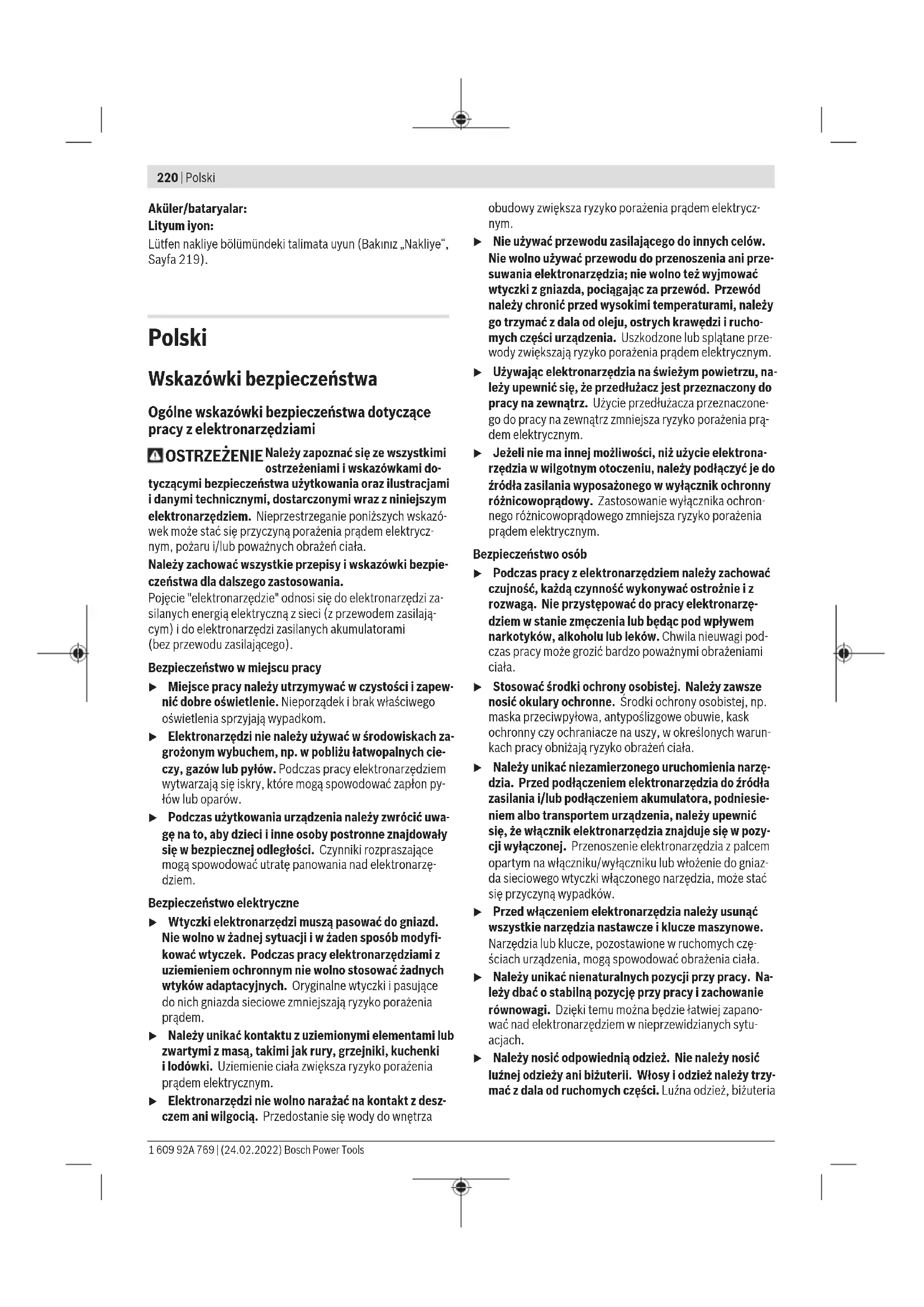 Karasoku Mahallesi 28028. Sokak No:20/A Merkez / ADANA Tel.: +903223599710 -3521379 Fax: +903223591323 E-mail: isiklar@isiklarelektrik.com Diğer servis adreslerini şurada bulabilirsiniz: www.bosch-pt.com/serviceaddresses Nakliye Önerilen Lityum İyon aküler tehlikeli madde taşıma yönetmeliği hükümlerine tabidir. Aküler başka bir yükümlülük olmaksızın kullanıcı tarafından caddeler üzerinde taşınabilir. Üçüncü kişiler eliyle yollanma durumunda (örneğin hava yolu ile veya nakliye şirketleri ile) paketleme ve etiketlemeye ilişkin özel hükümlere uyulmalıdır. Gönderi paketlenirken bir tehlikeli madde uzmanından yardım alınmalıdır. Aküleri sadece ve ancak gövdelerinde hasar yoksa gönderin. Açık kontakları kapatın ve aküyü ambalaj içinde hareket etmeyecek biçimde paketleyin. Lütfen olası ek ulusal yönetmelik hükümlerine de uyun. Tasfiye Elektrikli el aletleri, aküler, aksesuar ve ambalaj malzemesi çevre dostu tasfiye amacıyla bir geri dönüşüm merkezine yollanmalıdır. Elektrikli el aletlerini ve aküleri/bataryaları evsel çöplerin içine atmayın! Sadece AB ülkeleri için: Atık elektrikli ve elektronik cihazlara ilişkin 2012/19/EU sayılı Avrupa yönetmeliği ve ulusal hukuktaki uygulaması uyarınca, kullanım ömrünü tamamlamış elektrikli el aletleri ve 2006/66/EC sayılı Avrupa yönetmeliği uyarınca arızalı veya kullanım ömrünü tamamlamış aküler/piller ayrı ayrı toplanmalı ve çevre kurallarına uygun şekilde imha edilmek üzere bir geri dönüşüm merkezine gönderilmelidir. Atık elektrikli ve elektronik ekipmanlar uygun şekilde imha edilmezse olası tehlikeli maddelerin varlığı nedeniyle çevre ve insan sağlığı üzerinde zararlı etkileri olabilir. Bosch Power Tools 1 609 92A 769 | (24.02.2022)220 | Polski Aküler/bataryalar: Lityum iyon: Lütfen nakliye bölümündeki talimata uyun (Bakınız „Nakliye“, Sayfa219). Polski Wskazówki bezpieczeństwa Ogólne wskazówki bezpieczeństwa dotyczące pracy z elektronarzędziami OSTRZEŻENIE Należy zapoznać się ze wszystkimi ostrzeżeniami i wskazówkami do- tyczącymi bezpieczeństwa użytkowania oraz ilustracjami i danymi technicznymi, dostarczonymi wraz z niniejszym elektronarzędziem. Nieprzestrzeganie poniższych wskazó- wek może stać się przyczyną porażenia prądem elektrycz- nym, pożaru i/lub poważnych obrażeń ciała. Należy zachować wszystkie przepisy i wskazówki bezpie- czeństwa dla dalszego zastosowania. Pojęcie "elektronarzędzie" odnosi się do elektronarzędzi za- silanych energią elektryczną z sieci (z przewodem zasilają- cym) i do elektronarzędzi zasilanych akumulatorami (bezprzewodu zasilającego). Bezpieczeństwo w miejscu pracy u Miejsce pracy należy utrzymywać w czystości i zapew- nić dobre oświetlenie. Nieporządek i brak właściwego oświetlenia sprzyjają wypadkom. u Elektronarzędzi nie należy używać w środowiskach za- grożonym wybuchem, np. w pobliżu łatwopalnych cie- czy, gazów lub pyłów. Podczas pracy elektronarzędziem wytwarzają się iskry, które mogą spowodować zapłon py- łów lub oparów. u Podczas użytkowania urządzenia należy zwrócić uwa- gę na to, aby dzieci i inne osoby postronne znajdowały się w bezpiecznej odległości. Czynniki rozpraszające mogą spowodować utratę panowania nad elektronarzę- dziem. Bezpieczeństwo elektryczne u Wtyczki elektronarzędzi muszą pasować do gniazd. Nie wolno w żadnej sytuacji i w żaden sposób modyfi- kować wtyczek. Podczas pracy elektronarzędziami z uziemieniem ochronnym nie wolno stosować żadnych wtyków adaptacyjnych. Oryginalne wtyczki i pasujące do nich gniazda sieciowe zmniejszają ryzyko porażenia prądem. u Należy unikać kontaktu z uziemionymi elementami lub zwartymi z masą, takimi jak rury, grzejniki, kuchenki ilodówki. Uziemienie ciała zwiększa ryzyko porażenia prądem elektrycznym. u Elektronarzędzi nie wolno narażać na kontakt z desz- czem ani wilgocią. Przedostanie się wody do wnętrza obudowy zwiększa ryzyko porażenia prądem elektrycz- nym. u Nie używać przewodu zasilającego do innych celów. Nie wolno używać przewodu do przenoszenia ani prze- suwania elektronarzędzia; nie wolno też wyjmować wtyczki z gniazda, pociągając za przewód. Przewód należy chronić przed wysokimi temperaturami, należy go trzymać zdala od oleju, ostrych krawędzi i rucho- mych części urządzenia. Uszkodzone lub splątane prze- wody zwiększają ryzyko porażenia prądem elektrycznym. u Używając elektronarzędzia na świeżym powietrzu, na- leży upewnić się, że przedłużacz jest przeznaczony do pracy na zewnątrz. Użycie przedłużacza przeznaczone- go do pracy na zewnątrz zmniejsza ryzyko porażenia prą- dem elektrycznym. u Jeżeli nie ma innej możliwości, niż użycie elektrona- rzędzia w wilgotnym otoczeniu, należy podłączyć je do źródła zasilania wyposażonego w wyłącznik ochronny różnicowoprądowy. Zastosowanie wyłącznika ochron- nego różnicowoprądowego zmniejsza ryzyko porażenia prądem elektrycznym. Bezpieczeństwo osób u Podczas pracy z elektronarzędziem należy zachować czujność, każdą czynność wykonywać ostrożnie i z rozwagą. Nie przystępować do pracy elektronarzę- dziem w stanie zmęczenia lub będąc pod wpływem narkotyków, alkoholu lub leków. Chwila nieuwagi pod- czas pracy może grozić bardzo poważnymi obrażeniami ciała. u Stosować środki ochrony osobistej. Należy zawsze nosić okulary ochronne. Środki ochrony osobistej, np. maska przeciwpyłowa, antypoślizgowe obuwie, kask ochronny czy ochraniacze na uszy, w określonych warun- kach pracy obniżają ryzyko obrażeń ciała. u Należy unikać niezamierzonego uruchomienia narzę- dzia. Przed podłączeniem elektronarzędzia do źródła zasilania i/lub podłączeniem akumulatora, podniesie- niem albo transportem urządzenia, należy upewnić się, że włącznik elektronarz