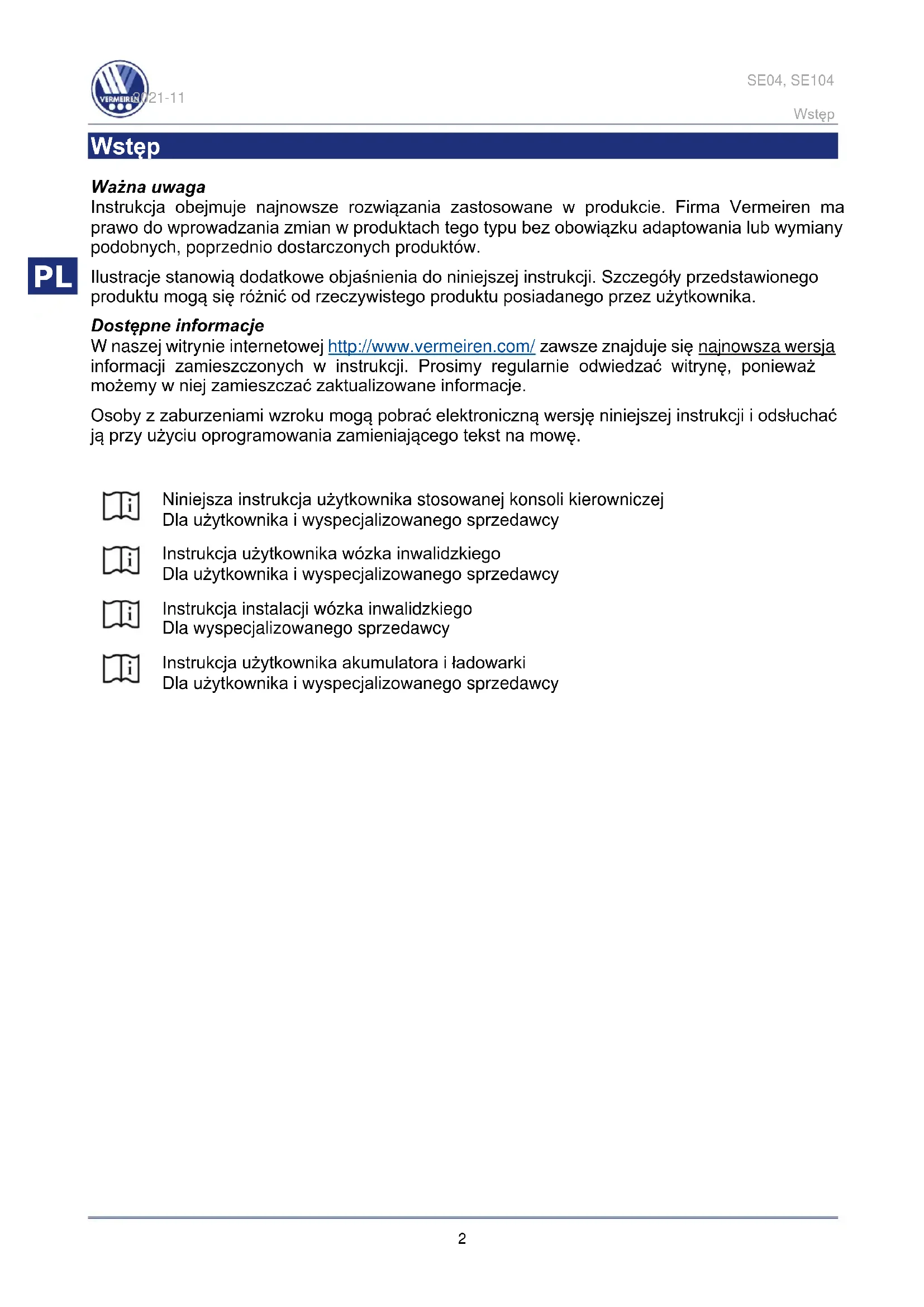 Wstęp Ważna uwaga Instrukcja obejmuje najnowsze rozwiązania zastosowane w produkcie. Firma Vermeiren ma prawo do wprowadzania zmian w produktach tego typu bez obowiązku adaptowania lub wymiany podobnych, poprzednio dostarczonych produktów. Ilustracje stanowią dodatkowe objaśnienia do niniejszej instrukcji. Szczegóły przedstawionego produktu mogą się różnić od rzeczywistego produktu posiadanego przez użytkownika. Dostępne informacje W naszej witrynie internetowej http://www.vermeiren.com/ zawsze znajduje się najnowsza wersja informacji zamieszczonych w instrukcji. Prosimy regularnie odwiedzać witrynę, ponieważ możemy w niej zamieszczać zaktualizowane informacje. Osoby z zaburzeniami wzroku mogą pobrać elektroniczną wersję niniejszej instrukcji i odsłuchać ją przy użyciu oprogramowania zamieniającego tekst na mowę.