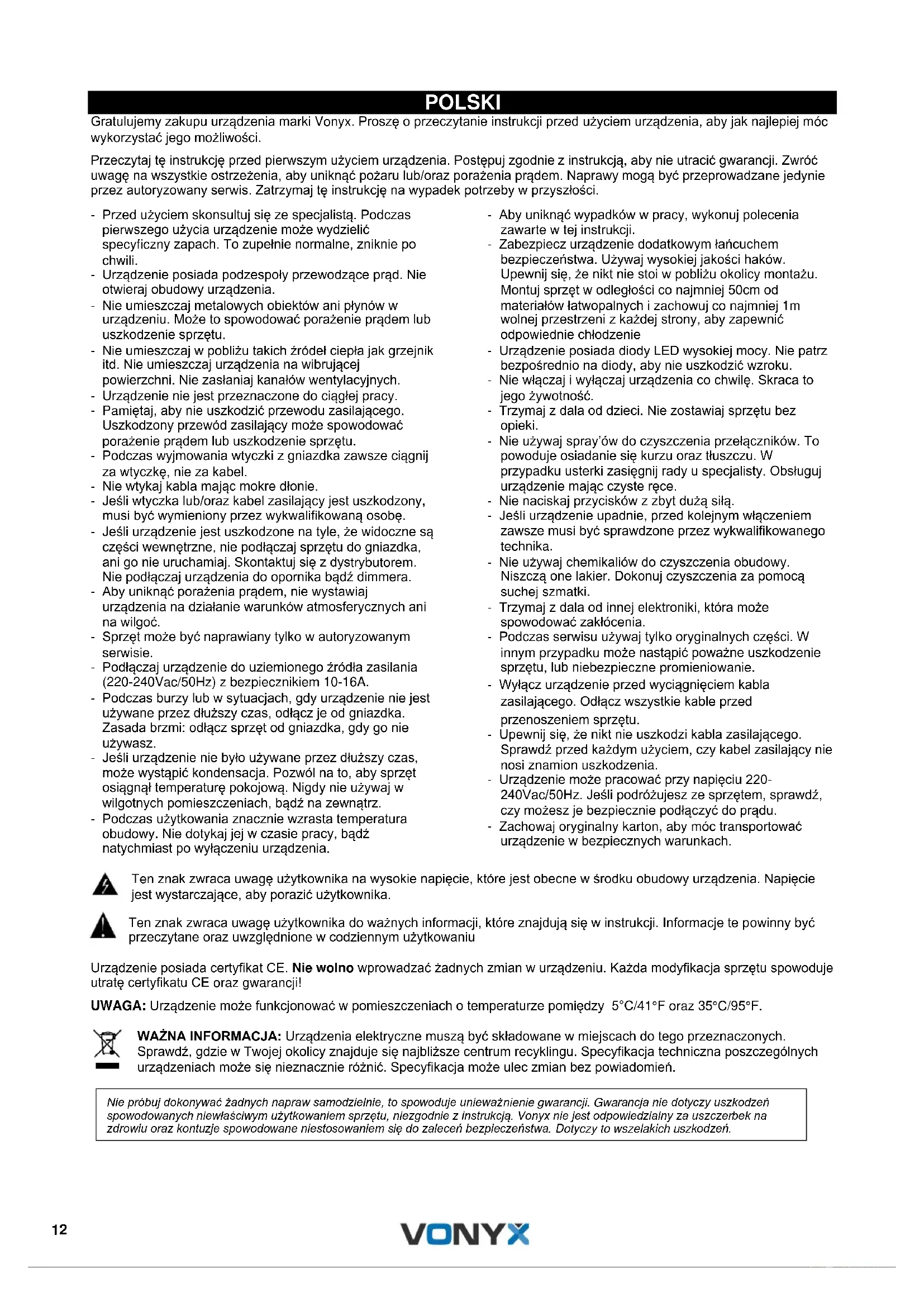 CONNEXION BT Appuyez sur la touche mode jusqu’à ce que puissiez lire “BT“. Ensuite utilisez votre téléphone mobile ou ordinateur pour rechercher un appareil BT. Lorsque vous trouvez le “VX800BT”, appairez les appareils. Aucun code n’est nécessaire.12 POLSKI Gratulujemy zakupu urządzenia marki Vonyx. Proszę o przeczytanie instrukcji przed użyciem urządzenia, aby jak najlepiej móc wykorzystać jego możliwości. Przeczytaj tę instrukcję przed pierwszym użyciem urządzenia. Postępuj zgodnie z instrukcją, aby nie utracić gwarancji. Zwróć uwagę na wszystkie ostrzeżenia, aby uniknąć pożaru lub/oraz porażenia prądem. Naprawy mogą być przeprowadzane jedynie przez autoryzowany serwis. Zatrzymaj tę instrukcję na wypadek potrzeby w przyszłości. - Przed użyciem skonsultuj się ze specjalistą. Podczas pierwszego użycia urządzenie może wydzielić specyficzny zapach. To zupełnie normalne, zniknie po chwili. - Urządzenie posiada podzespoły przewodzące prąd. Nie otwieraj obudowy urządzenia. - Nie umieszczaj metalowych obiektów ani płynów w urządzeniu. Może to spowodować porażenie prądem lub uszkodzenie sprzętu. - Nie umieszczaj w pobliżu takich źródeł ciepła jak grzejnik itd. Nie umieszczaj urządzenia na wibrującej powierzchni. Nie zasłaniaj kanałów wentylacyjnych. - Urządzenie nie jest przeznaczone do ciągłej pracy. - Pamiętaj, aby nie uszkodzić przewodu zasilającego. Uszkodzony przewód zasilający może spowodować porażenie prądem lub uszkodzenie sprzętu. - Podczas wyjmowania wtyczki z gniazdka zawsze ciągnij za wtyczkę, nie za kabel. - Nie wtykaj kabla mając mokre dłonie. - Jeśli wtyczka lub/oraz kabel zasilający jest uszkodzony, musi być wymieniony przez wykwalifikowaną osobę. - Jeśli urządzenie jest uszkodzone na tyle, że widoczne są części wewnętrzne, nie podłączaj sprzętu do gniazdka, ani go nie uruchamiaj. Skontaktuj się z dystrybutorem. Nie podłączaj urządzenia do opornika bądź dimmera. - Aby uniknąć porażenia prądem, nie wystawiaj urządzenia na działanie warunków atmosferycznych ani na wilgoć. - Sprzęt może być naprawiany tylko w autoryzowanym serwisie. - Podłączaj urządzenie do uziemionego źródła zasilania (220-240Vac/50Hz) z bezpiecznikiem 10-16A. - Podczas burzy lub w sytuacjach, gdy urządzenie nie jest używane przez dłuższy czas, odłącz je od gniazdka. Zasada brzmi: odłącz sprzęt od gniazdka, gdy go nie używasz. - Jeśli urządzenie nie było używane przez dłuższy czas, może wystąpić kondensacja. Pozwól na to, aby sprzęt osiągnął temperaturę pokojową. Nigdy nie używaj w wilgotnych pomieszczeniach, bądź na zewnątrz. - Podczas użytkowania znacznie wzrasta temperatura obudowy. Nie dotykaj jej w czasie pracy, bądź natychmiast po wyłączeniu urządzenia. - Aby uniknąć wypadków w pracy, wykonuj polecenia zawarte w tej instrukcji. - Zabezpiecz urządzenie dodatkowym łańcuchem bezpieczeństwa. Używaj wysokiej jakości haków. Upewnij się, że nikt nie stoi w pobliżu okolicy montażu. Montuj sprzęt w odległości co najmniej 50cm od materiałów łatwopalnych i zachowuj co najmniej 1m wolnej przestrzeni z każdej strony, aby zapewnić odpowiednie chłodzenie - Urządzenie posiada diody LED wysokiej mocy. Nie patrz bezpośrednio na diody, aby nie uszkodzić wzroku. - Nie włączaj i wyłączaj urządzenia co chwilę. Skraca to jego żywotność. - Trzymaj z dala od dzieci. Nie zostawiaj sprzętu bez opieki. - Nie używaj spray’ów do czyszczenia przełączników. To powoduje osiadanie się kurzu oraz tłuszczu. W przypadku usterki zasięgnij rady u specjalisty. Obsługuj urządzenie mając czyste ręce. - Nie naciskaj przycisków z zbyt dużą siłą. - Jeśli urządzenie upadnie, przed kolejnym włączeniem zawsze musi być sprawdzone przez wykwalifikowanego technika. - Nie używaj chemikaliów do czyszczenia obudowy. Niszczą one lakier. Dokonuj czyszczenia za pomocą suchej szmatki. - Trzymaj z dala od innej elektroniki, która może spowodować zakłócenia. - Podczas serwisu używaj tylko oryginalnych części. W innym przypadku może nastąpić poważne uszkodzenie sprzętu, lub niebezpieczne promieniowanie. - Wyłącz urządzenie przed wyciągnięciem kabla zasilającego. Odłącz wszystkie kable przed przenoszeniem sprzętu. - Upewnij się, że nikt nie uszkodzi kabla zasilającego. Sprawdź przed każdym użyciem, czy kabel zasilający nie nosi znamion uszkodzenia. - Urządzenie może pracować przy napięciu 220- 240Vac/50Hz. Jeśli podróżujesz ze sprzętem, sprawdź, czy możesz je bezpiecznie podłączyć do prądu. - Zachowaj oryginalny karton, aby móc transportować urządzenie w bezpiecznych warunkach. Ten znak zwraca uwagę użytkownika na wysokie napięcie, które jest obecne w środku obudowy urządzenia. Napięcie jest wystarczające, aby porazić użytkownika. Ten znak zwraca uwagę użytkownika do ważnych informacji, które znajdują się w instrukcji. Informacje te powinny być przeczytane oraz uwzględnione w codziennym użytkowaniu Urządzenie posiada certyfikat CE. Nie wolno wprowadzać żadnych zmian w urządzeniu. Każda modyfikacja sprzętu spowoduje utratę certyfikatu CE oraz gwarancji! UWAGA: Urządzenie może funkcjonować w pomieszczeniach o temperaturze pomiędzy 5°C/41°F oraz 35°C/95°F. WAŻNA INFORMACJA: Urządzenia elektryczne muszą być składowane w miejscach do tego przeznaczonych. Sprawdź, gdzie w Twojej okolicy znajduje się najbliższe centrum recyklingu. Specyfikacja techniczna poszczególnych urządzeniach może się nieznacznie różnić. Specyfikacja może ulec zmian bez powiadomień.