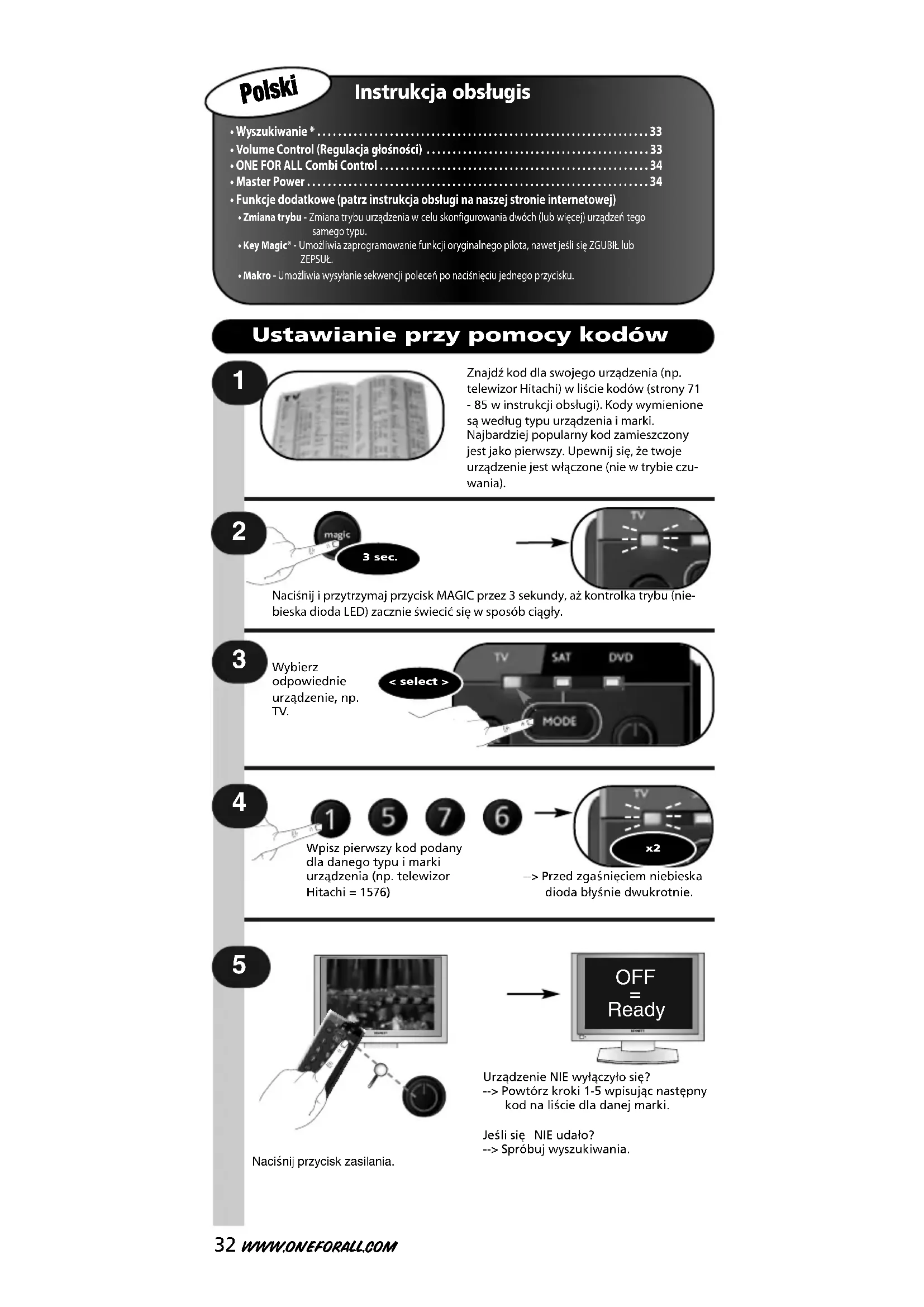Naciśnij i przytrzymaj przycisk MAGIC przez 3 sekundy, aż kontrolka trybu (nie-bieska dioda LED) zacznie świecić się w sposób ciągły.Wpisz pierwszy kod podanydla danego typu i markiurządzenia (np. telewizorHitachi = 1576)--> Przed zgaśnięciem niebieska dioda błyśnie dwukrotnie.Urządzenie NIE wyłączyło się?--> Powtórz kroki 1-5 wpisując następnykod na liście dla danej marki.Jeśli się NIE udało?--> Spróbuj wyszukiwania.< select >Wybierzodpowiednieurządzenie, np. TV. 3 sec.