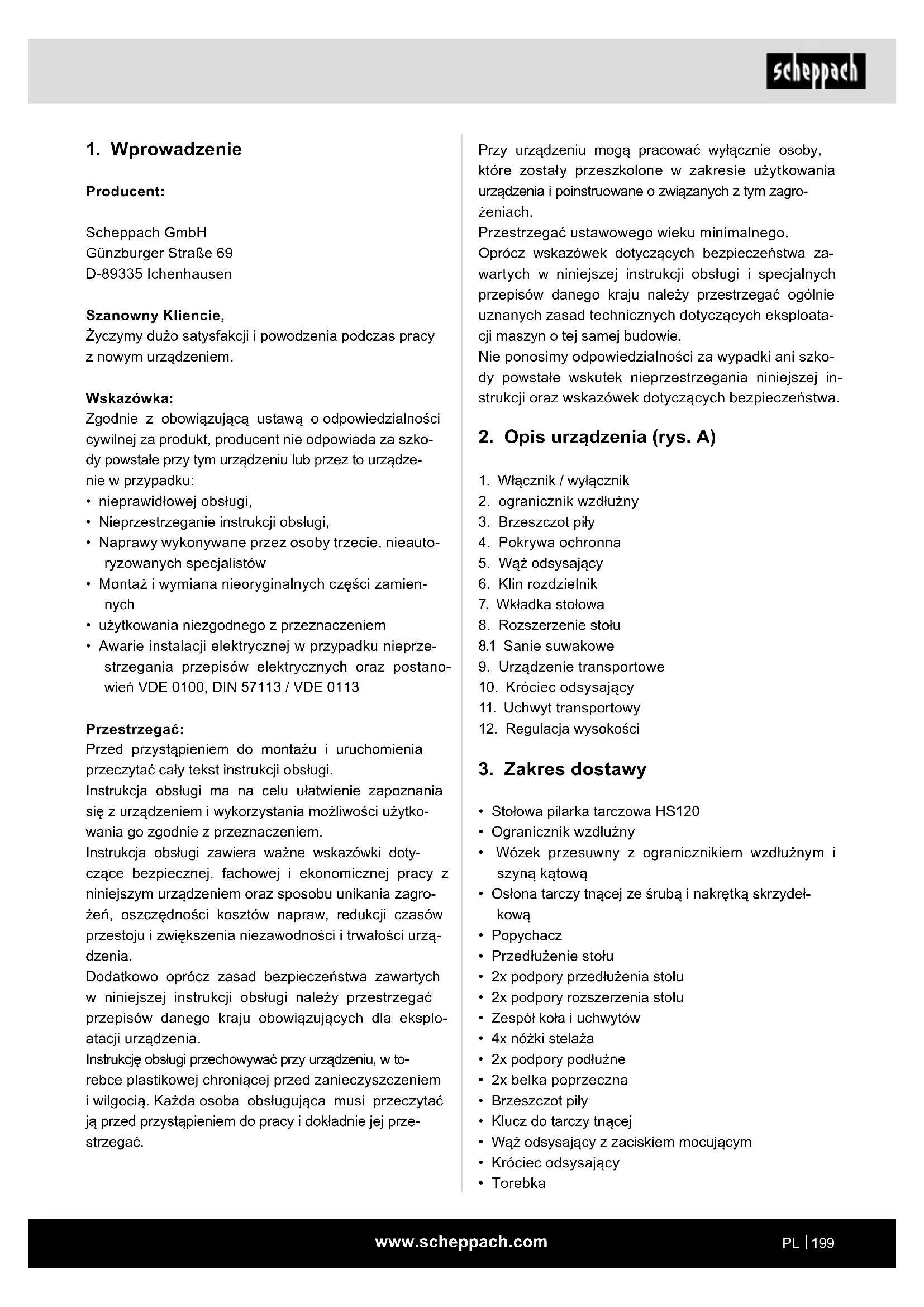 Producent: Scheppach GmbH Günzburger Straße 69 D-89335 Ichenhausen Szanowny Kliencie, Życzymy dużo satysfakcji i powodzenia podczas pracy z nowym urządzeniem. Wskazówka: Zgodnie z obowiązującą ustawą o odpowiedzialności cywilnej za produkt, producent nie odpowiada za szko- dy powstałe przy tym urządzeniu lub przez to urządze- nie w przypadku: