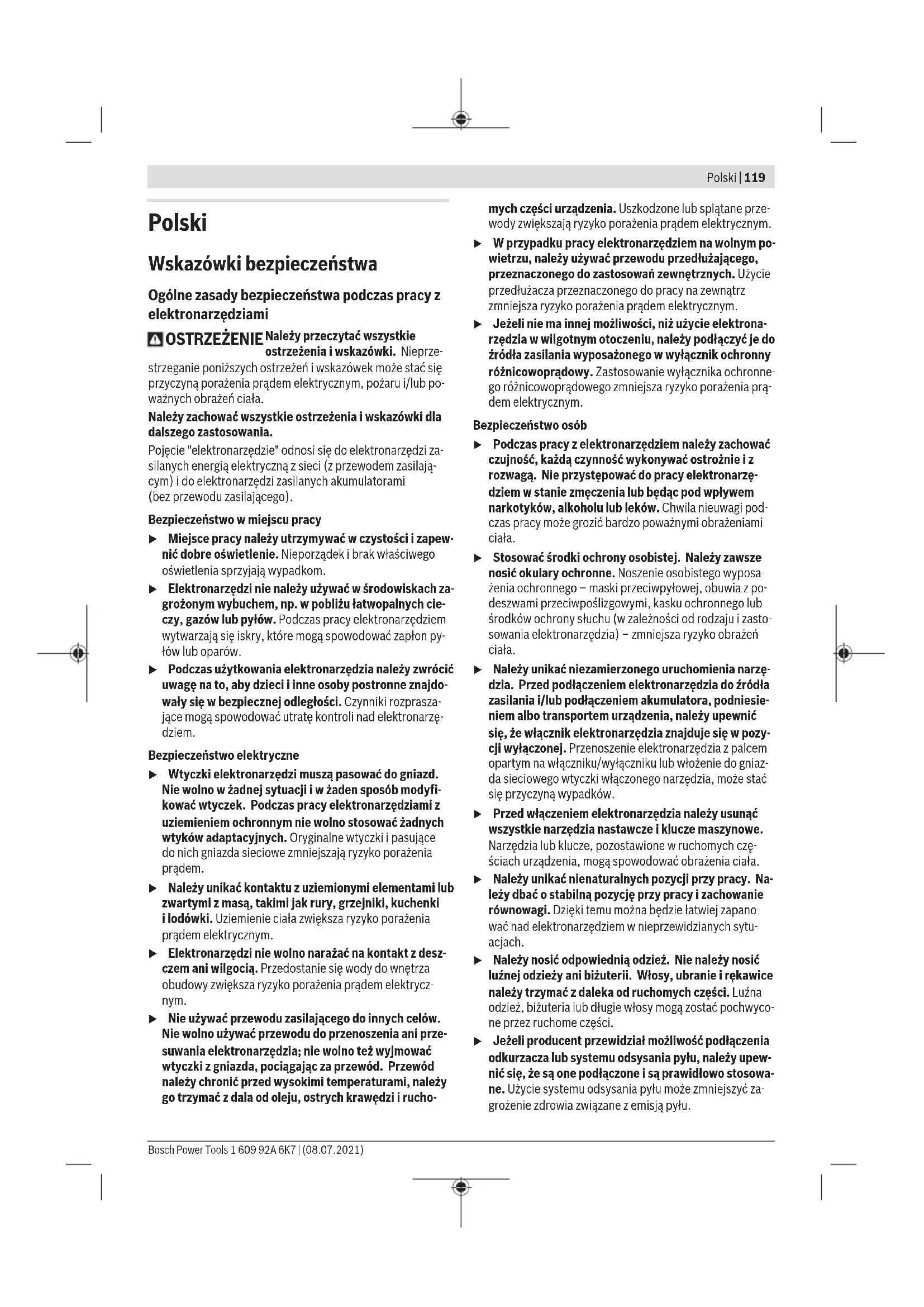 Karasoku Mahallesi 28028. Sokak No:20/A Merkez / ADANA Tel.: +903223599710 -3521379 Fax: +903223591323 E-mail: isiklar@isiklarelektrik.com Diğer servis adreslerini şurada bulabilirsiniz: www.bosch-pt.com/serviceaddresses Tasfiye Elektrikli el aleti, aksesuar ve ambalaj malzemesi çevre dostu bir yöntemle tasfiye edilmek üzere tekrar kazanım merkezine gönderilmelidir. Elektrikli el aletlerini evsel çöplerin içine atmayın! Sadece AB ülkeleri için: Eski elektrikli el aletleri ve elektronik aletlere ilişkin 2012/19/EU sayılı Avrupa Birliği yönetmeliği ve bunların tek tek ülkelerin hukuklarına uyarlanması uyarınca, kullanım ömrünü tamamlamış elektrikli el aletleri ayrı ayrı toplanmak ve çevre dostu bir yöntemle tasfiye edilmek üzere yeniden kazanım merkezlerine gönderilmek zorundadır. 1 609 92A 6K7 | (08.07.2021) Bosch Power ToolsPolski | 119 Polski Wskazówki bezpieczeństwa Ogólne zasady bezpieczeństwa podczas pracy z elektronarzędziami OSTRZEŻENIE Należy przeczytać wszystkie ostrzeżenia i wskazówki. Nieprze- strzeganie poniższych ostrzeżeń i wskazówek może stać się przyczyną porażenia prądem elektrycznym, pożaru i/lub po- ważnych obrażeń ciała. Należy zachować wszystkie ostrzeżenia i wskazówki dla dalszego zastosowania. Pojęcie "elektronarzędzie" odnosi się do elektronarzędzi za- silanych energią elektryczną z sieci (z przewodem zasilają- cym) i do elektronarzędzi zasilanych akumulatorami (bezprzewodu zasilającego). Bezpieczeństwo w miejscu pracy u Miejsce pracy należy utrzymywać w czystości i zapew- nić dobre oświetlenie. Nieporządek i brak właściwego oświetlenia sprzyjają wypadkom. u Elektronarzędzi nie należy używać w środowiskach za- grożonym wybuchem, np. w pobliżu łatwopalnych cie- czy, gazów lub pyłów. Podczas pracy elektronarzędziem wytwarzają się iskry, które mogą spowodować zapłon py- łów lub oparów. u Podczas użytkowania elektronarzędzia należy zwrócić uwagę na to, aby dzieci i inne osoby postronne znajdo- wały się w bezpiecznej odległości. Czynniki rozprasza- jące mogą spowodować utratę kontroli nad elektronarzę- dziem. Bezpieczeństwo elektryczne u Wtyczki elektronarzędzi muszą pasować do gniazd. Nie wolno w żadnej sytuacji i w żaden sposób modyfi- kować wtyczek. Podczas pracy elektronarzędziami z uziemieniem ochronnym nie wolno stosować żadnych wtyków adaptacyjnych. Oryginalne wtyczki i pasujące do nich gniazda sieciowe zmniejszają ryzyko porażenia prądem. u Należy unikać kontaktu z uziemionymi elementami lub zwartymi z masą, takimi jak rury, grzejniki, kuchenki ilodówki. Uziemienie ciała zwiększa ryzyko porażenia prądem elektrycznym. u Elektronarzędzi nie wolno narażać na kontakt z desz- czem ani wilgocią. Przedostanie się wody do wnętrza obudowy zwiększa ryzyko porażenia prądem elektrycz- nym. u Nie używać przewodu zasilającego do innych celów. Nie wolno używać przewodu do przenoszenia ani prze- suwania elektronarzędzia; nie wolno też wyjmować wtyczki z gniazda, pociągając za przewód. Przewód należy chronić przed wysokimi temperaturami, należy go trzymać zdala od oleju, ostrych krawędzi i rucho- mych części urządzenia. Uszkodzone lub splątane prze- wody zwiększają ryzyko porażenia prądem elektrycznym. u W przypadku pracy elektronarzędziem na wolnym po- wietrzu, należy używać przewodu przedłużającego, przeznaczonego do zastosowań zewnętrznych. Użycie przedłużacza przeznaczonego do pracy na zewnątrz zmniejsza ryzyko porażenia prądem elektrycznym. u Jeżeli nie ma innej możliwości, niż użycie elektrona- rzędzia w wilgotnym otoczeniu, należy podłączyć je do źródła zasilania wyposażonego w wyłącznik ochronny różnicowoprądowy. Zastosowanie wyłącznika ochronne- go różnicowoprądowego zmniejsza ryzyko porażenia prą- dem elektrycznym. Bezpieczeństwo osób u Podczas pracy z elektronarzędziem należy zachować czujność, każdą czynność wykonywać ostrożnie i z rozwagą. Nie przystępować do pracy elektronarzę- dziem w stanie zmęczenia lub będąc pod wpływem narkotyków, alkoholu lub leków. Chwila nieuwagi pod- czas pracy może grozić bardzo poważnymi obrażeniami ciała. u Stosować środki ochrony osobistej. Należy zawsze nosić okulary ochronne. Noszenie osobistego wyposa- żenia ochronnego – maski przeciwpyłowej, obuwia zpo- deszwami przeciwpoślizgowymi, kasku ochronnego lub środków ochrony słuchu (w zależności od rodzaju i zasto- sowania elektronarzędzia) – zmniejsza ryzyko obrażeń ciała. u Należy unikać niezamierzonego uruchomienia narzę- dzia. Przed podłączeniem elektronarzędzia do źródła zasilania i/lub podłączeniem akumulatora, podniesie- niem albo transportem urządzenia, należy upewnić się, że włącznik elektronarzędzia znajduje się w pozy- cji wyłączonej. Przenoszenie elektronarzędzia z palcem opartym na włączniku/wyłączniku lub włożenie do gniaz- da sieciowego wtyczki włączonego narzędzia, może stać się przyczyną wypadków. u Przed włączeniem elektronarzędzia należy usunąć wszystkie narzędzia nastawcze i klucze maszynowe. Narzędzia lub klucze, pozostawione wruchomych czę- ściach urządzenia, mogą spowodować obrażenia ciała. u Należy unikać nienaturalnych pozycji przy pracy. Na- leży dbać o stabilną pozycję przy pracy i zachowanie równowagi. Dzięki temu można będzie łatwiej zapano- wać nad elektronarzędziem w nieprzewidzianych sytu- acjach. u Należy nosić odpowiednią odzież. Nie należy nosić luźnej odzieży ani biżuterii. Włosy, ubranie i rękawice należy trzymać zdaleka od ruchomych części. Luźna odzież, biżuteria lub długie włosy mogą zostać pochwyco- ne przez ruchome części. u Jeżeli producent przewidział możliwość podłączenia odkurzacza lub systemu odsysania pyłu, należy upew- nić się, że są one podłączone i są prawidłowo stoso