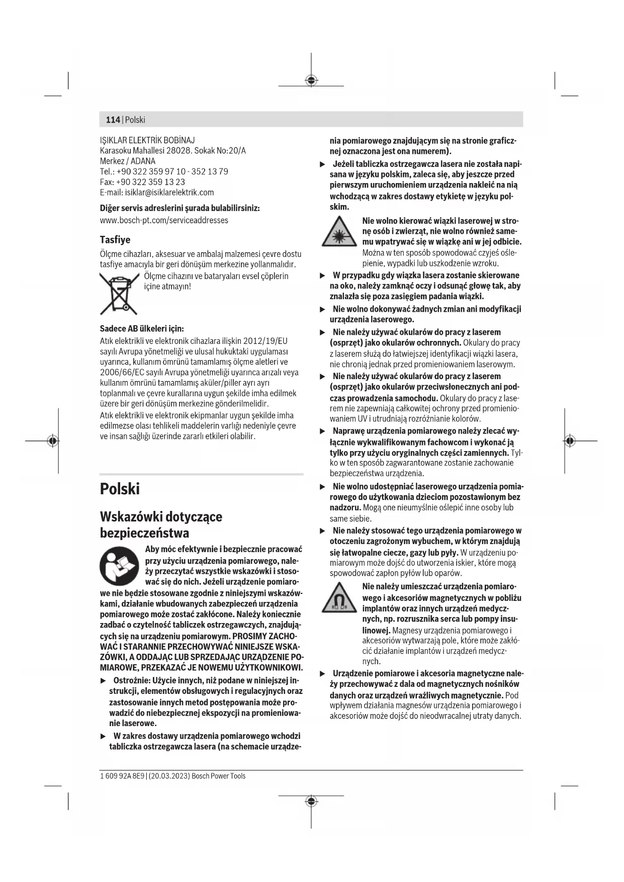 180° – Obrócić urządzenie pomiarowe o 180°. Ustawić je w taki sposób, aby środek dolnego punktu laserowego pokrywał się z zaznaczonym uprzednio punktemⅡ. Odczekać, aż urządzenie pomiarowe zakończy automatyczną niwelację. Zaznaczyć środek górnego punktu laserowego (punktⅢ). – Z różnicy d pomiędzy obydwoma zaznaczonymi punktami Ⅰ i Ⅲ wyniknie rzeczywiste odchylenie urządzenia pomia- rowego od pionu. Maksymalne dopuszczalne odchylenie obliczane jest w na- stępujący sposób: Podwójna odległość pomiędzy podłogą a sufitem ×0,7mm/m. Przykład: Przy odległości pomiędzy podłogą a sufitem 5m maksymalne odchylenie może wynosić 2×5m×±0,7mm/m=±7mm. W związku z tym punkty Ⅰ i Ⅲ mogą być od siebie oddalone maksymalnie o 7mm. Wskazówki dotyczące pracy u Do zaznaczania należy używać zawsze tylko środka punktu laserowego lub linii laserowej. Wielkość punktu laserowego oraz szerokość linii laserowej zmienia się w zależności od odległości. Bosch Power Tools 1 609 92A 8E9 | (20.03.2023)122 | Polski Praca ze statywem (osprzęt) Aby zapewnić stabilną podstawę pomiaru z ustaloną wysoko- ścią, zaleca się użycie statywu. Urządzenie pomiarowe z przyłączem do statywu 1/4" (10) założyć na gwint statywu (23) lub dowolnego statywu fotograficznego dostępnego w handlu. Do zamocowania urządzenia pomiarowego na staty- wie budowlanym dostępnym w handlu należy użyć przyłącza statywu 5/8" (11). Dokręcić urządzenie pomiarowe za po- mocą śruby ustalającej statywu. Przed włączeniem urządzenia pomiarowego, należy z grub- sza wyregulować statyw. Mocowanie za pomocą uniwersalnego uchwytu (osprzęt) (zob. rys. G) Za pomocą uniwersalnego uchwytu(19) można zamocować urządzenie pomiarowe np. na powierzchniach pionowych lub materiałach magnetycznych. Uniwersalny uchwyt można stosować również jako statyw naziemny; ułatwia on zmienia- nie położenia urządzenia pomiarowego na wysokość. u Podczas mocowania osprzętu do powierzchni należy trzymać palce z dala od tylnej strony osprzętu magne- tycznego. Duża siła przyciągania magnesówmoże spo- wodować zakleszczenie palców. Przed włączeniem urządzenia pomiarowego należy z grubsza wyregulować uniwersalny uchwyt (19). Praca z laserową tablicą celowniczą (zob. rys.G) Laserowa tablica celownicza (20) poprawia widoczność wiązki laserowej przy niekorzystnych warunkach lub więk- szych odległościach. Odblaskowa powierzchnia laserowej tablicy celowniczej(20) poprawia widoczność linii laserowej, przez transparentną powierzchnię linia laserowa jest widoczna tak- że od tyłu laserowej tablicy celowniczej. Okulary do pracy z laserem (osprzęt) Okulary do pracy z laserem odfiltrowują światło otoczenia. Dzięki temu wiązka laserowa wydaje się jaśniejsza. u Nie należy używać okularów do pracy z laserem (osprzęt) jako okularów ochronnych. Okulary do pracy z laserem służą do łatwiejszej identyfikacji wiązki lasera, nie chronią jednak przed promieniowaniem laserowym. u Nie należy używać okularów do pracy z laserem (osprzęt) jako okularów przeciwsłonecznych ani pod- czas prowadzenia samochodu. Okulary do pracy z lase- rem nie zapewniają całkowitej ochrony przed promienio- waniem UV i utrudniają rozróżnianie kolorów. Przykłady zastosowań (zob. rysB2–F2, Gi H) Przykłady różnych sposobów zastosowania urządzenia po- miarowego można znaleźć na stronach graficznych. Konserwacja i serwis Konserwacja i czyszczenie Urządzenie pomiarowe należy utrzymywać w czystości. Nie wolno zanurzać urządzenia pomiarowego w wodzie ani innych cieczach. Zanieczyszczenia należy usuwać za pomocą wilgotnej, mięk- kiej ściereczki. Nie stosować żadnych środków czyszczących ani rozpuszczalników. W szczególności należy regularnie czyścić płaszczyzny przy otworze wyjściowym wiązki laserowej, starannie usuwając kłaczki kurzu. Obsługa klienta oraz doradztwo dotyczące użytkowania Ze wszystkimi pytaniami, dotyczącymi naprawy ikonserwa- cji nabytego produktu oraz dostępu do części zamiennych, prosimy zwracać się do punktów obsługi klienta. Rysunki techniczne oraz informacje o częściach zamiennych można znaleźć pod adresem: www.bosch-pt.com Nasz zespół doradztwa dotyczącego użytkowania odpowie na wszystkie pytania związane z produktami firmy Bosch oraz ich osprzętem. Przy wszystkich zgłoszeniach oraz zamówieniach części za- miennych konieczne jest podanie 10‑cyfrowego numeru ka- talogowego, znajdującego się na tabliczce znamionowej pro- duktu. Polska Robert Bosch Sp. z o.o. Serwis Elektronarzędzi Ul. Jutrzenki 102/104 02-230 Warszawa Na www.serwisbosch.com znajdą Państwo wszystkie szcze- góły dotyczące usług serwisowych online. Tel.: 22 7154450 Faks: 22 7154440 E-Mail: bsc@pl.bosch.com www.bosch-pt.pl Pozostałe adresy serwisów znajdują się na stronie: www.bosch-pt.com/serviceaddresses Utylizacja odpadów Narzędzia pomiarowe, osprzęt i opakowanie należy oddać do powtórnego przetworzenia zgodnie zprzepisami ochrony środowiska. Nie wolno wyrzucać narzędzi pomiarowych ani baterii razem z odpadami z gospodarstwa do- mowego! Tylko dla krajów UE: Zgodnie z europejską dyrektywą 2012/19/UE w sprawie zu- żytego sprzętu elektrycznego i elektronicznego oraz jej trans- pozycją do prawa krajowego niezdatne do użytku urządzenia pomiarowe, a zgodnie z europejską dyrektywą 2006/66/WE uszkodzone lub zużyte akumulatory/baterie należy zbierać osobno i doprowadzić do ponownego użycia zgodnie z obo- wiązującymi przepisami ochrony środowiska. W przypadku nieprawidłowej utylizacji zużyty sprzęt elek- tryczny i elektroniczny może mieć szkodliwe skutki dla śro- dowiska i zdrowia ludzkiego, wynikające z potencjalnej obec- ności substancji niebezpiecznych. 1 609 92A 8E9 | (20.03.2023) Bosch Power ToolsČeština | 123 Čeština Bezpečnostní upozornění Aby byla zajištěna bezpečná
