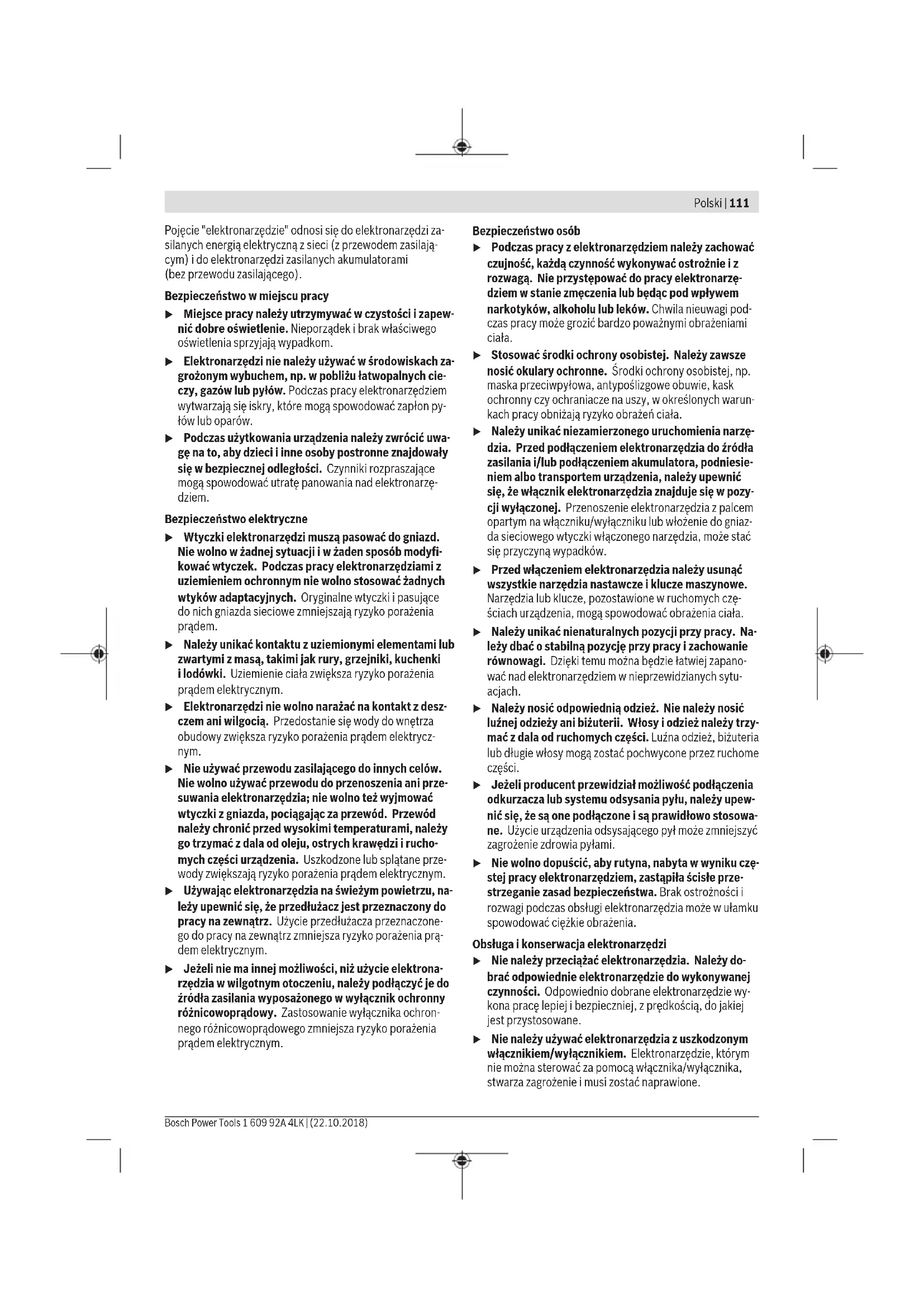 Podany w niniejszej instrukcji poziom drgań i poziom emisji hałasu zostały zmierzone zgodnie ze znormalizowaną proce- durą pomiarową i mogą zostać użyte do porównywania elek- tronarzędzi. Można ich także użyć do wstępnej oceny pozio- mu drgań i poziomu emisji hałasu. Podany poziom drgań i poziom emisji hałasu jest reprezenta- tywny dla podstawowych zastosowań elektronarzędzia. Je- żeli elektronarzędzie użyte zostanie do innych zastosowań lub z innymi narzędziami roboczymi, a także jeśli nie będzie właściwie konserwowane, poziom drgań i poziom emisji ha- łasu mogą różnić się od podanych wartości. Podane powyżej przyczyny mogą spowodować podwyższenie poziomu drgań i poziomu emisji hałasu w czasie pracy. Aby dokładnie ocenić poziom drgań i poziom emisji hałasu, należy wziąć pod uwagę także okresy, gdy urządzenie jest wyłączone lub gdy jest ono wprawdzie włączone, ale nie jest używane do pracy. Podane powyżej przyczyny mogą spowo- dować obniżenie poziomu drgań i poziomu emisji hałasu w czasie pracy. Należy wprowadzić dodatkowe środki bezpieczeństwa, ma- jące na celu ochronę osoby obsługującej przed skutkami eks- pozycji na drgania, np.: konserwacja elektronarzędzia i na- rzędzi roboczych, zapewnienie odpowiedniej temperatury, aby nie dopuścić do wyziębienia rąk, właściwa organizacja czynności wykonywanych podczas pracy. Montaż u Należy stosować tarcze, których maksymalnie dopusz- czalna prędkość jest wyższa od prędkości obrotowej elektronarzędzia bez obciążenia. Ładowanie akumulatora u Stosować należy tylko ładowarki wyszczególnione na stronach z osprzętem dodatkowym. Tylko te ładowarki dostosowane są do ładowania zastosowanego w elektro- narzędziu akumulatora litowo-jonowego. Wskazówka: W momencie dostawy akumulator jest nałado- wany częściowo. Aby zagwarantować pełną wydajność aku- mulatora, należy przed pierwszym użyciem całkowicie nała- dować akumulator w ładowarce. Akumulator litowo-jonowy można doładować w dowolnej chwili, nie powodując tym skrócenia jego żywotności. Prze- rwanie procesu ładowania nie niesie za sobą ryzyka uszko- dzenia ogniw akumulatora. Dzięki systemowi elektronicznej ochrony ogniw "Electronic Cell Protection (ECP)" akumulator litowo-jonowy jest zabez- pieczony przed głębokim rozładowaniem. W przypadku roz- ładowania akumulatora układ ochronny odłącza urządzenie: narzędzie przestaje się poruszać. Polski | 115 Bosch Power Tools 1 609 92A 4LK | (22.10.2018)116 | Polski 1 609 92A 4LK | (22.10.2018) Bosch Power Tools u Po automatycznym wyłączeniu elektronarzędzia nie naciskać ponownie włącznika/wyłącznika. Można w ten sposób uszkodzić akumulator. Przestrzegać wskazówek dotyczących utylizacji odpadów. Wyjmowanie akumulatora Akumulator (1) posiada dwa stopnie blokady, zapobiegające jego wypadnięciu w przypadku niezamierzonego naciśnięcia przycisku odblokowującego (2). Akumulator, umieszczony w obudowie elektronarzędzia, przytrzymywany jest na miejscu za pomocą sprężyny. W celu wyjęcia akumulatora (1) nacisnąć przycisk odbloko- wujący (2) i pociągnąć akumulator do tyłu, wyjmując go z elektronarzędzia. Nie należy przy tym używać siły. Wskaźnik stanu naładowania akumulatora Trzy zielone diody LED wskaźnika stanu naładowania akumu- latora (15) pokazują aktualny stan naładowania akumulatora (1). Ze względów bezpieczeństwa stan naładowania akumu- latora można skontrolować tylko przy wyłączonym elektrona- rzędziu. Nacisnąć włącznik/wyłącznik (4) do połowy, lub całkowicie, aby wyświetlić stan naładowania akumulatora. Dioda LED Pojemność Światło ciągłe, 3 zielone diody ≥ 2/3 Światło ciągłe, 2zielone diody ≥ 1/3 Światło ciągłe, 1 zielona dioda < 1/3 Światło migające, 1 zielona dioda Rezerwa Jeżeli po naciśnięciu włącznika/wyłącznika (4) żadna dioda LED się nie świeci, oznacza to, że akumulator jest uszkodzo- ny i należy go wymienić. Zakładanie/wymiana tarczy pilarskiej u Przed wszystkimi pracami przy elektronarzędziu nale- ży wyjąć akumulator. u Podczas montażu tarczy pilarskiej używać rękawic ochronnych. Przy kontakcie z tarczą pilarską istnieje nie- bezpieczeństwo zranienia. u Należy stosować wyłącznie tarcze pilarskie, których parametry są zgodne z podanymi w niniejszej instruk- cji obsługi i na elektronarzędziu, oraz takie, które zo- stały przetestowane zgodnie z wymaganiami normy EN 847-1 i są odpowiednio oznakowane. u Dopuszczalna prędkość obrotowa stosowanego narzę- dzia roboczego nie może być mniejsza niż podana na elektronarzędziu maksymalna prędkość obrotowa. Na- rzędzie robocze, obracające się z szybszą niż dopuszcza- lna prędkością, może się złamać, a jego części odprysnąć. u W żadnym wypadku nie wolno używać tarcz szlifier- skich jako narzędzi roboczych. Wybór tarczy Lista zalecanych tarcz znajduje się na końcu niniejszej in- strukcji obsługi. Demontaż tarczy (zob. rys. A) W celu wymiany narzędzia roboczego najlepiej jest położyć elektronarzędzie na przedniej części obudowy silnika. – Nacisnąć przycisk blokady wrzeciona (6) i przytrzymać w tej pozycji. u Przycisk blokady wrzeciona (6) wolno naciskać tylko przy nieruchomym wrzecionie. W przeciwnym wypadku może dojść do uszkodzenia elektronarzędzia. – Za pomocą klucza sześciokątnego (5) wykręcić śrubę mo- cującą (25), obracając ją w kierunku ➊. – Odchylić osłonę (21) i mocno ją przytrzymać. – Zdjąć kołnierz mocujący (24) i tarczę (23) z wrzeciona (20). Montaż tarczy (zob. rys. A) W celu wymiany narzędzia roboczego najlepiej jest położyć elektronarzędzie na przedniej części obudowy silnika. – Oczyścić tarczę (23) i wszystkie elementy mocujące. – Odchylić osłonę (21) i mocno ją przytrzymać. – Założyć tarczę (23) na kołnierz mocujący uchwytu (22). Kierunek 