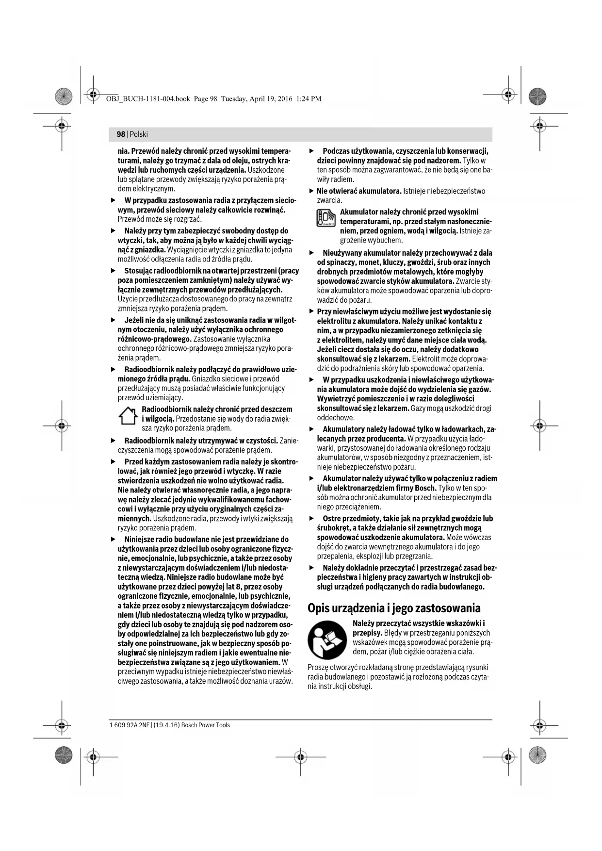 Denizli Tel.: 0258 2620666 Bulut Elektrik İstasyon Cad. No: 52/B Devlet Tiyatrosu Karşısı Elazığ Tel.: 0424 2183559 Körfez Elektrik Sanayi Çarşısı 770 Sok. No: 71 Erzincan Tel.: 0446 2230959 Nedeni Giderilmesi Şantiye radyosu işlev görmüyor Enerji beslemesi yok Şebeke bağlantı fişini veya şarj edilmiş (tam olarak) akü- yü takın Şantiye radyoyu çok sıcak ve- ya çok soğuk Şantiye radyosu işletme sı- caklığına gelinceye kadar bekleyin Şantiye radyosu akım şebekesinde işlev görmüyor Şebeke bağlantı fişi veya kab- losu arızalı Şebeke bağlantı fişini ve kab- loyu kontrol edin, gerekiyorsa değiştirin Şantiye radyosu akülü işletmede işlev görmüyor Akü kontakları kirli Akü kontaklarını temizleyin; örneğin aküyü birkaç kez ta- kıp çıkararak. Gerekiyorsa aküyü yenileyin Akü arızalı Aküyü yenileyin Akü çok sıcak veya çok soğuk (Sıcaklık uyarısı k yanıyor) Akü işletme sıcaklığına gelinceye kadar bekleyin Harici cihazların enerji beslemesi işlev görmüyor Şebeke bağlantı fişi takılı değil Şebeke bağlantı fişini (tam olarak) takın 12-V bağlantısı işlev görmüyor Sigorta 32 takılı değil Sigortayı 32 takın Sigorta 32 yanmış Sigortayı 32 değiştirin Dahili sıcaklık sigortası atmış Harici cihazı çıkarın ve soğu- mayı bekleyin Şantiye radyosu ani olarak devre dışı kalıyor Şebeke bağlantı fişi veya akü doğru olarak veya tam olarak takılı değil. Şebeke bağlantı fişini veya aküyü doğru ve tam olarak ta- kın Yazılım hatası Yazılımı resetlemek için şebe- ke bağlantı fişini veya aküyü çıkarın, 30 saniye bekleyin, şebeke bağlantı fişini veya aküyü tekrar takın. Radyo kötü çekiyor Diğer cihazlar parazit yapıyor veya radyonun bulunduğu yer uygun değil Şantiye radyosunu sinyalin daha iyi alındığı bir yere veya diğer elektronik cihazlardan veya prizlerden daha uzak bir yere yerleştirin Zaman göstergesi hatalı Saate ait tampon bataryalar boş Tampon bataryaları değiştirin Tampon bataryalar yanlış ku- tuplama ile yerleştirilmiş Tampon bataryaları doğru ku- tuplama yaparak yerleştirin OBJ_BUCH-1181-004.book Page 96 Tuesday, April 19, 2016 1:24 PMPolski | 97 Bosch Power Tools 1 609 92A 2NE | (19.4.16) Ege Elektrik İnönü Bulvaro No: 135 Muğla Makasarası Fethiye Fethiye Tel.: 0252 6145701 Değer İş Bobinaj İsmetpaşa Mah. İlk Belediye Başkan Cad. 5/C Şahinbey Gaziantep Tel.: 0342 2316432 Çözüm Bobinaj İsmetpaşa Mah. Eski Şahinbey Belediyesi altı Cad. No: 3/C Gaziantep Tel.: 0342 2319500 Onarım Bobinaj Raifpaşa Cad. No: 67 İskenderun Hatay Tel.: 0326 6137546 Günşah Otomotiv Beylikdüzü Sanayi Sit. No: 210 Beylikdüzü İstanbul Tel.: 0212 8720066 Aygem 10021 Sok. No: 11 AOSB Çiğli İzmir Tel.: 0232 3768074 Sezmen Bobinaj Ege İş Merkezi 1201/4 Sok. No: 4/B Yenişehir İzmir Tel.: 0232 4571465 Ankaralı Elektrik Eski Sanayi Bölgesi 3. Cad. No: 43 Kayseri Tel.: 0352 3364216 Asal Bobinaj Eski Sanayi Sitesi Barbaros Cad. No: 24 Samsun Tel.: 0362 2289090 Üstündağ Elektrikli Aletler Nusretiye Mah. Boyacılar Aralığı No: 9 Tekirdağ Tel.: 0282 6512884 Nakliye Alet içindeki lityum iyon (Li-Ion) aküler tehlikeli madde taşıma yönetmeliği hükümlerine tabidir. Aküler başka bir yükümlülük olmaksızın kullanıcı tarafından caddeler üzerinde taşınabilir. Üçüncü kişiler eliyle yollanma durumunda (örneğin hava yolu ile veya nakliye şirketleri ile) paketleme ve etiketlemeye ilişkin özel hükümlere uyulmalıdır. Bu nedenle gönderi paketlenir- ken bir tehlikeli madde uzmanından yardım alınmalıdır. Aküleri sadece ve ancak gövdelerinde hasar yoksa gönderin. Açık kontakları kapatın ve aküyü ambalaj içinde hareket etme- yecek biçimde paketleyin. Lütfen olası ek ulusal yönetmelik hükümlerine de uyun. Tasfiye Şantiye kadyoları, aküler, aksesuar ve ambalaj malze- mesi çevre dostu tasfiye amacıyla bir geri dönüşüm merkezine yollanmalıdır. Şantiye radyolarını ve aküleri/bataryaları evsel çöplerin içine atmayın! Sadece AB üyesi ülkeler için: 2012/19/EU sayılı Avrupa yönetmeliği uya- rınca kullanım ömrünü tamamlamış elektrikli aletleri ve 2006/66/EC sayılı Avrupa yönet- meliği uyarınca kullanım ömrünü tamamla- mış aküler/bataryalar ayrı ayrı toplanmak ve çevre dostu tasfiye amacıyla geri dönüşüm merkezine gönderilmek zorundadır. Aküler/Bataryalar: Li-Ion: Lütfen bölüm “Nakliye”, sayfa içindeki uyarılara uyun 97. Değişiklik haklarımız saklıdır. Polski Wskazówki bezpieczeństwa Należy przeczytać wszystkie wskazówki bezpieczeństwa oraz instrukcje, także te, które które znajdują się na spodzie radia budowlanego. Nieprzestrzeganie wskazówek bezpie- czeństwa i zaleceń może doprowadzić do porażenia prądem elektrycznym, pożaru i/lub poważnych obrażeń. Należy starannie przechowywać wszystkie instrukcje i wskazówki bezpieczeństwa dla dalszego zastosowania. Użyta w wskazówkach bezpieczeństwa nazwa „radio budow- lane“ stosowana jest zarówno w przypadku radia zasilanego z sieci (z przewodem sieciowym), jak i radia zasilanego akumu- latorem (bez przewodu sieciowego). Stanowisko pracy należy utrzymywać w czystości i do- brze oświetlone. Nieporządek w miejscu pracy lub nie- oświetlona przestrzeń robocza mogą być przyczyną wy- padków. Wtyczka przyłączeniowa radia musi pasować do gniazdka. Nie wolno w żaden sposób zmieniać lub prze- budowywać wtyczki. Nie wolno stosować żadnych wty- ków adapterowych wraz z wyposażonym w uziemienie ochronne radiem. Użycie oryginalnych wtyczek i pasują- cych gniazd zmniejsza ryzyko porażenia prądem. Nie wolno używać przewodu do innych czynności. Nie wolno przenosić radia, trzymając je za przewód, ani wy- ciągać wtyczki z gniazdka pociągając za przewód. Nie wolno też używać przewodu do zawieszenia urządze- OST