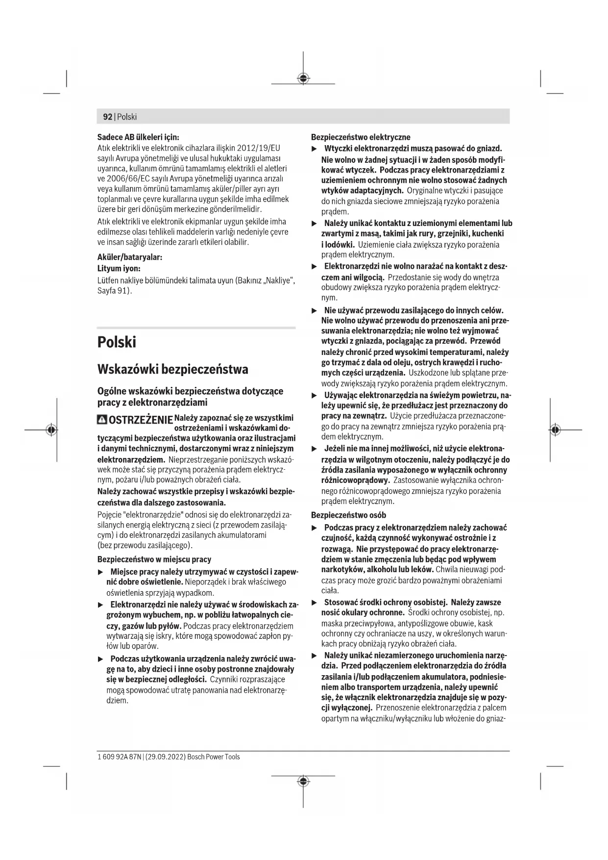 Karasoku Mahallesi 28028. Sokak No:20/A Merkez / ADANA Tel.: +903223599710 -3521379 Fax: +903223591323 E-mail: isiklar@isiklarelektrik.com Diğer servis adreslerini şurada bulabilirsiniz: www.bosch-pt.com/serviceaddresses Nakliye Önerilen Lityum İyon aküler tehlikeli madde taşıma yönetmeliği hükümlerine tabidir. Aküler başka bir yükümlülük olmaksızın kullanıcı tarafından caddeler üzerinde taşınabilir. Üçüncü kişiler eliyle yollanma durumunda (örneğin hava yolu ile veya nakliye şirketleri ile) paketleme ve etiketlemeye ilişkin özel hükümlere uyulmalıdır. Gönderi paketlenirken bir tehlikeli madde uzmanından yardım alınmalıdır. Aküleri sadece ve ancak gövdelerinde hasar yoksa gönderin. Açık kontakları kapatın ve aküyü ambalaj içinde hareket etmeyecek biçimde paketleyin. Lütfen olası ek ulusal yönetmelik hükümlerine de uyun. Tasfiye Elektrikli el aletleri, aküler, aksesuar ve ambalaj malzemesi çevre dostu tasfiye amacıyla bir geri dönüşüm merkezine yollanmalıdır. Elektrikli el aletlerini ve aküleri/bataryaları evsel çöplerin içine atmayın! Bosch Power Tools 1 609 92A 87N | (29.09.2022)92 | Polski Sadece AB ülkeleri için: Atık elektrikli ve elektronik cihazlara ilişkin 2012/19/EU sayılı Avrupa yönetmeliği ve ulusal hukuktaki uygulaması uyarınca, kullanım ömrünü tamamlamış elektrikli el aletleri ve 2006/66/EC sayılı Avrupa yönetmeliği uyarınca arızalı veya kullanım ömrünü tamamlamış aküler/piller ayrı ayrı toplanmalı ve çevre kurallarına uygun şekilde imha edilmek üzere bir geri dönüşüm merkezine gönderilmelidir. Atık elektrikli ve elektronik ekipmanlar uygun şekilde imha edilmezse olası tehlikeli maddelerin varlığı nedeniyle çevre ve insan sağlığı üzerinde zararlı etkileri olabilir. Aküler/bataryalar: Lityum iyon: Lütfen nakliye bölümündeki talimata uyun (Bakınız „Nakliye“, Sayfa91). Polski Wskazówki bezpieczeństwa Ogólne wskazówki bezpieczeństwa dotyczące pracy z elektronarzędziami OSTRZEŻENIE Należy zapoznać się ze wszystkimi ostrzeżeniami i wskazówkami do- tyczącymi bezpieczeństwa użytkowania oraz ilustracjami i danymi technicznymi, dostarczonymi wraz z niniejszym elektronarzędziem. Nieprzestrzeganie poniższych wskazó- wek może stać się przyczyną porażenia prądem elektrycz- nym, pożaru i/lub poważnych obrażeń ciała. Należy zachować wszystkie przepisy i wskazówki bezpie- czeństwa dla dalszego zastosowania. Pojęcie "elektronarzędzie" odnosi się do elektronarzędzi za- silanych energią elektryczną z sieci (z przewodem zasilają- cym) i do elektronarzędzi zasilanych akumulatorami (bezprzewodu zasilającego). Bezpieczeństwo w miejscu pracy u Miejsce pracy należy utrzymywać w czystości i zapew- nić dobre oświetlenie. Nieporządek i brak właściwego oświetlenia sprzyjają wypadkom. u Elektronarzędzi nie należy używać w środowiskach za- grożonym wybuchem, np. w pobliżu łatwopalnych cie- czy, gazów lub pyłów. Podczas pracy elektronarzędziem wytwarzają się iskry, które mogą spowodować zapłon py- łów lub oparów. u Podczas użytkowania urządzenia należy zwrócić uwa- gę na to, aby dzieci i inne osoby postronne znajdowały się w bezpiecznej odległości. Czynniki rozpraszające mogą spowodować utratę panowania nad elektronarzę- dziem. Bezpieczeństwo elektryczne u Wtyczki elektronarzędzi muszą pasować do gniazd. Nie wolno w żadnej sytuacji i w żaden sposób modyfi- kować wtyczek. Podczas pracy elektronarzędziami z uziemieniem ochronnym nie wolno stosować żadnych wtyków adaptacyjnych. Oryginalne wtyczki i pasujące do nich gniazda sieciowe zmniejszają ryzyko porażenia prądem. u Należy unikać kontaktu z uziemionymi elementami lub zwartymi z masą, takimi jak rury, grzejniki, kuchenki ilodówki. Uziemienie ciała zwiększa ryzyko porażenia prądem elektrycznym. u Elektronarzędzi nie wolno narażać na kontakt z desz- czem ani wilgocią. Przedostanie się wody do wnętrza obudowy zwiększa ryzyko porażenia prądem elektrycz- nym. u Nie używać przewodu zasilającego do innych celów. Nie wolno używać przewodu do przenoszenia ani prze- suwania elektronarzędzia; nie wolno też wyjmować wtyczki z gniazda, pociągając za przewód. Przewód należy chronić przed wysokimi temperaturami, należy go trzymać zdala od oleju, ostrych krawędzi i rucho- mych części urządzenia. Uszkodzone lub splątane prze- wody zwiększają ryzyko porażenia prądem elektrycznym. u Używając elektronarzędzia na świeżym powietrzu, na- leży upewnić się, że przedłużacz jest przeznaczony do pracy na zewnątrz. Użycie przedłużacza przeznaczone- go do pracy na zewnątrz zmniejsza ryzyko porażenia prą- dem elektrycznym. u Jeżeli nie ma innej możliwości, niż użycie elektrona- rzędzia w wilgotnym otoczeniu, należy podłączyć je do źródła zasilania wyposażonego w wyłącznik ochronny różnicowoprądowy. Zastosowanie wyłącznika ochron- nego różnicowoprądowego zmniejsza ryzyko porażenia prądem elektrycznym. Bezpieczeństwo osób u Podczas pracy z elektronarzędziem należy zachować czujność, każdą czynność wykonywać ostrożnie i z rozwagą. Nie przystępować do pracy elektronarzę- dziem w stanie zmęczenia lub będąc pod wpływem narkotyków, alkoholu lub leków. Chwila nieuwagi pod- czas pracy może grozić bardzo poważnymi obrażeniami ciała. u Stosować środki ochrony osobistej. Należy zawsze nosić okulary ochronne. Środki ochrony osobistej, np. maska przeciwpyłowa, antypoślizgowe obuwie, kask ochronny czy ochraniacze na uszy, w określonych warun- kach pracy obniżają ryzyko obrażeń ciała. u Należy unikać niezamierzonego uruchomienia narzę- dzia. Przed podłączeniem elektronarzędzia do źródła zasilania i/lub podłączeniem akumulatora, podniesie- niem albo transportem urządzenia, należy upewnić się, że włącznik elektronarzęd