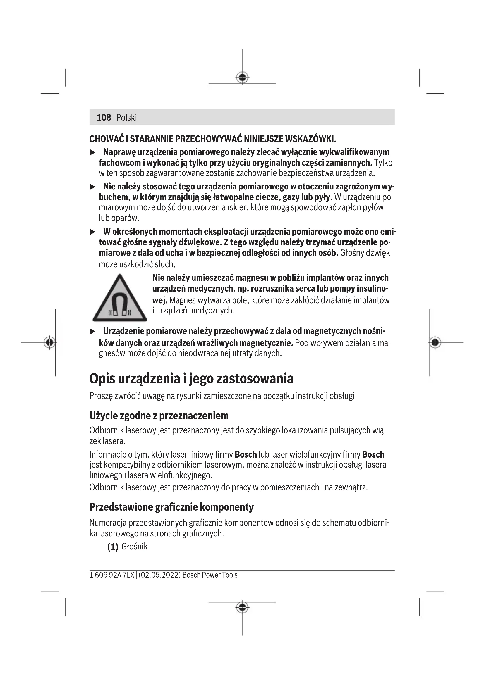 Karasoku Mahallesi 28028. Sokak No:20/A Merkez / ADANA Tel.: +903223599710 -3521379 Fax: +903223591323 E-mail: isiklar@isiklarelektrik.com Diğer servis adreslerini şurada bulabilirsiniz: www.bosch-pt.com/serviceaddresses Tasfiye Lazer alıcısı, aksesuar ve ambalaj malzemesi çevre dostu yeniden kazanım merkezine yollanmalıdır. Lazer alıcısını ve aküleri evsel çöplerin içine atmayın! Sadece AB ülkeleri için: Atık elektrikli ve elektronik cihazlara ilişkin 2012/19/EU sayılı Avrupa yönetmeliği ve ulusal hukuktaki uygulaması uyarınca, kullanım ömrünü tamamlamış lazer alıcılar ve 2006/66/EC sayılı Avrupa yönetmeliği uyarınca arızalı veya kullanım ömrünü tamamlamış aküler/piller ayrı ayrı toplanmalı ve çevre kurallarına uygun şekilde imha edilmek üzere bir geri dönüşüm merkezine gönderilmelidir. Atık elektrikli ve elektronik ekipmanlar uygun şekilde imha edilmezse olası tehlikeli maddelerin varlığı nedeniyle çevre ve insan sağlığı üzerinde zararlı etkileri olabilir. Polski Wskazówki dotyczące bezpieczeństwa Należy przeczytać wszystkie wskazówki i stosować się do nich. Jeżeli urządzenie pomiarowe nie będzie stosowane zgodnie z ni- niejszymi wskazówkami, działanie wbudowanych zabezpieczeń urządzenia pomiarowego może zostać zakłócone. PROSIMY ZA- Bosch Power Tools 1 609 92A 7LX | (02.05.2022)108 | Polski CHOWAĆ I STARANNIE PRZECHOWYWAĆ NINIEJSZE WSKAZÓWKI. u Naprawę urządzenia pomiarowego należy zlecać wyłącznie wykwalifikowanym fachowcom i wykonać ją tylko przy użyciu oryginalnych części zamiennych. Tylko w ten sposób zagwarantowane zostanie zachowanie bezpieczeństwa urządzenia. u Nie należy stosować tego urządzenia pomiarowego w otoczeniu zagrożonym wy- buchem, wktórym znajdują się łatwopalne ciecze, gazy lub pyły. W urządzeniu po- miarowym może dojść do utworzenia iskier, które mogą spowodować zapłon pyłów lub oparów. u W określonych momentach eksploatacji urządzenia pomiarowego może ono emi- tować głośne sygnały dźwiękowe. Z tego względu należy trzymać urządzenie po- miarowe z dala od ucha i w bezpiecznej odległości od innych osób. Głośny dźwięk może uszkodzić słuch. Nie należy umieszczać magnesu w pobliżu implantów oraz innych urządzeń medycznych, np. rozrusznika serca lub pompy insulino- wej. Magneswytwarza pole, które może zakłócić działanie implantów i urządzeń medycznych. u Urządzenie pomiarowe należy przechowywać z dala od magnetycznych nośni- ków danych oraz urządzeń wrażliwych magnetycznie. Pod wpływem działania ma- gnesów może dojść do nieodwracalnej utraty danych. Opis urządzenia i jego zastosowania Proszę zwrócić uwagę na rysunki zamieszczone na początku instrukcji obsługi. Użycie zgodne z przeznaczeniem Odbiornik laserowy jest przeznaczony jest do szybkiego lokalizowania pulsujących wią- zek lasera. Informacje o tym, który laser liniowy firmyBosch lub laser wielofunkcyjny firmyBosch jest kompatybilny z odbiornikiem laserowym, można znaleźć w instrukcji obsługi lasera liniowego i lasera wielofunkcyjnego. Odbiornik laserowy jest przeznaczony do pracy w pomieszczeniach i na zewnątrz. Przedstawione graficznie komponenty Numeracja przedstawionych graficznie komponentów odnosi się do schematu odbiorni- ka laserowego na stronach graficznych. (1) Głośnik 1 609 92A 7LX | (02.05.2022) Bosch Power ToolsPolski | 109 (2) Przycisk ustawiania dokładności odbioru (3) Włącznik/wyłącznik (4) Przycisk sygnału dźwiękowego (5) Pole odbiorcze wiązki lasera (6) Wyświetlacz (7) Magnesy (8) Rowek prowadzący dla uchwytu (9) Wskaźnik LED kierunku „wiązka lasera poniżej linii środkowej” (10) Znacznik środka (11) Wskaźnik LED kierunku „wiązka lasera powyżej linii środkowej” (12) Numer seryjny (13) Pokrywka wnęki na baterie (14) Blokada pokrywki wnęki na baterie (15) Wskaźnik LED linii środkowej (z tyłu) (16) Uchwyt