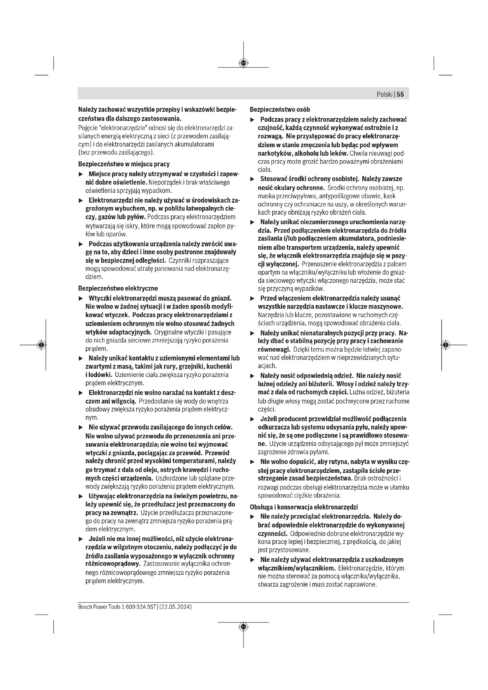Karasoku Mahallesi 28028. Sokak No:20/A Merkez / ADANA Tel.: +903223599710 -3521379 Fax: +903223591323 E-mail: isiklar@isiklarelektrik.com Diğer servis adreslerini şurada bulabilirsiniz: www.bosch-pt.com/serviceaddresses Tasfiye Elektrikli el aleti, aksesuar ve ambalaj malzemesi çevre dostu bir yöntemle tasfiye edilmek üzere tekrar kazanım merkezine gönderilmelidir. Elektrikli el aletlerini evsel çöplerin içine atmayın! Sadece AB ülkeleri için: Artık kullanılmayan elektrikli el aletleri ayrı olarak imha edilmelidir. Belirtilen toplama sistemlerini kullanın. Atık elektrikli ve elektronik ekipmanlar uygun şekilde imha edilmezse olası tehlikeli maddelerin varlığı nedeniyle çevre ve insan sağlığı üzerinde zararlı etkileri olabilir. Polski Wskazówki bezpieczeństwa Ogólne wskazówki bezpieczeństwa dotyczące pracy z elektronarzędziami OSTRZEŻENIE Należy zapoznać się ze wszystkimi ostrzeżeniami i wskazówkami do- tyczącymi bezpieczeństwa użytkowania oraz ilustracjami i danymi technicznymi, dostarczonymi wraz z niniejszym elektronarzędziem. Nieprzestrzeganie poniższych wskazó- wek może stać się przyczyną porażenia prądem elektrycz- nym, pożaru i/lub poważnych obrażeń ciała. 1 609 92A 9ST | (22.05.2024) Bosch Power ToolsPolski | 55 Należy zachować wszystkie przepisy i wskazówki bezpie- czeństwa dla dalszego zastosowania. Pojęcie "elektronarzędzie" odnosi się do elektronarzędzi za- silanych energią elektryczną z sieci (z przewodem zasilają- cym) i do elektronarzędzi zasilanych akumulatorami (bezprzewodu zasilającego). Bezpieczeństwo w miejscu pracy u Miejsce pracy należy utrzymywać w czystości i zapew- nić dobre oświetlenie. Nieporządek i brak właściwego oświetlenia sprzyjają wypadkom. u Elektronarzędzi nie należy używać w środowiskach za- grożonym wybuchem, np. w pobliżu łatwopalnych cie- czy, gazów lub pyłów. Podczas pracy elektronarzędziem wytwarzają się iskry, które mogą spowodować zapłon py- łów lub oparów. u Podczas użytkowania urządzenia należy zwrócić uwa- gę na to, aby dzieci i inne osoby postronne znajdowały się w bezpiecznej odległości. Czynniki rozpraszające mogą spowodować utratę panowania nad elektronarzę- dziem. Bezpieczeństwo elektryczne u Wtyczki elektronarzędzi muszą pasować do gniazd. Nie wolno w żadnej sytuacji i w żaden sposób modyfi- kować wtyczek. Podczas pracy elektronarzędziami z uziemieniem ochronnym nie wolno stosować żadnych wtyków adaptacyjnych. Oryginalne wtyczki i pasujące do nich gniazda sieciowe zmniejszają ryzyko porażenia prądem. u Należy unikać kontaktu z uziemionymi elementami lub zwartymi z masą, takimi jak rury, grzejniki, kuchenki ilodówki. Uziemienie ciała zwiększa ryzyko porażenia prądem elektrycznym. u Elektronarzędzi nie wolno narażać na kontakt z desz- czem ani wilgocią. Przedostanie się wody do wnętrza obudowy zwiększa ryzyko porażenia prądem elektrycz- nym. u Nie używać przewodu zasilającego do innych celów. Nie wolno używać przewodu do przenoszenia ani prze- suwania elektronarzędzia; nie wolno też wyjmować wtyczki z gniazda, pociągając za przewód. Przewód należy chronić przed wysokimi temperaturami, należy go trzymać zdala od oleju, ostrych krawędzi i rucho- mych części urządzenia. Uszkodzone lub splątane prze- wody zwiększają ryzyko porażenia prądem elektrycznym. u Używając elektronarzędzia na świeżym powietrzu, na- leży upewnić się, że przedłużacz jest przeznaczony do pracy na zewnątrz. Użycie przedłużacza przeznaczone- go do pracy na zewnątrz zmniejsza ryzyko porażenia prą- dem elektrycznym. u Jeżeli nie ma innej możliwości, niż użycie elektrona- rzędzia w wilgotnym otoczeniu, należy podłączyć je do źródła zasilania wyposażonego w wyłącznik ochronny różnicowoprądowy. Zastosowanie wyłącznika ochron- nego różnicowoprądowego zmniejsza ryzyko porażenia prądem elektrycznym. Bezpieczeństwo osób u Podczas pracy z elektronarzędziem należy zachować czujność, każdą czynność wykonywać ostrożnie i z rozwagą. Nie przystępować do pracy elektronarzę- dziem w stanie zmęczenia lub będąc pod wpływem narkotyków, alkoholu lub leków. Chwila nieuwagi pod- czas pracy może grozić bardzo poważnymi obrażeniami ciała. u Stosować środki ochrony osobistej. Należy zawsze nosić okulary ochronne. Środki ochrony osobistej, np. maska przeciwpyłowa, antypoślizgowe obuwie, kask ochronny czy ochraniacze na uszy, w określonych warun- kach pracy obniżają ryzyko obrażeń ciała. u Należy unikać niezamierzonego uruchomienia narzę- dzia. Przed podłączeniem elektronarzędzia do źródła zasilania i/lub podłączeniem akumulatora, podniesie- niem albo transportem urządzenia, należy upewnić się, że włącznik elektronarzędzia znajduje się w pozy- cji wyłączonej. Przenoszenie elektronarzędzia z palcem opartym na włączniku/wyłączniku lub włożenie do gniaz- da sieciowego wtyczki włączonego narzędzia, może stać się przyczyną wypadków. u Przed włączeniem elektronarzędzia należy usunąć wszystkie narzędzia nastawcze i klucze maszynowe. Narzędzia lub klucze, pozostawione wruchomych czę- ściach urządzenia, mogą spowodować obrażenia ciała. u Należy unikać nienaturalnych pozycji przy pracy. Na- leży dbać o stabilną pozycję przy pracy i zachowanie równowagi. Dzięki temu można będzie łatwiej zapano- wać nad elektronarzędziem w nieprzewidzianych sytu- acjach. u Należy nosić odpowiednią odzież. Nie należy nosić luźnej odzieży ani biżuterii. Włosy i odzież należy trzy- mać z dala od ruchomych części. Luźna odzież, biżuteria lub długie włosy mogą zostać pochwycone przez ruchome części. u Jeżeli producent przewidział możliwość podłączenia odkurzacza lub systemu odsysania pyłu, należy upew- nić się, że są one podłączone i są prawidłowo stosowa- ne. Użycie ur