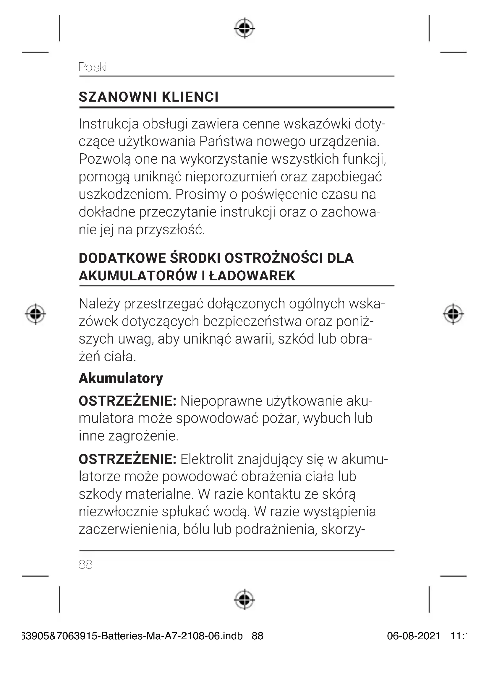 Należy przestrzegać dołączonych ogólnych wska- zówek dotyczących bezpieczeństwa oraz poniż- szych uwag, aby uniknąć awarii, szkód lub obra- żeń ciała. Akumulatory OSTRZEŻENIE: Niepoprawne użytkowanie aku- mulatora może spowodować pożar, wybuch lub inne zagrożenie. OSTRZEŻENIE: Elektrolit znajdujący się w akumu- latorze może powodować obrażenia ciała lub szkody materialne. W razie kontaktu ze skórą niezwłocznie spłukać wodą. W razie wystąpienia zaczerwienienia, bólu lub podrażnienia, skorzy- 7063905&7063915-Batteries-Ma-A7-2108-06.indb 887063905&7063915-Batteries-Ma-A7-2108-06.indb 88 06-08-2021 11:1806-08-2021 11:1889 Polski