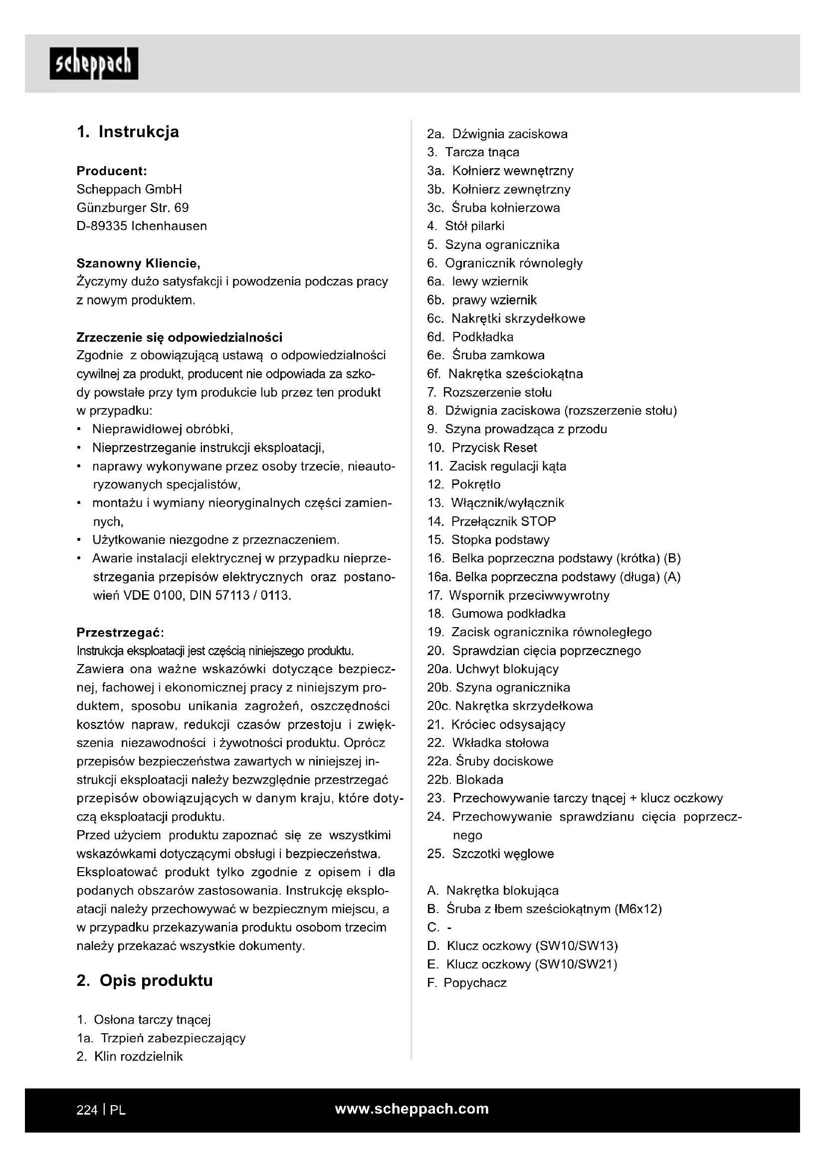 Producent: Scheppach GmbH Günzburger Str. 69 D-89335 Ichenhausen Szanowny Kliencie, Życzymy dużo satysfakcji i powodzenia podczas pracy z nowym produktem. Zrzeczenie się odpowiedzialności Zgodnie z obowiązującą ustawą o odpowiedzialności cywilnej za produkt, producent nie odpowiada za szko- dy powstałe przy tym produkcie lub przez ten produkt w przypadku: