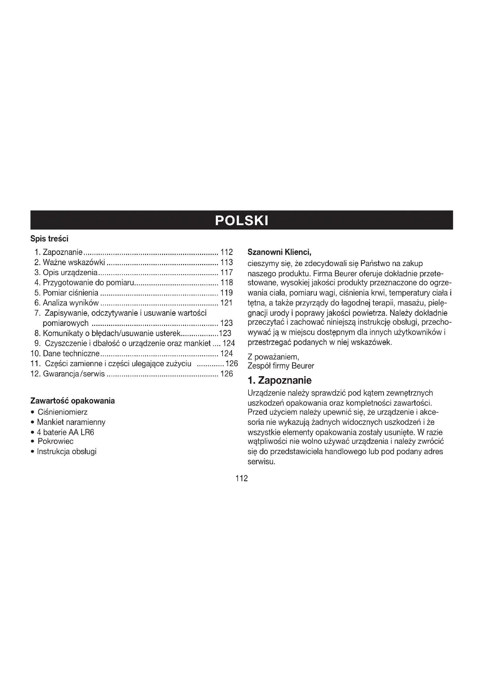 Firma Beurer GmbH, Söflinger Straße 218, D-89077 Ulm (zwana dalej „Beurer”) udziela gwarancji na ten produkt na następujących warunkach i w poniżej opisanym zakresie. Poniższe warunki gwarancji nie naruszają usta- wowych zobowiązań gwarancyjnych sprzedającego wynikających z umowy kupna zawartej z kupującym. Gwarancja obowiązuje również w sposób nienaruszający bezwzględnie obowiązujących prze- pisów dot. odpowiedzialności. Firma Beurer gwarantuje bezawaryjne działanie oraz kompletność niniejszego produktu. Obowiązujący na całym świecie okres gwarancji obejmuje 3 lata/lat, licząc od zakupu nowego, nieużywanego produktu przez kupującego. Niniejsza gwarancja dotyczy tylko produktów nabytych przez kupującego jako konsumenta wyłącznie w celach pry- watnych w ramach użytku domowego. Obowiązuje prawo niemieckie o ile jest to prawnie dopus- zczalne. Jeśli w okresie obowiązywania gwarancji produkt zostanie uznany za niekompletny lub wadliwy w działaniu zgodnie z poniższymi postanowieniami, firma Beurer bezpłatnie wymieni go lub naprawi zgodnie z niniejszymi warunkami gwarancji. Jeśli kupujący chce zgłosić reklamację gwarancyjną, najpierw kontaktuje się z lokalnym dealerem: patrz załączona lista „Service International” z adresami ser- wisowymi. Następnie kupujący otrzymuje dalsze informacje dot. rozpa- trywania reklamacji gwarancyjnej, np. gdzie wysłać produkt i jakie dokumenty są wymagane127 Roszczenie z tytułu gwarancji będzie rozpatrywane tylko wtedy, gdy kupujący może przedłożyć – kopię faktury/paragon zakupu oraz – oryginalny produkt firmie Beurer lub autoryzowanemu partnerowi firmy Beurer. Niniejsza gwarancja wyraźnie nie obejmuje: – zużycia wynikającego z normalnego użytkowania lub zużywania się produktu; – dostarczanych z tym produktem akcesoriów, które zużywają się lub ulegają zużyciu podczas prawidłowego użytkowania (np. baterii, akumulatorów, mankietów, us- zczelek, elektrod, źródeł światła, nakładek i akcesoriów inhalatora); – produktów, które były używane, czyszczone, przechow- ywane lub konserwowane w niewłaściwy sposób i/lub niezgodnie z treścią instrukcji obsługi, a także produk- tów, które zostały otwarte, naprawione lub zmodyfiko- wane przez kupującego lub centrum serwisowe nieauto- ryzowane przez firmę Beurer; – uszkodzeń powstałych podczas transportu między pro- ducentem a klientem lub między centrum serwisowym a klientem; – produktów, które zostały zakupione jako artykuły grupy B („B-Ware”) lub jako artykuły używane; – szkód następczych, które wynikają z wady tego produktu (w tym przypadku mogą jednak istnieć roszczenia z tytułu odpowiedzialności za produkt lub wynikające z innych bezwzględnie obowiązujących przepisów prawa dot. odpowiedzialności). Naprawy lub całkowita wymiana w żadnym wypadku nie przedłużają okresu gwarancji. Prawo do pomyłek i zmian zastrzeżone128