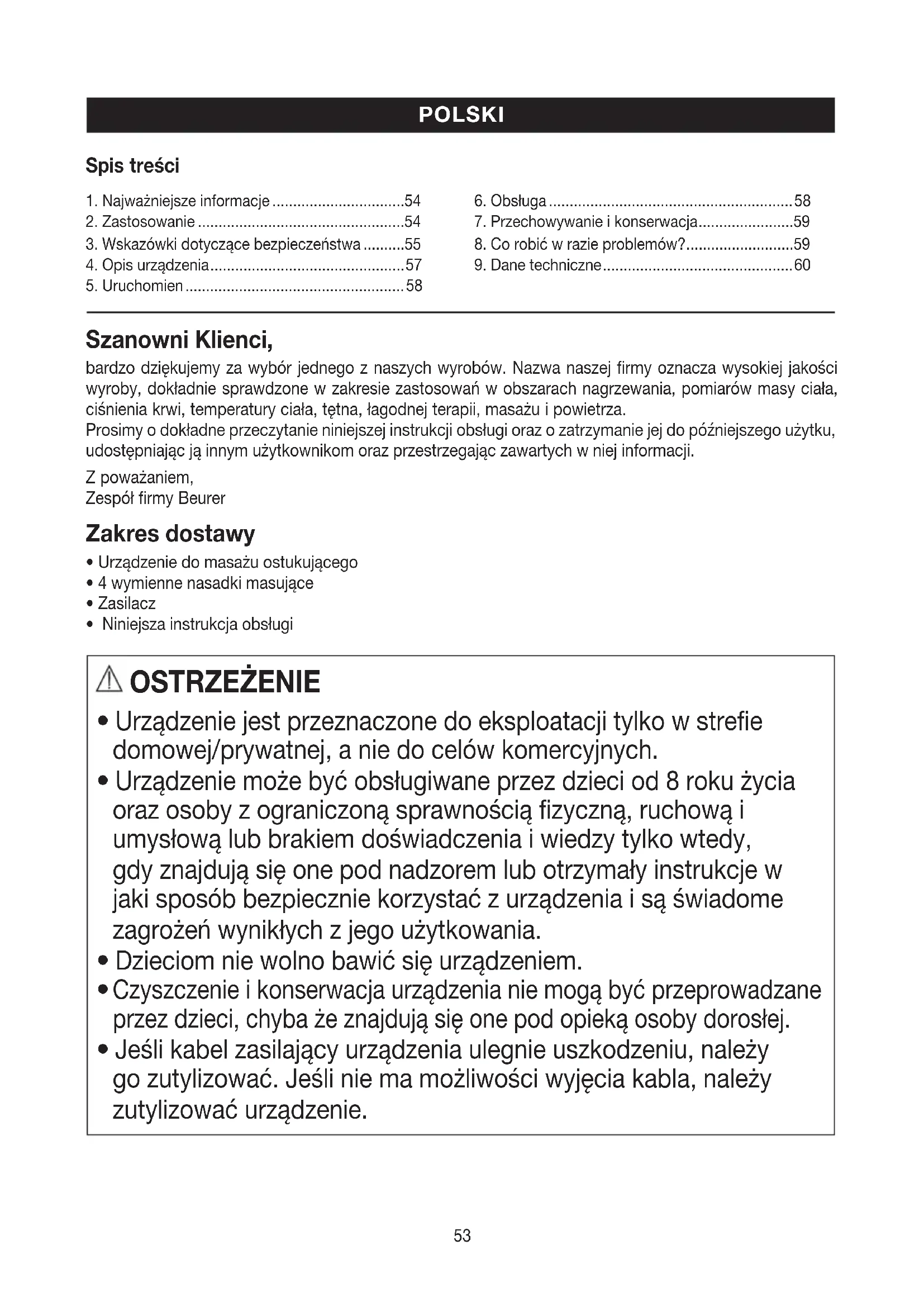 Należy przeczytać starannie instrukcję obsługi! Niezastosowanie się do poniższych wskazówek może spowo- dować szkody rzeczowe i osobowe. Należy przechowywać niniejszą instrukcję obsługi i udostępniać ją także innym użytkownikom. Przy odstąpieniu urządzenia przekazać niniejszą instrukcję obsługi wraz z urządzeniem. OSTRZEŻENIE Trzymać z dala od dzieci opakowanie. Niebezpieczeństwo uduszenia się. Porażenie prądem OSTRZEŻENIE Aby uniknąć ryzyka porażenia prądem, urządzenia do masażu należy używać - jak każdego innego urządzenia elektrycznego - z zachowaniem należytej ostrożności. Z tego względu eksploatacja urządzenia powinna odbywać się w następujących warunkach: