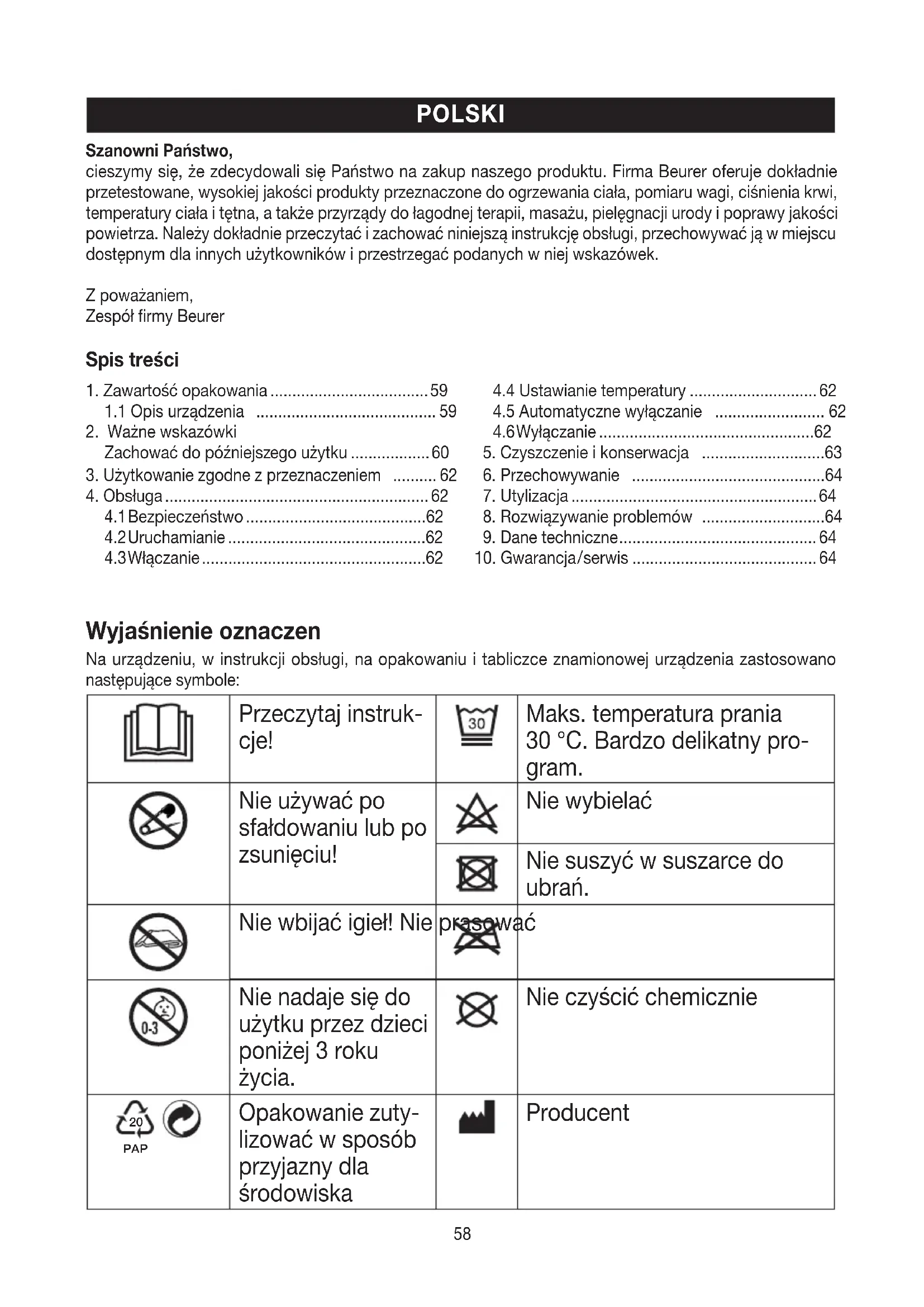 PAP Opakowanie zuty- lizować w sposób przyjazny dla środowiska Producent Szanowni Państwo, cieszymy się, że zdecydowali się Państwo na zakup naszego produktu. Firma Beurer oferuje dokładnie przetestowane, wysokiej jakości produkty przeznaczone do ogrzewania ciała, pomiaru wagi, ciśnienia krwi, temperatury ciała i tętna, a także przyrządy do łagodnej terapii, masażu, pielęgnacji urody i poprawy jakości powietrza. Należy dokładnie przeczytać i zachować niniejszą instrukcję obsługi, przechowywać ją w miejscu dostępnym dla innych użytkowników i przestrzegać podanych w niej wskazówek. Z poważaniem, Zespół firmy Beurer59 Niniejszy produkt spełnia wymagania obowiązujących dyrektyw europej