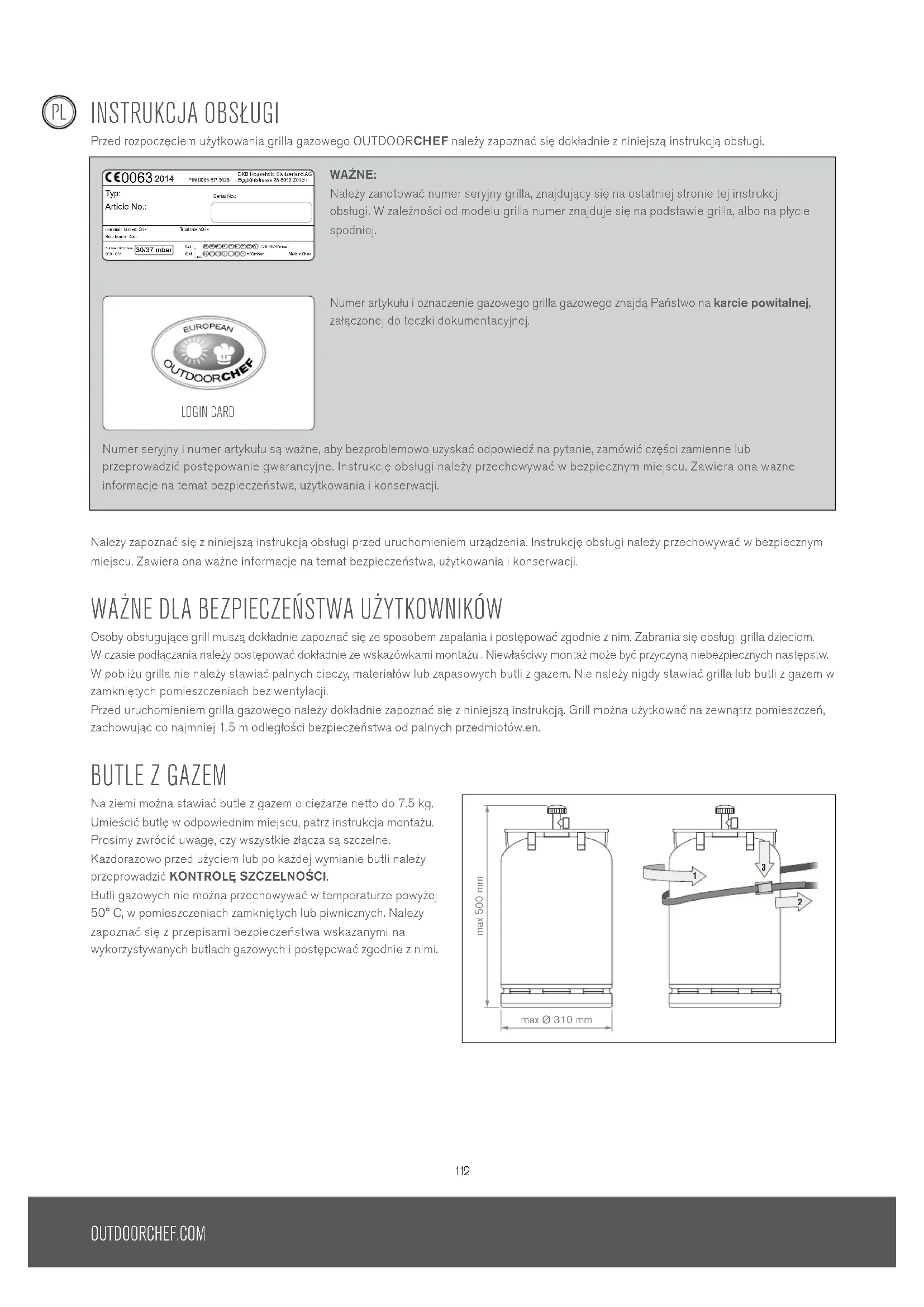 INSTRUKCjA OBSłUGI Przed rozpoczęciem użytkowania grilla gazowego OUTDOORCHEF należy zapoznać się dokładnie z niniejszą instrukcją obsługi. Należy zapoznać się z niniejszą instrukcją obsługi przed uruchomieniem urządzenia. Instrukcję obsługi należy przechowywać w bezpiecznym miejscu. Zawiera ona ważne informacje na temat bezpieczeństwa, użytkowania i konserwacji. wAżNE DLA BEzPIECzEńSTwA UżyTKOwNIKÓw Osoby obsługujące grill muszą dokładnie zapoznać się ze sposobem zapalania i postępować zgodnie z nim. Zabrania się obsługi grilla dzieciom. W czasie podłączania należy postępować dokładnie ze wskazówkami montażu . Niewłaściwy montaż może być przyczyną niebezpiecznych następstw. W pobliżu grilla nie należy stawiać palnych cieczy, materiałów lub zapasowych butli z gazem. Nie należy nigdy stawiać grilla lub butli z gazem w zamkniętych pomieszczeniach bez wentylacji. Przed uruchomieniem grilla gazowego należy dokładnie zapoznać się z niniejszą instrukcją. Grill można użytkować na zewnątrz pomieszczeń, zachowując co najmniej 1.5 m odległości bezpieczeństwa od palnych przedmiotów.en. BUTLE z GAzEM Na ziemi można stawiać butle z gazem o ciężarze netto do 7.5 kg. Umieścić butlę w odpowiednim miejscu, patrz instrukcja montażu. Prosimy zwrócić uwagę, czy wszystkie złącza są szczelne. Każdorazowo przed użyciem lub po każdej wymianie butli należy przeprowadzić KONTROLĘ SZCZELNOŚCI. Butli gazowych nie można przechowywać w temperaturze powyżej 50° C, w pomieszczeniach zamkniętych lub piwnicznych. Należy zapoznać się z przepisami bezpieczeństwa wskazanymi na wykorzystywanych butlach gazowych i postępować zgodnie z nimi. max 500 mm max Ø 310 mm