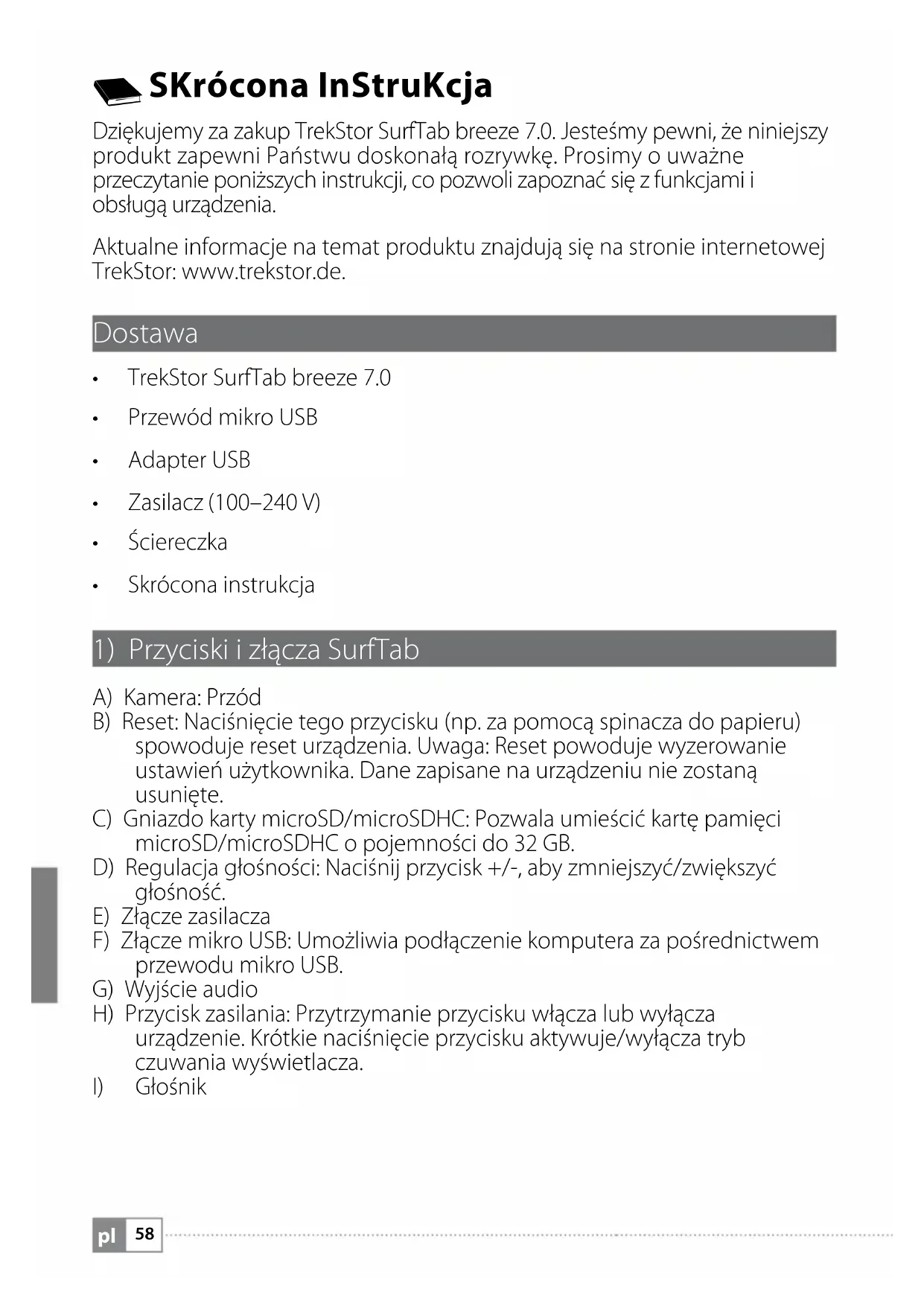SKrócona InStruKcja Dziękujemy za zakup TrekStor SurfTab breeze 7.0. Jesteśmy pewni, że niniejszy produkt zapewni Państwu doskonałą rozrywkę. Prosimy o uważne przeczytanie poniższych instrukcji, co pozwoli zapoznać się z funkcjami i obsługą urządzenia. Aktualne informacje na temat produktu znajdują się na stronie internetowej TrekStor: www.trekstor.de. Dostawa