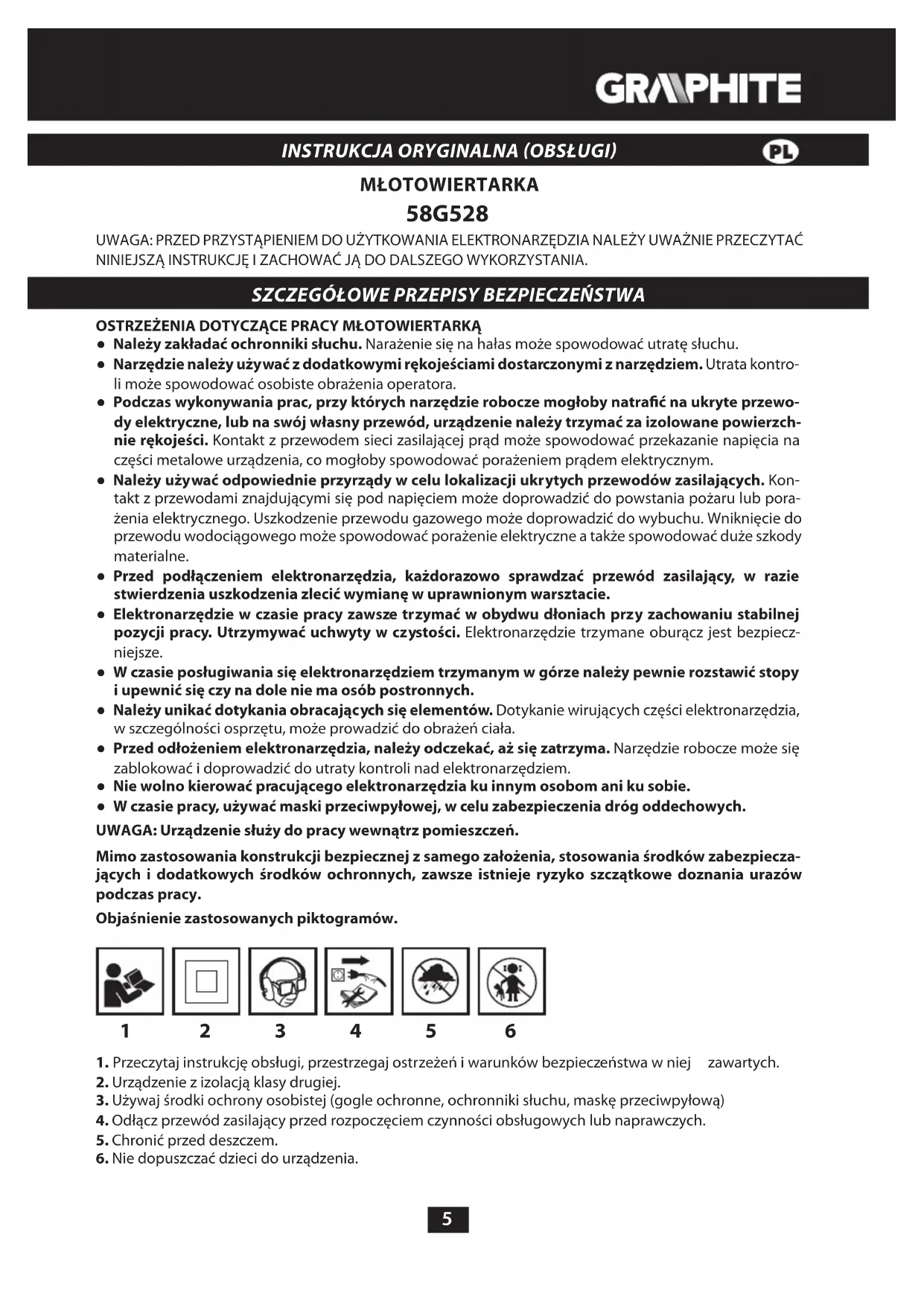 OSTRZEŻENIA DOTYCZĄCE PRACY MŁOTOWIERTARKĄ ● Należy zakładać ochronniki słuchu. Narażenie się na hałas może spowodować utratę słuchu. ● Narzędzie należy używać z dodatkowymi rękojeściami dostarczonymi z narzędziem. Utrata kontro- li może spowodować osobiste obrażenia operatora. ● Podczas wykonywania prac, przy których narzędzie robocze mogłoby natrać na ukryte przewo- dy elektryczne, lub na swój własny przewód, urządzenie należy trzymać za izolowane powierzch- nie rękojeści. Kontakt z przewodem sieci zasilającej prąd może spowodować przekazanie napięcia na części metalowe urządzenia, co mogłoby spowodować porażeniem prądem elektrycznym. ● Należy używać odpowiednie przyrządy w celu lokalizacji ukrytych przewodów zasilających. Kon- takt z przewodami znajdującymi się pod napięciem może doprowadzić do powstania pożaru lub pora- żenia elektrycznego. Uszkodzenie przewodu gazowego może doprowadzić do wybuchu. Wniknięcie do przewodu wodociągowego może spowodować porażenie elektryczne a także spowodować duże szkody materialne. ● Przed podłączeniem elektronarzędzia, każdorazowo sprawdzać przewód zasilający, w razie stwierdzenia uszkodzenia zlecić wymianę w uprawnionym warsztacie. ● Elektronarzędzie w czasie pracy zawsze trzymać w obydwu dłoniach przy zachowaniu stabilnej pozycji pracy. Utrzymywać uchwyty w czystości. Elektronarzędzie trzymane oburącz jest bezpiecz- niejsze. ● W czasie posługiwania się elektronarzędziem trzymanym w górze należy pewnie rozstawić stopy i upewnić się czy na dole nie ma osób postronnych. ● Należy unikać dotykania obracających się elementów. Dotykanie wirujących części elektronarzędzia, w szczególności osprzętu, może prowadzić do obrażeń ciała. ● Przed odłożeniem elektronarzędzia, należy odczekać, aż się zatrzyma. Narzędzie robocze może się zablokować i doprowadzić do utraty kontroli nad elektronarzędziem. ● Nie wolno kierować pracującego elektronarzędzia ku innym osobom ani ku sobie. ● W czasie pracy, używać maski przeciwpyłowej, w celu zabezpieczenia dróg oddechowych. UWAGA: Urządzenie służy do pracy wewnątrz pomieszczeń. Mimo zastosowania konstrukcji bezpiecznej z samego założenia, stosowania środków zabezpiecza- jących i dodatkowych środków ochronnych, zawsze istnieje ryzyko szczątkowe doznania urazów podczas pracy. Objaśnienie zastosowanych piktogramów.