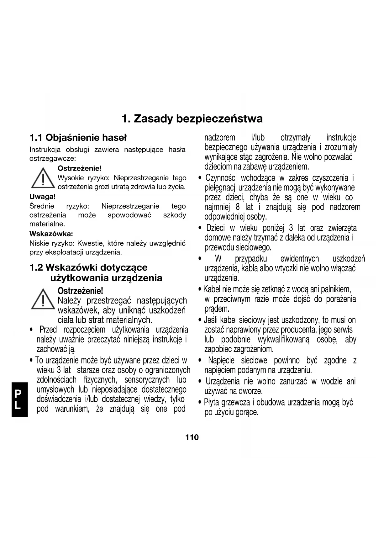 Instrukcja obsługi zawiera następujące hasła ostrzegawcze: Ostrzeżenie! Wysokie ryzyko: Nieprzestrzeganie tego ostrzeżenia grozi utratą zdrowia lub życia. Uwaga! Średnie ryzyko: Nieprzestrzeganie tego ostrzeżenia może spowodować szkody materialne. Wskazówka: Niskie ryzyko: Kwestie, które należy uwzględnić przy eksploatacji urządzenia.