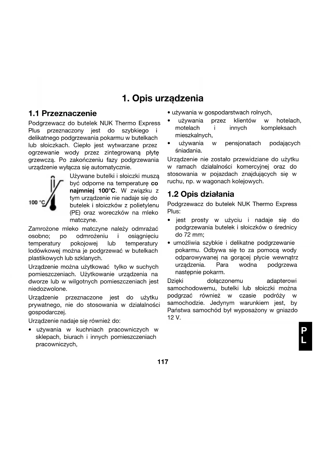 Podgrzewacz do butelek NUK Thermo Express Plus przeznaczony jest do szybkiego i delikatnego podgrzewania pokarmu w butelkach lub słoiczkach. Ciepło jest wytwarzane przez ogrzewanie wody przez zintegrowaną płytę grzewczą. Po zakończeniu fazy podgrzewania urządzenie wyłącza się automatycznie. Używane butelki i słoiczki muszą być odporne na temperaturę co najmniej 100°C. W związku z tym urządzenie nie nadaje się do butelek i słoiczków z polietylenu (PE) oraz woreczków na mleko matczyne. Zamrożone mleko matczyne należy odmrażać osobno; po odmrożeniu i osiągnięciu temperatury pokojowej lub temperatury lodówkowej można je podgrzewać w butelkach plastikowych lub szklanych. Urządzenie można użytkować tylko w suchych pomieszczeniach. Użytkowanie urządzenia na dworze lub w wilgotnych pomieszczeniach jest niedozwolone. Urządzenie przeznaczone jest do użytku prywatnego, nie do stosowania w działalności gospodarczej. Urządzenie nadaje się również do: