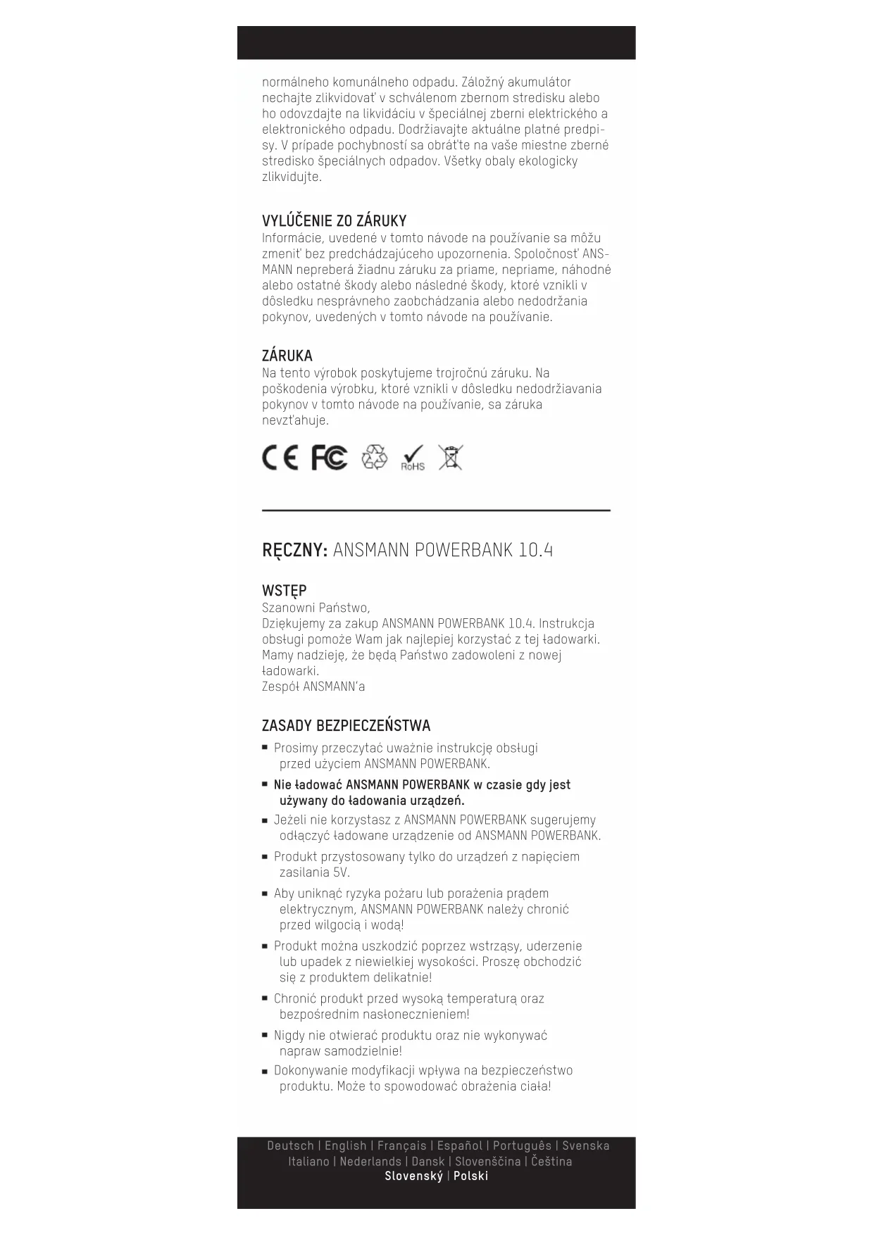 - Abyunikac rzyka pozarub lub porazenia pradem elektrycznym, ANSMANN POWERBANK nalezy chronico przy得住 wilgocia i woda!