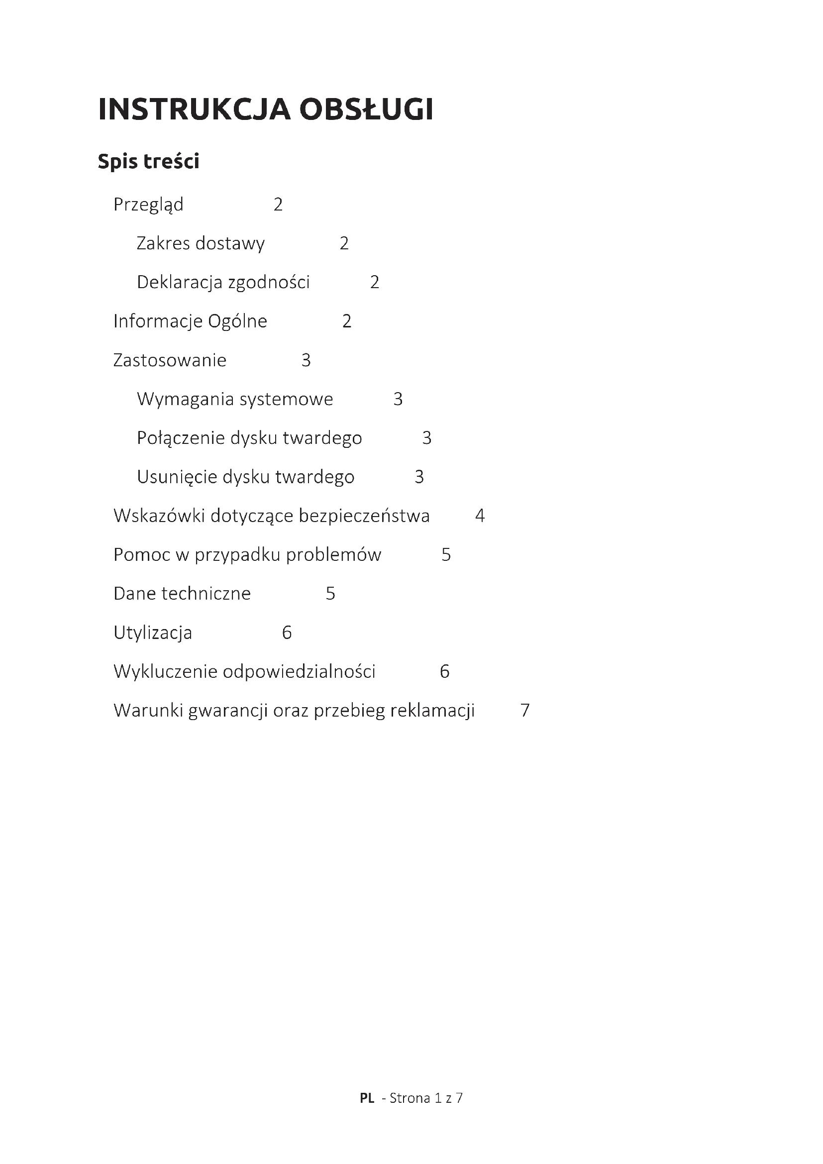 Service Center (Vaš RMA-br.) Kopernikusstraße 12-14 D-49377 Vechta Kontakt: E-pošta (tehnička podrška): support@intenso-internaonal.de E-pošta (RMA-broj): rma@intenso-internaonal.de Internetska stranica: www.intenso-internaonal.de Servisna dežurna linija: +49 (0) 900 –1 50 40 30 (0,39 € / min. unutar njemačke ksne mreže. Cijene mobilne mreže mogu odstupa od navedenog.) Postupak reklamacijeINSTRUKCJA OBSŁUGI PL - Strona 1 z 7 Spis treści Przegląd 2 Zakresdostawy 2 Deklaracjazgodności 2 InformacjeOgólne 2 Zastosowanie 3 Wymaganiasystemowe 3 Połączeniedyskutwardego 3 Usunięciedyskutwardego 3 Wskazówkidotyczącebezpieczeństwa 4 Pomocwprzypadkuproblemów 5 Danetechniczne 5 Utylizacja 6 Wykluczenieodpowiedzialności 6 Warunkigwarancjiorazprzebiegreklamacji 7PL -Strona2z7 Proszędokładniezapoznaćsięzniniejsząinstrukcjąobsługiiprzestrzegaćwszystkich zamieszczonychwniejwskazówek,abyzapewnićdługątrwałośćorazniezawodnąeksploatację urządzenia.Instrukcjęprzechowywaćwtakimmiejscu,abymożnabyłozniejzawszeskorzystać; proszęprzekazaćjąkolejnymużytkownikomurządzenia. Informacje odnośnie niniejszej instrukcji