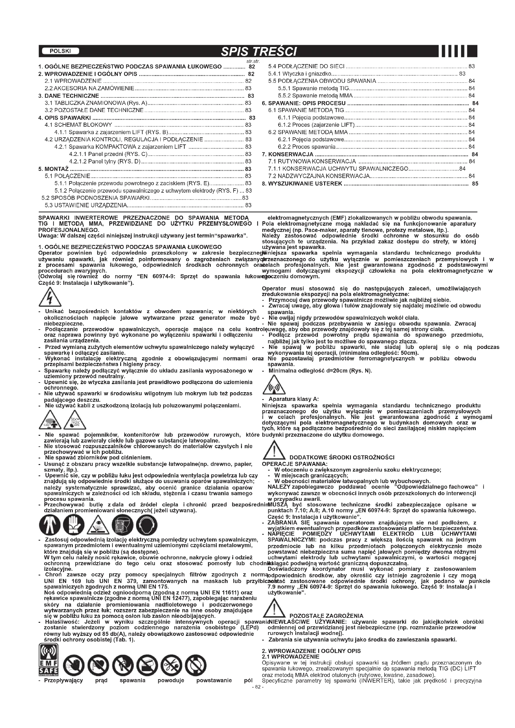 Operator powinien być odpowiednio przeszkolony w zakresie bezpiecznego używaniu spawarki, jak również poinformowany o zagrożeniach związanych z procesami spawania łukowego, odpowiednich środkach ochronnych oraz procedurachawaryjnych. (Odwołaj sięrównież do normy “EN 60974-9: Sprzęt do spawania łukowego. Część9:Instalacjaiużytkowanie”). - Unikać bezpośrednich kontaktów z obwodem spawania; w niektórych okolicznościach napięcie jałowe wytwarzane przez generator może być niebezpieczne. - Podłączanie przewodów spawalniczych, operacje mające na celu kontrolę oraznaprawapowinnybyćwykonanepowyłączeniu spawarki i odłączeniu zasilaniaurządzenia. - Przedwymianązużytychelementówuchwytuspawalniczegonależywyłączyć spawarkęiodłączyćzasilanie. - Wykonać instalację elektryczną zgodnie z obowiązującymi normami oraz przepisamibezpieczeństwaihigienypracy. - Spawarkęnależypodłączyćwyłączniedoukładuzasilaniawyposażonegow uziemionyprzewódneutralny. - Upewnićsię,żewtyczkazasilaniajestprawidłowopodłączonadouziemienia ochronnego. - Nieużywaćspawarkiwśrodowiskuwilgotnymlubmokrymlubteżpodczas padającegodeszczu. - Nieużywaćkablizuszkodzonąizolacjąlubpoluzowanymipołączeniami. - Nie spawać pojemników, kontenitorów lub przewodów rurowych, które zawierająlubzawierałyciekłelubgazowesubstancjełatwopalne. - Niestosowaćrozpuszczalnikówchlorowanychdomateriałówczystychinie przechowywaćwichpobliżu. - Niespawaćzbiornikówpodciśnieniem. - Usunąćzobszarupracywszelkiesubstancjełatwopalne(np.drewno,papier, szmaty,itp.). - Upewnićsie,czywpobliżułukujestodpowiedniawentylacjapowietrzalubczy znajdująsięodpowiednieśrodkisłużącedousuwaniaoparówspawalniczych; należy systematycznie sprawdzać, aby ocenić granice działania oparów spawalniczychwzależnościodichskładu,stężeniaiczasutrwaniasamego procesuspawania. -Przechowywać butlę zdala od źródeł ciepła ichronić przed bezpośrednim działaniempromieniowanisłonecznych(jeżeliużywana). - Zastosujodpowiedniąizolacjęelektrycznąpomiędzyuchwytemspawalniczym, spawanymprzedmiotemiewentualnymiuziemionymiczęściamimetalowymi, któreznajdująsięwpobliżu(sądostępne). Wtymcelunależynosićrękawice,obuwieochronne,nakryciegłowyiodzież ochronną przewidziane do tego celu oraz stosować pomosty lub chodniki izolacyjne. - Chroń zawsze oczy przy pomocy specjalnych ltrów zgodnych z normą UNI EN 169 lub UNI EN 379, zamontowanych na maskach lub przyłbicach spawalniczychzgodnychznormąUNIEN175. Nośodpowiedniąodzieżognioodporną(zgodnąznormąUNIEN11611)oraz rękawicespawalnicze(zgodneznormąUNIEN12477),zapobiegającnarażeniu skóry na działanie promieniowania nadoletowego i podczerwonego wytwarzanychprzezłuk;rozszerzzabezpieczenienainneosobyznajdujące sięwpobliżułukuzapomocąosłonlubzasłonnieodbijających. - Hałaśliwość: Jeżeli w wyniku szczególnie intensywnych operacji spawania zostanie stwierdzony poziom codziennego narażenia osobistego (LEPd) równylubwyższyod85db(A),należyobowiązkowozastosowaćodpowiednie środkiochronyosobistej(Tab.1). - Przepływający prąd spawania powoduje powstawanie pól elektromagnetycznych(EMF)zlokalizowanychwpobliżuobwoduspawania. Pola elektromagnetyczne mogą nakładać się na funkcjonowanie aparatury medycznej(np.Pace-maker,aparatytlenowe,protezymetalowe,itp.). Należy zastosować odpowiednie środki ochronne w stosunku do osób stosujących te urządzenia. Na przykład zakaz dostępu do strefy, w której używanajestspawarka. Niniejsza spawarka spełnia wymagania standardu technicznego produktu przeznaczonegodo użytku wyłącznie w pomieszczeniach przemysłowych i w celach profesjonalnych. Nie jest gwarantowana zgodność z podstawowymi wymogami dotyczącymi ekspozycji człowieka na pola elektromagnetyczne w otoczeniudomowym. Operator musi stosować się do następujących zaleceń, umożliwiających zredukowanieekspozycjinapolaelektromagnetyczne: - Przymocujdwaprzewodyspawalniczemożliwiejaknajbliżejsiebie. - Zwracajuwagę,abygłowaitułówznajdowałysięnajdalejmożliwieodobwodu spawania. - Nieowijajnigdyprzewodówspawalniczychwokółciała. - Nie spawaj podczas przebywania w zasięgu obwodu spawania. Zwracaj uwagę,abyobaprzewodyznajdowałysięztejsamejstronyciała. - Podłącz przewód powrotny prądu spawania do spawanego przedmiotu, najbliżejjaktylkojesttomożliwedospawanegozłącza. - Nie spawaj w pobliżu spawarki, nie siadaj lub opieraj się o nią podczas wykonywaniatejoperacji,(minimalnaodległość:50cm). - Nie pozostawiaj przedmiotów ferromagnetycznych w pobliżu obwodu spawania. - Minimalnaodległośćd=20cm(Rys.N). - AparaturaklasyA: Niniejsza spawarka spełnia wymagania standardu technicznego produktu przeznaczonego do użytku wyłącznie w pomieszczeniach przemysłowych i w celach profesjonalnych. Nie jest gwarantowana zgodność z wymogami dotyczącymi pola elektromagnetycznego w budynkach domowych oraz w tych,któresąpodłączonebezpośredniodosiecizasilającejniskimnapięciem budynkiprzeznaczonedoużytkudomowego.