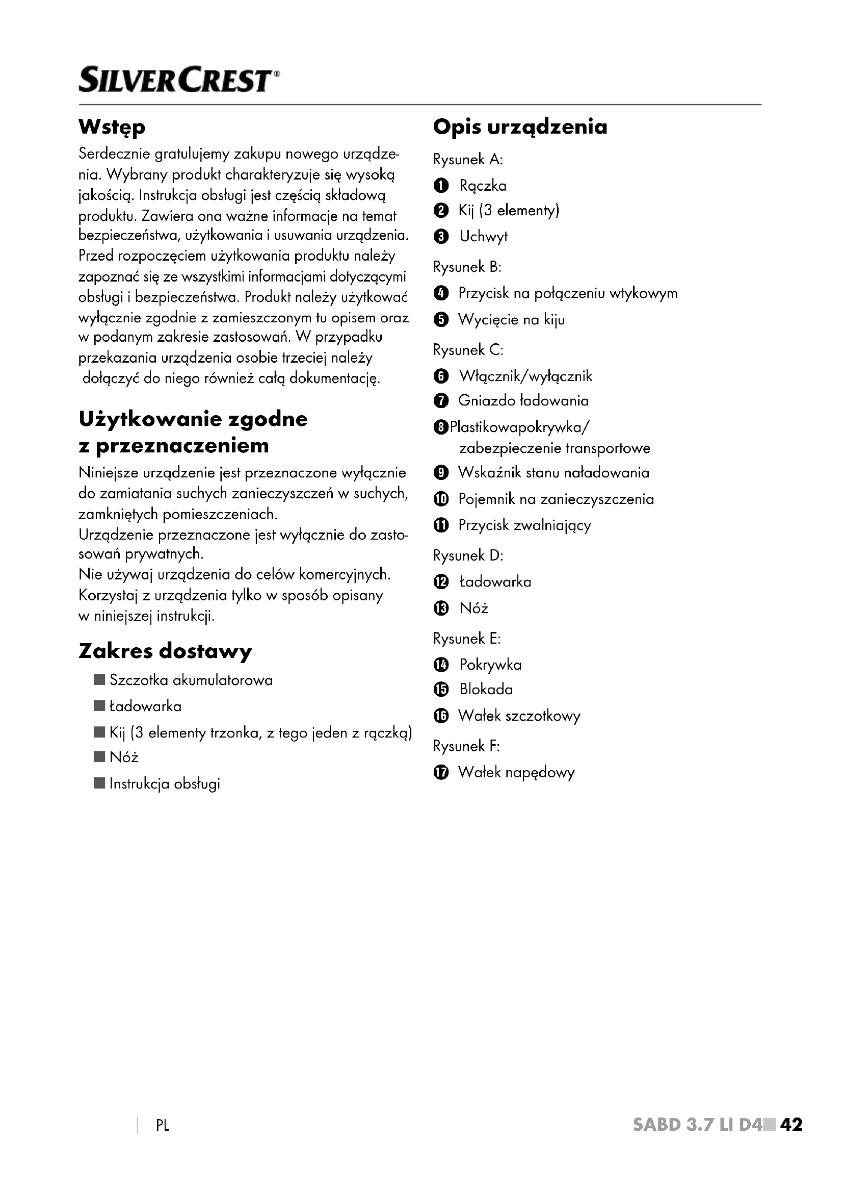 PL Wstęp Serdecznie gratulujemy zakupu nowego urządze- nia. Wybrany produkt charakteryzuje się wysoką jakością. Instrukcja obsługi jest częścią składową produktu. Zawiera ona ważne informacje na temat bezpieczeństwa, użytkowania i usuwania urządzenia. Przed rozpoczęciem użytkowania produktu należy zapoznać się ze wszystkimi informacjami dotyczącymi obsługi i bezpieczeństwa. Produkt należy użytkować wyłącznie zgodnie z zamieszczonym tu opisem oraz w podanym zakresie zastosowań. W przypadku przekazania urządzenia osobie trzeciej należy dołączyć do niego również całą dokumentację. Użytkowanie zgodne z przeznaczeniem Niniejsze urządzenie jest przeznaczone wyłącznie do zamiatania suchych zanieczyszczeń w suchych, zamkniętych pomieszczeniach. Urządzenie przeznaczone jest wyłącznie do zasto- sowań prywatnych. Nie używaj urządzenia do celów komercyjnych. Korzystaj z urządzenia tylko w sposób opisany wniniejszej instrukcji. Zakres dostawy ■ Szczotka akumulatorowa ■ Ładowarka ■ Kij (3 elementy trzonka, z tego jeden z rączką) ■ Nóż ■ Instrukcja obsługi Opis urządzenia Rysunek A: 1 Rączka 2 Kij (3 elementy) 3 Uchwyt Rysunek B: 4 Przycisk na połączeniu wtykowym 5 Wycięcie na kiju Rysunek C: 6 Włącznik/wyłącznik 7 Gniazdo ładowania 8 Plastikowa pokrywka/ zabezpieczenie transportowe 9 Wskaźnik stanu naładowania 0 Pojemnik na zanieczyszczenia q Przycisk zwalniający Rysunek D: w Ładowarka e Nóż Rysunek E: r Pokrywka t Blokada z Wałek szczotkowy Rysunek F: u Wałek napędowySABD 3.7 LI D4 PL