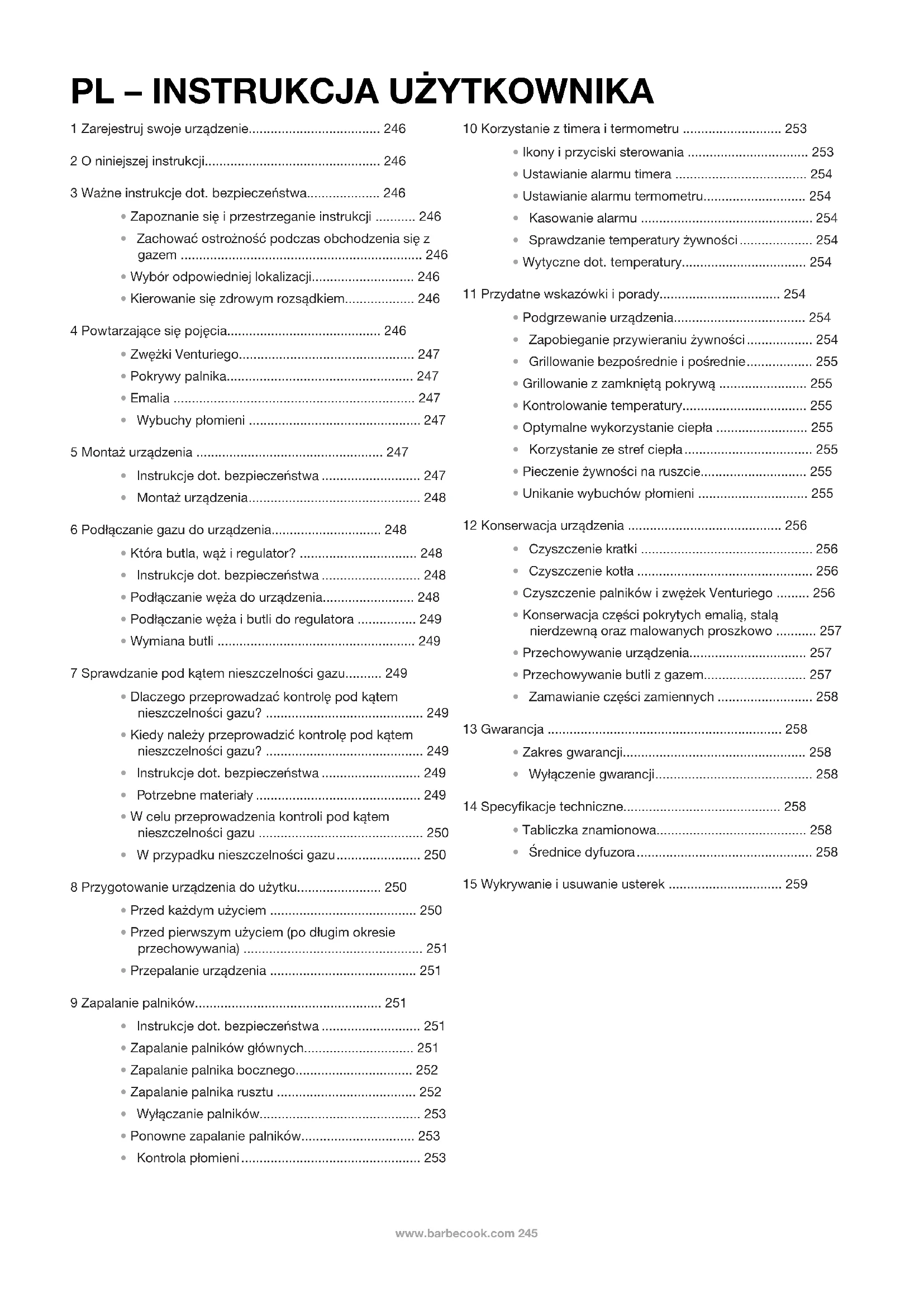 - Średnice dyfuzora ................................................ 258 15 Wykrywanie i usuwanie usterek ............................... 259 !gas_quisson_standard.book Page 245 Tuesday, September 2, 2014 2:13 PM246 www.barbecook.com 1 ZAREJESTRUJ SWOJE URZĄDZENIE Dziękujemy za zakup urządzeniaBarbecook! Mamy nadzieję, że dzięki niemu mile spędzą Państwo czas podczas grillowania. W celu zwiększenia satysfakcji z korzystania zarejestruj swoje urządzenie na stronie www.barbecook.com. Zajmie to zaledwie kilka minut i zapewni wiele korzyści: