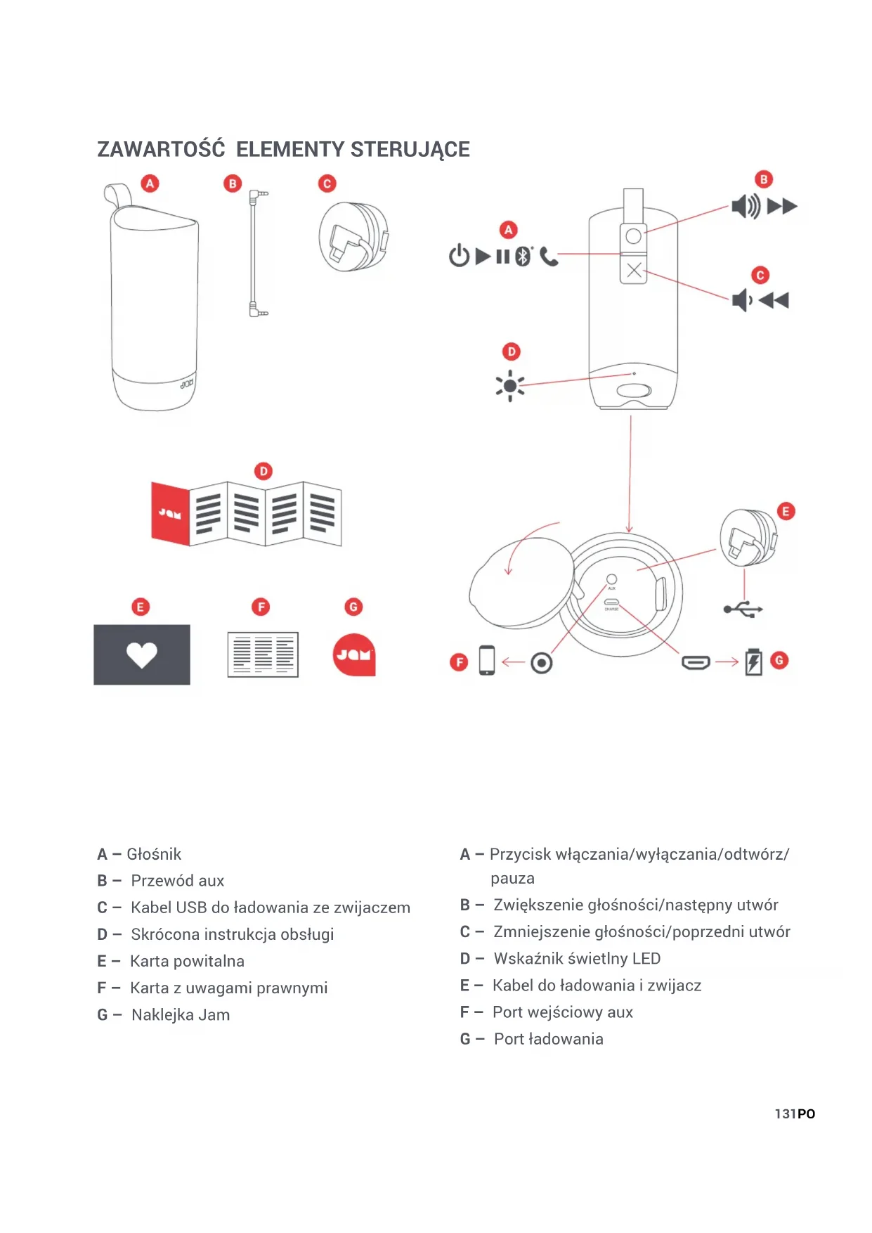 A – Głośnik B – Przewód aux C – Kabel USB do ładowania ze zwijaczem D – Skrócona instrukcja obsługi E – Karta powitalna F – Karta z uwagami prawnymi G – Naklejka Jam A – Przycisk włączania/wyłączania/odtwórz/ pauza B – Zwiększenie głośności/następny utwór C – Zmniejszenie głośności/poprzedni utwór D – Wskaźnik świetlny LED E – Kabel do ładowania i zwijacz F – Port wejściowy aux G – Port ładowania132 CHARGE AUX CHARGE KONFIGURACJA 2hrs 12hrs 3 hrs 22 hrs