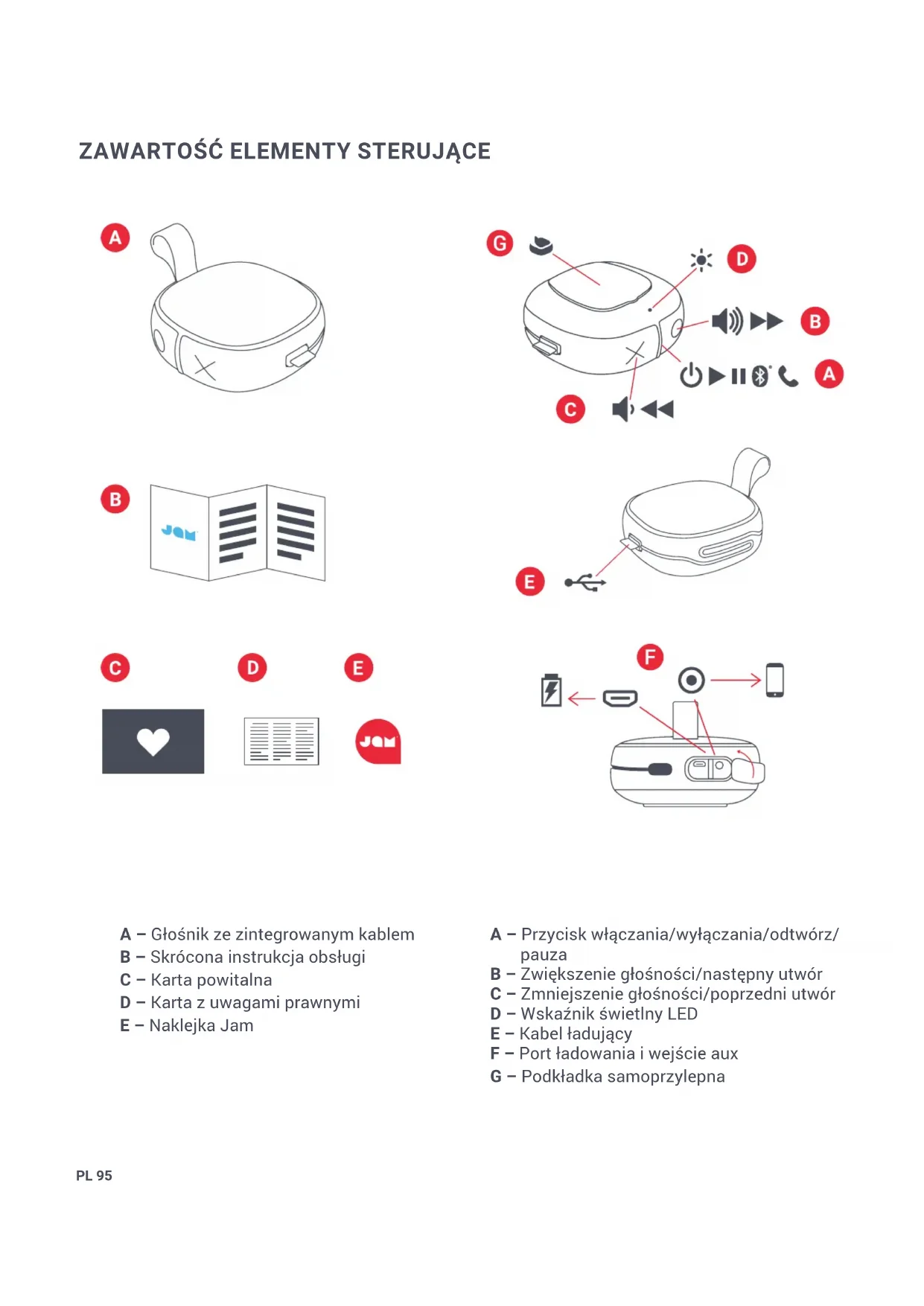 A – Głośnik ze zintegrowanym kablem B – Skrócona instrukcja obsługi C – Karta powitalna D – Karta z uwagami prawnymi E – Naklejka Jam A – Przycisk włączania/wyłączania/odtwórz/ pauza B – Zwiększenie głośności/następny utwór C – Zmniejszenie głośności/poprzedni utwór D – Wskaźnik świetlny LED E – Kabel ładujący F – Port ładowania i wejście aux G – Podkładka samoprzylepnaPL 96 KONFIGURACJA