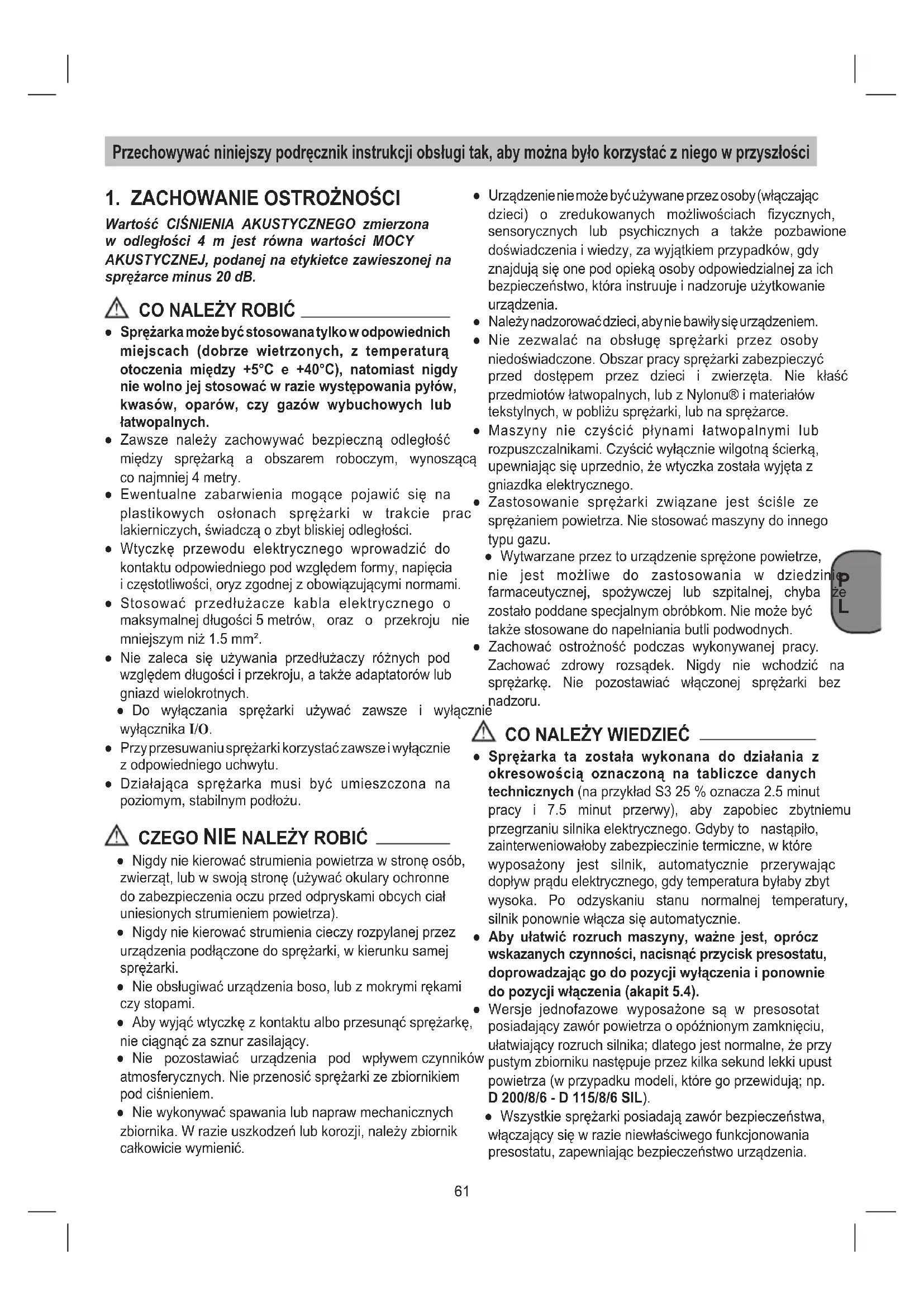 ● Sprężarka ta została wykonana do działania z okresowością oznaczoną na tabliczce danych technicznych(naprzykładS325%oznacza2.5minut pracy i 7.5 minut przerwy), aby zapobiec zbytniemu przegrzaniusilnikaelektrycznego.Gdybyto nastąpiło, zainterweniowałobyzabezpieczinietermiczne,wktóre wyposażony jest silnik, automatycznie przerywając dopływprąduelektrycznego,gdytemperaturabyłabyzbyt wysoka. Po odzyskaniu stanu normalnej temperatury, silnikponowniewłączasięautomatycznie. ● Aby ułatwić rozruch maszyny, ważne jest, oprócz wskazanych czynności, nacisnąć przycisk presostatu, doprowadzając go do pozycji wyłączenia i ponownie do pozycji włączenia (akapit 5.4). ● Wersje jednofazowe wyposażone są w presosotat posiadającyzawórpowietrzaoopóźnionymzamknięciu, ułatwiającyrozruchsilnika;dlategojestnormalne,żeprzy pustymzbiornikunastępujeprzezkilkasekundlekkiupust powietrza(wprzypadkumodeli,któregoprzewidują;np. D 200/8/6 - D 115/8/6 SIL). ● Wszystkiesprężarkiposiadajązawórbezpieczeństwa, włączającysięwrazieniewłaściwegofunkcjonowania presostatu,zapewniającbezpieczeństwourządzenia. Przechowywać niniejszy podręcznik instrukcji obsługi tak, aby można było korzystać z niego w przyszłościP
