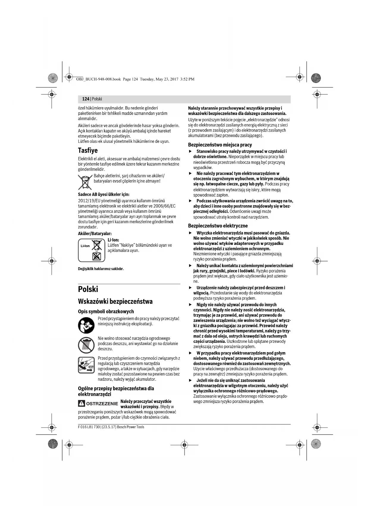 - w zależności od zastosowanego akumulatora OBJ_BUCH-948-008.book Page 129 Tuesday, May 23, 2017 3:52 PM130 | Polski F 016 L81 730 | (23.5.17) Bosch Power Tools Informacja na temat hałasu i wibracji Emisja hałasu została określona zgodnie z EN 60745-2-15. Określony wg skali A poziom hałasu emitowanego przez urządzenie wynosi standardowo: Poziom ciśnienia akustycznego 67 dB (A); poziom mocy akustycznej 87 dB (A). Niepewność pomiaru K =3 dB. Stosować środki ochrony słuchu! Wartości łączne drgań a
