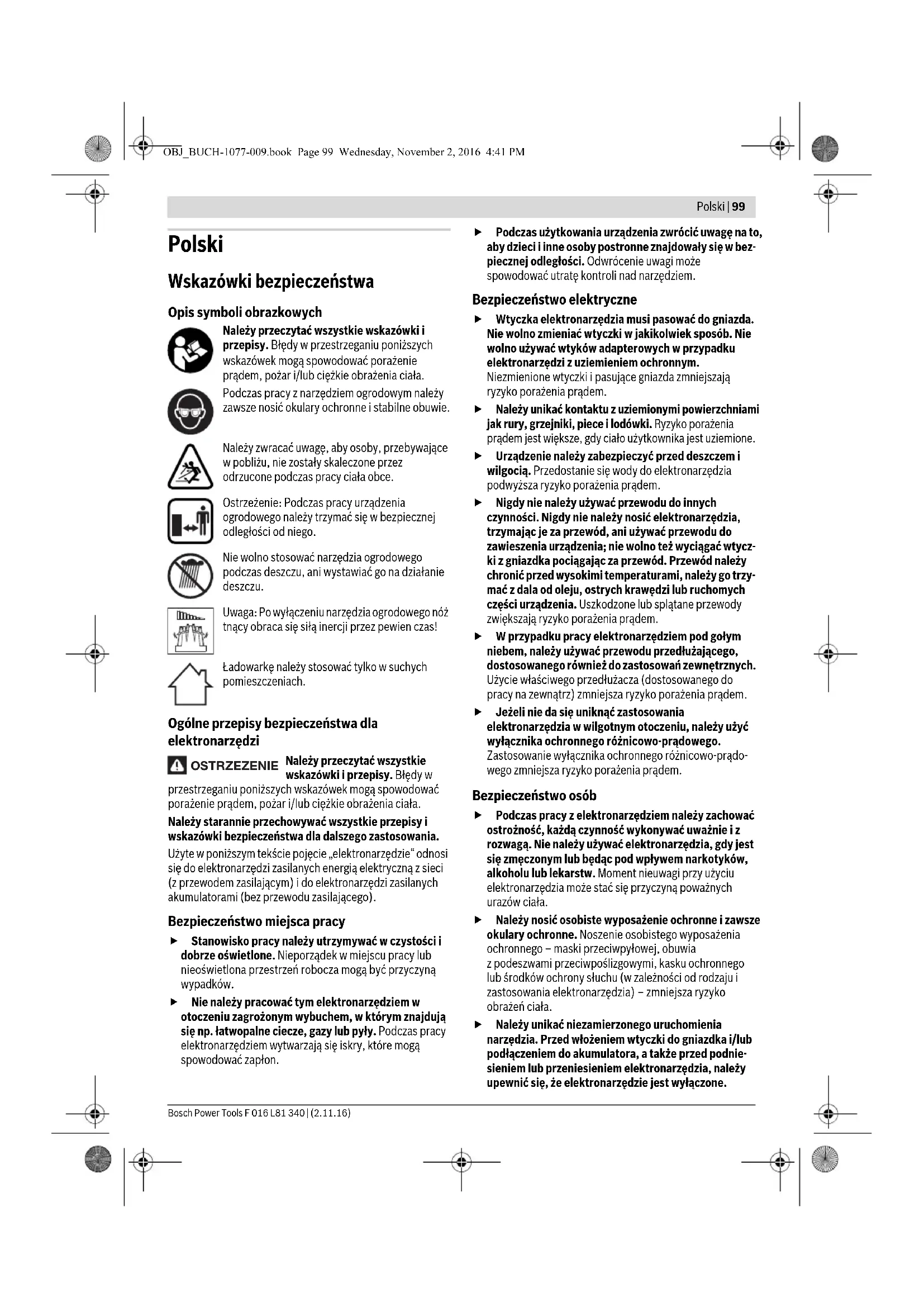 Denizli Tel.: 0258 2620666 Bulut Elektrik İstasyon Cad. No: 52/B Devlet Tiyatrosu Karşısı Elazığ Tel.: 0424 2183559 Körfez Elektrik Sanayi Çarşısı 770 Sok. No: 71 Erzincan Tel.: 0446 2230959 Ege Elektrik İnönü Bulvaro No: 135 Muğla Makasarası Fethiye Fethiye Tel.: 0252 6145701 Değer İş Bobinaj İsmetpaşa Mah. İlk Belediye Başkan Cad. 5/C Şahinbey Gaziantep Tel.: 0342 2316432 Çözüm Bobinaj İsmetpaşa Mah. Eski Şahinbey Belediyesi altı Cad. No: 3/C Gaziantep Tel.: 0342 2319500 Onarım Bobinaj Raifpaşa Cad. No: 67 İskenderun Hatay Tel.: 0326 6137546 Günşah Otomotiv Beylikdüzü Sanayi Sit. No: 210 Beylikdüzü İstanbul Tel.: 0212 8720066 Aygem 10021 Sok. No: 11 AOSB Çiğli İzmir Tel.: 0232 3768074 Sezmen Bobinaj Ege İş Merkezi 1201/4 Sok. No: 4/B Yenişehir İzmir Tel.: 0232 4571465 Ankaralı Elektrik Eski Sanayi Bölgesi 3. Cad. No: 43 Kayseri Tel.: 0352 3364216 Asal Bobinaj Eski Sanayi Sitesi Barbaros Cad. No: 24 Samsun Tel.: 0362 2289090 Üstündağ Elektrikli Aletler Nusretiye Mah. Boyacılar Aralığı No: 9 Tekirdağ Tel.: 0282 6512884 Nakliye Alet içindeki lityum iyon (Li-Ion) aküler tehlikeli madde taşıma yönetmeliği hükümlerine tabidir. Aküler başka bir yükümlülük olmaksızın kullanıcı tarafından caddeler üzerinde taşınabilir. Üçüncü kişiler eliyle yollanma durumunda (örneğin hava yolu ile veya nakliye şirketleri ile) paketleme ve etiketlemeye ilişkin özel hükümlere uyulmalıdır. Bu nedenle gönderi paketlenirken bir tehlikeli madde uzmanından yardım alınmalıdır. Tasfiye Bahçe aletleri, aksesuar ve ambalaj malzemesi çevre dostu bir biçimde tasfiye edilmek üzere geri dönüşüm merkezine yollanmak zorundadır. Bahçe aletlerini, şarj cihazlarını ve aküleri/bataryaları evsel çöplerin içine atmayın! Sadece AB üyesi ülkeler için: 2012/19/EU yönetmeliği uyarınca kullanım ömrünü tamamlamış elektronik ve elektrikli aletler ve 2006/66/EC yönetmeliği uyarınca arızalı veya kullanım ömrünü tamamlamış aküler/bataryalar ayrı ayrı toplanmak ve çevre dostu tasfiye için geri kazanım merkezlerine gönderilmek zorundadır. Alete entegre aküler sadece tasfiye amacıyla çıkarılabilirler. Gövdenin açılmasıyla bahçe aleti tahrip edilebilir. Aküyü elektrikli el aletinden çıkarmak için açma/kapama şalterine akü tam olarak boşalıncaya kadar basın. Gövdedeki vidaları sökün ve aküyü almak için gövde parçasını çıkarın. Kısa devreye neden olmamak için aküdeki bağlantıları teker teker ayırın ve kutupları izole edin. Tam olarak boşalma durumunda bile aküde kısa devreye neden olabilecek artık kapasite bulunur. Aküler/Bataryalar: Li-Ion: Lütfen “Nakliye” bölümündeki uyarı ve açıklamalara uyun. Değişiklik haklarımız saklıdır. OBJ_BUCH-1077-009.book Page 98 Wednesday, November 2, 2016 4:41 PMPolski | 99 Bosch Power Tools F 016 L81 340 | (2.11.16) Polski Wskazówki bezpieczeństwa Opis symboli obrazkowych Należy przeczytać wszystkie wskazówki i przepisy. Błędy w przestrzeganiu poniższych wskazówek mogą spowodować porażenie prądem, pożar i/lub ciężkie obrażenia ciała. Podczas pracy z narzędziem ogrodowym należy zawsze nosić okulary ochronne i stabilne obuwie. Należy zwracać uwagę, aby osoby, przebywające w pobliżu, nie zostały skaleczone przez odrzucone podczas pracy ciała obce. Ostrzeżenie: Podczas pracy urządzenia ogrodowego należy trzymać się w bezpiecznej odległości od niego. Nie wolno stosować narzędzia ogrodowego podczas deszczu, ani wystawiać go na działanie deszczu. Uwaga: Po wyłączeniu narzędzia ogrodowego nóż tnący obraca się siłą inercji przez pewien czas! Ładowarkę należy stosować tylko w suchych pomieszczeniach. Ogólne przepisy bezpieczeństwa dla elektronarzędzi Należy przeczytać wszystkie wskazówki i przepisy. Błędy w przestrzeganiu poniższych wskazówek mogą spowodować porażenie prądem, pożar i/lub ciężkie obrażenia ciała. Należy starannie przechowywać wszystkie przepisy i wskazówki bezpieczeństwa dla dalszego zastosowania. Użyte w poniższym tekście pojęcie „elektronarzędzie“ odnosi się do elektronarzędzi zasilanych energią elektryczną z sieci (z przewodem zasilającym) i do elektronarzędzi zasilanych akumulatorami (bez przewodu zasilającego). Bezpieczeństwo miejsca pracy Stanowisko pracy należy utrzymywać w czystości i dobrze oświetlone. Nieporządek w miejscu pracy lub nieoświetlona przestrzeń robocza mogą być przyczyną wypadków. Nie należy pracować tym elektronarzędziem w otoczeniu zagrożonym wybuchem, w którym znajdują się np. łatwopalne ciecze, gazy lub pyły. Podczas pracy elektronarzędziem wytwarzają się iskry, które mogą spowodować zapłon. Podczas użytkowania urządzenia zwrócić uwagę na to, aby dzieci i inne osoby postronne znajdowały się w bez- piecznej odległości. Odwrócenie uwagi może spowodować utratę kontroli nad narzędziem. Bezpieczeństwo elektryczne Wtyczka elektronarzędzia musi pasować do gniazda. Nie wolno zmieniać wtyczki w jakikolwiek sposób. Nie wolno używać wtyków adapterowych w przypadku elektronarzędzi z uziemieniem ochronnym. Niezmienione wtyczki i pasujące gniazda zmniejszają ryzyko porażenia prądem. Należy unikać kontaktu z uziemionymi powierzchniami jak rury, grzejniki, piece i lodówki. Ryzyko porażenia prądem jest większe, gdy ciało użytkownika jest uziemione. Urządzenie należy zabezpieczyć przed deszczem i wilgocią. Przedostanie się wody do elektronarzędzia podwyższa ryzyko porażenia prądem. Nigdy nie należy używać przewodu do innych czynności. Nigdy nie należy nosić elektronarzędzia, trzymając je za przewód, ani używać przewodu do zawieszenia urządzenia; nie wolno też wyciągać wtycz- ki z gniazdka pociągając za przewód. Przewód należy chronić przed wysokimi temperaturami, należy go trzy- mać z dala od oleju, ostrych