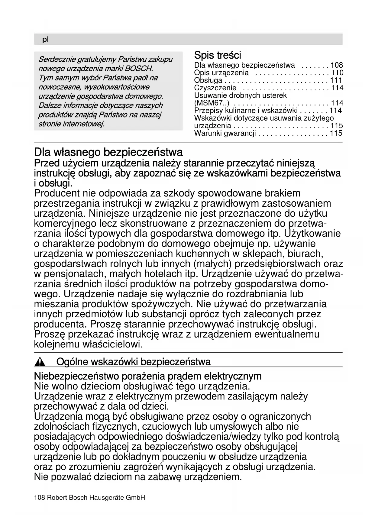 - Warunki gwarancji Dla własnego bezpieczeństwa Przed użyciem urządzenia należy starannie przeczytać niniejszą instrukcję obsługi, aby zapoznać się ze wskazówkami bezpieczeństwa i obsługi. Producent nie odpowiada za szkody spowodowane brakiem przestrzegania instrukcji w związku z prawidłowym zastosowaniem urządzenia. Niniejsze urządzenie nie jest przeznaczone do użytku komercyjnego lecz skonstruowane z przeznaczeniem do przetwa- rzania ilości typowych dla gospodarstwa domowego itp. Użytkowanie o charakterze podobnym do domowego obejmuje np. używanie urządzenia w pomieszczeniach kuchennych w sklepach, biurach, gospodarstwach rolnych lub innych (małych) przedsiębiorstwach oraz w pensjonatach, małych hotelach itp. Urządzenie używać do przetwa- rzania średnich ilości produktów na potrzeby gospodarstwa domo- wego. Urządzenie nadaje się wyłącznie do rozdrabniania lub mieszania produktów spożywczych. Nie używać do przetwarzania innych przedmiotów lub substancji oprócz tych zaleconych przez producenta. Proszę starannie przechowywać instrukcję obsługi. Proszę przekazać instrukcję wraz z urządzeniem ewentualnemu kolejnemu właścicielowi. , Ogólne wskazówki bezpieczeństwa Niebezpieczeństwo porażenia prądem elektrycznym Nie wolno dzieciom obsługiwać tego urządzenia. Urządzenie wraz z elektrycznym przewodem zasilającym należy przechowywać z dala od dzieci. Urządzenia mogą być obsługiwane przez osoby o ograniczonych zdolnościach fizycznych, czuciowych lub umysłowych albo nie posiadających odpowiedniego doświadczenia/wiedzy tylko pod kontrolą osoby odpowiadającej za bezpieczeństwo osoby obsługującej urządzenie lub po dokładnym pouczeniu w obsłudze urządzenia oraz po zrozumieniu zagrożeń wynikających z obsługi urządzenia. Nie pozwalać dzieciom na zabawę urządzeniem. p. 115