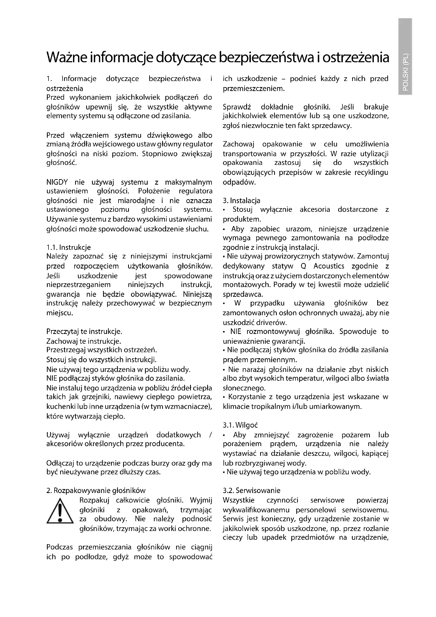 - Nie używaj tego urządzenia w pobliżu wody. 3.2. Serwisowanie Wszystkie czynności serwisowe powierzaj wykwalikowanemu personelowi serwisowemu. Serwis jest konieczny, gdy urządzenie zostanie w jakikolwiek sposób uszkodzone, np. przez rozlanie cieczy lub upadek przedmiotów na urządzenie, Ważne informacje dotyczące bezpieczeństwa i ostrzeżenia112 113 wystawienie urządzenia na działanie deszczu lub wilgoci, gdy urządzenie nie działa prawidłowo albo zostało upuszczone. 4.0. Symbole stosowane na produkcie Symbol ostrzeżenia o niebezpieczeństwie Wykrzyknik zwraca uwagę na kwestie, w przypadku których należy dokładnie zapoznać się z niniejszą instrukcją, aby zapobiec problemom z eksploatacją i konserwacją. UWAGA: Aby zapobiec porażeniu prądem, ustaw naprzeciw siebie szeroki bolec wtyczki z szerokim gniazdem i wprowadź do oporu. Symbol zużytego sprzętu elektrycznego i elektronicznego Ten symbol sygnalizuje, że po wycofaniu urządzenia z eksploatacji nie należy go poddawać utylizacji razem z odpadami komunalnych i należy wysyłać go do oddzielnych punktów odbiorczych przeznaczonych dla odpadów do przeróbki i recyklingu sprzętu elektrycznego i elektronicznego. Należy zapoznać się z lokalnymi zasadami oddzielnej zbiórki produktów elektrycznych i elektronicznych. POLSKI (PL)112 113 Wprowadzenie Dziękujemy za zakup produktu Q Acoustics. Ta instrukcja zawiera informacje na temat ustawiania i instalacji w celu zapewnienia optymalnej wydajności działania produktu. W celu zapewnienia bezpiecznej i satysfakcjonującej eksploatacji produktu przed przystąpieniem do jego instalacji i użytkowania, przeczytaj dokładnie instrukcję i ważne informacje dotyczące bezpieczeństwa oraz ostrzeżenia. Urządzenia Q Acoustics serii 3000i to gama głośników stworzonych z myślą o zaspokojeniu najwyższych oczekiwań audiolów ceniących 2-kanałowy dźwięk oraz wymagających kinomanów. Gama obejmuje: 3010i: Kompaktowy głośnik półkowy z driverem basowym 100 mm (4 cale). 3020i: Głośnik półkowy z driverem basowym 125 mm (5 cali). 3050i: Głośnik podłogowy z 2 driverami basowymi 165 mm (6,5 cala). 3060S: Aktywny głośnik niskotonowy (subwoofer) 150 W z dwoma 200 mm driverami (8,0 cali). 3090Ci: Kanał środkowy z 2 driverami basowymi 100 mm (4 cale). W opakowaniu każdego głośnika znajdują się: głośnik / głośniki oraz ten podręcznik. Dodatkowo, w opakowaniu następujących modeli znajdują się wymienione poniżej elementy: 3050i: Stabilizator tylny, podpórki i osłony podpórek dla każdego głośnika. Klucz imbusowy do regulacji podpórek po zamontowaniu. 3060S: Kabel lub kable zasilania, podpórki i osłony podpórek. Sprawdź dokładnie produkt. Jeśli brakuje jakichkolwiek elementów lub są one uszkodzone, możliwie jak najszybciej zgłoś ten fakt sprzedawcy. Mamy nadzieję, że produkty Q Acoustic dostarczą Państwu niezapomnianych wrażeń. POLSKI (PL)114 115 Przygotowanie 3050i – Zamocuj tylny stabilizator Wkręć podpórki z nakrętkami blokującymi do połowy w podstawę i ustaw głośnik pionowo. (W przypadku posiadania drewnianej lub kamiennej podłogi załóż osłonę podpórki na każdą podpórkę przed ustawieniem głośnika pionowo) Po ustawieniu głośnika pionowo włóż klucz imbusowy po kolei od góry do każdej tylnej podpórki i wyreguluj podpórki, wkręcając lub wykręcając je, aż głośnik będzie ustawiony poziomo i stabilnie. Tłumik piankowy Głośniki serii 3000i posiadają wyloty z tyłu i zostały zaprojektowane z myślą o zapewnieniu pewnej przestrzeni za nimi, to znaczy odległości około 200 mm od ściany. W przypadku umieszczenia głośników blisko ściany/narożnika włóż do tylnych wylotów tłumiki piankowe, aby zapobiec nadmiernej intensywności dźwięków niskotonowych. Upewnij się, że tłumiki są pewnie, ale niezbyt głęboko włożone do wylotów. Poziom dźwięków niskotonowych zostanie ograniczony, ale ich denicja i zakres poprawi się. Wykonaj próby, zmieniając nieco ustawienie głośników, tak aby uzyskać optymalne rezultaty odpowiadające indywidualnym preferencjom. Podpórki są ostre. Zachowaj ostrożność! Nigdy nie ustawiaj głośnika z podpórkami w miejscu, w którym mógłby spowodować uszkodzenia! Zawsze podnoś głośniki przed ich przemieszczeniem – nigdy nie ciągnij głośników! Wyjmij głośniki z opakowań, trzymając za obudowy. Nie dotykaj driverów ani nie podnoś głośników za opakowania ochronne. Głośniki 3050i i 3060S są ciężkie – w razie potrzeby skorzystaj z pomocy w celu ich podniesienia. Zamocuj nóżki za pomocą dostarczonych śrub. POLSKI (PL)114 115 Wszystkie głośniki mogą być użytkowane bez negatywnych efektów w pobliżu tradycyjnych telewizorów, z wyjątkiem modelu 3060S, którego nie wolno użytkować w odległości mniejszej niż 500 mm od telewizorów lub innych urządzeń wrażliwych na działanie pola elektromagnetycznego. Żaden z modeli głośników nie wpływa na działanie ekranów LCD i plazmowych. Ustawianie 3010i 3020i Głośniki 3010i i 3020i najlepiej jest montować na statywach podłogowych Q Acoustics albo na ścianie. W przypadku montażu na statywie należy kierować się wskazówką, zgodnie z którą głośnik wysokotonowy powinien się znajdować na wysokości uszu siedzącego słuchacza. W przypadku montażu na ścianie głośniki powinny być zamontowane nieco wyżej i nachylone w dół. Głośniki montowane na statywie należy traktować jak głośniki podłogowe, jednak takie głośniki można ustawić nieco bliżej tylnej ściany. Możliwy jest również montaż na półce. U sprzedawców dostępny jest opcjonalny wspornik, służący do montażu głośników Q Acoustics 3010i, 3020i i 3090Ci na ścianie. Dostępne są również statywy podłogowe do głośników 3010i i 3020i. W celu ustalenia najlepszego ustawienia, odpowiadającego własnym upodobaniom i konkretnej przestrzeni, należy wykonać