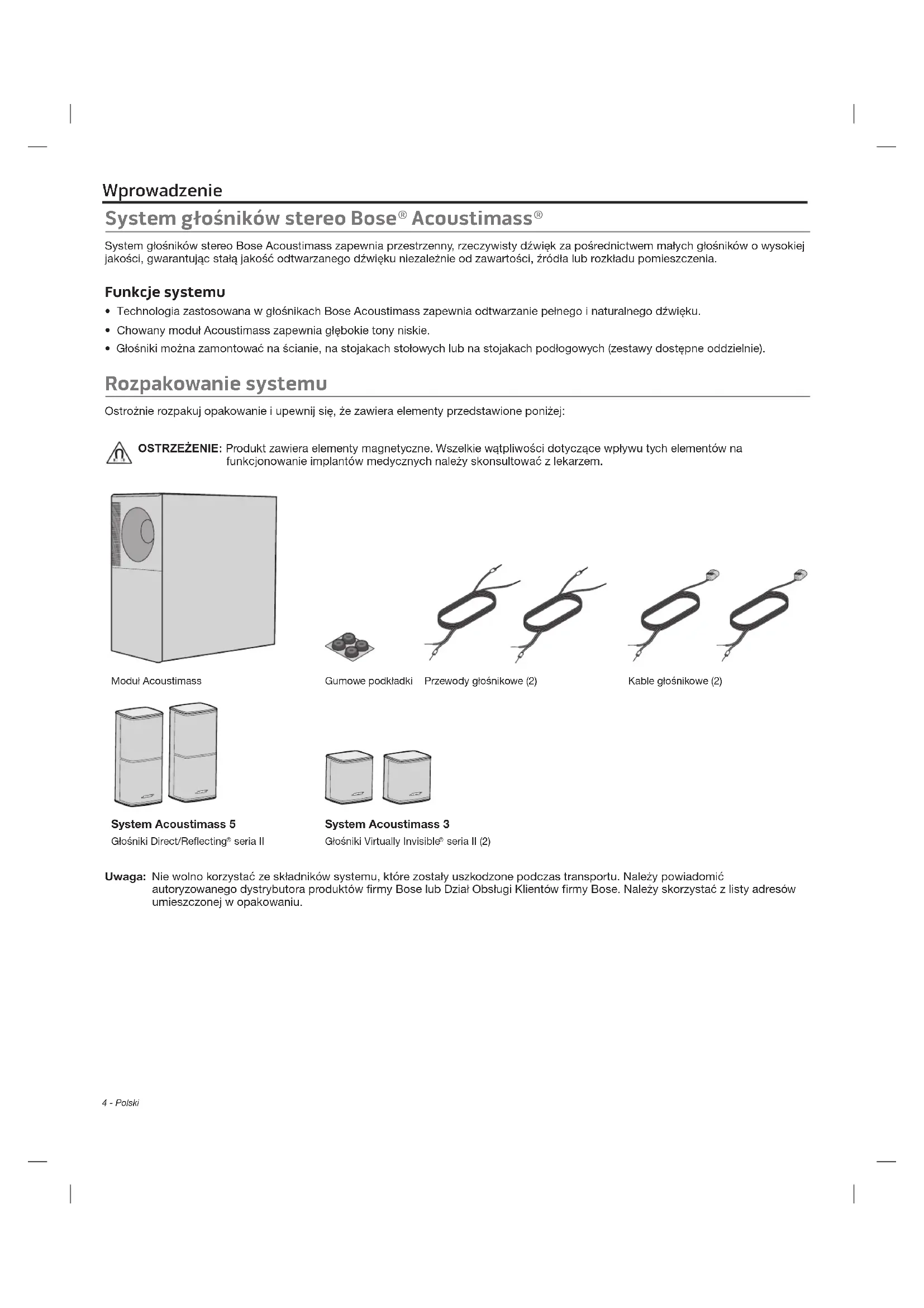 - Głośniki można zamontować na ścianie, na stojakach stołowych lub na stojakach podłogowych (zestawy dostępne oddzielnie). Rozpakowanie systemu Ostrożnie rozpakuj opakowanie i upewnij się, że zawiera elementy przedstawione poniżej: OSTRZEŻENIE: Produkt zawiera elementy magnetyczne. Wszelkie wątpliwości dotyczące wpływu tych elementów na funkcjonowanie implantów medycznych należy skonsultować z lekarzem. Moduł Acoustimass Gumowe podkładki Przewody głośnikowe (2) Kable głośnikowe (2) System Acoustimass 5 Głośniki Direct/Reflecting seria II System Acoustimass 3 Głośniki Virtually Invisible seria II (2) Uwaga: Nie wolno korzystać ze składników systemu, które zostały uszkodzone podczas transportu. Należy powiadomić autoryzowanego dystrybutora produktów firmy Bose lub Dział Obsługi Klientów firmy Bose. Należy skorzystać z listy adresów umieszczonej w opakowaniu. WprowadzeniePolski - 5 Przygotowanie systemu Zalecenia dotyczące rozmieszczenia Umieść system poza metalowymi szafkami i z dala od nich, z dala od innych komponentów audio-wideo, a także z dala od bezpośrednich źródeł ciepła. Moduł Acoustimass