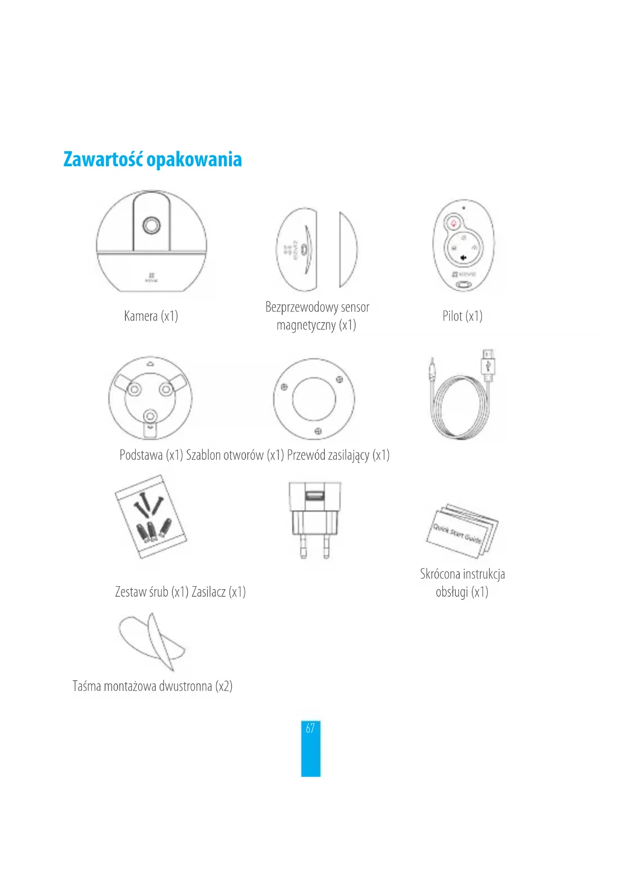 Introductie van de afstandsbediening Slaapmodus LED-indicator Uit-huis-modus Dempen Noodgeval Thuismodus Naam Beschrijving LED-indicator Knipperen wanneer een toets wordt ingedrukt. Druk hierop om een noodalarm naar het EZVIZ-platform te versturen. Als iemand thuis is of als u het huis binnengaat, moet u het alarmsysteem uitschakelen. Druk op deze knop om de Thuismodus te activeren. Wanneer u thuis bent en u zich toch beschermd wilt voelen, wordt hiermee alleen de omtrek van het huis (deuren en ramen) geactiveerd. De Slaapmodus is geschikt voor overdag en ‘s nachts. Druk op deze knop om de Slaapmodus te activeren. Als er niemand thuis is, moet u het alarmsysteem activeren om het huis te beschermen tegen indringers. De Uit-huis-modus is hiervoor geschikt. Druk op deze knop om de Uit-huis-modus te activeren. Druk hierop om de spraakmeldingen uit te zetten. De bovenstaande beschrijvingen voor de activeermodus zijn de standaardinstellingen. U kunt de activeermodus wijzigen in de EZVIZ-app.67 Zawartość opakowania Kamera (x1) Bezprzewodowy sensor magnetyczny(x1) Pilot (x1) Podstawa (x1) Szablon otworów (x1) Przewód zasilający (x1) Zestaw śrub (x1) Zasilacz (x1) Skrócona instrukcja obsługi (x1) Taśma montażowa dwustronna (x2)68 Status wskaźnika LED Miga na niebiesko: Prawidłowe połączenie z siecią. Świeci na czerwono: Trwa włączanie urządzenia. Powoli migający czerwony: Błąd połączenia z siecią. Szybko migający czerwony: Wystąpił błąd karty microSD lub inny. Miga na niebiesko i czerwono: Kamera jest gotowa do konguracji Wi-Fi. Konguracja Krok 1 Podłączenie zasilania Podłącz przewód zasilający do kamery, następnie podłącz zasilacz do kontaktu, jak na ilustracji. Kiedy kamera będzie gotowa do przeprowadzenia konguracji, dioda będzie migać na czerwono i niebiesko. Złącze zasilania Przewód zasilający Gniazdo sieci elektrycznej Włącz kamerę i poczekaj, aż się uruchomi. Kamera wykona pełen obrót w poziomie i pełen ruch góra-dół. Wskaźnik LED69 Krok 2 Konguracja kamery