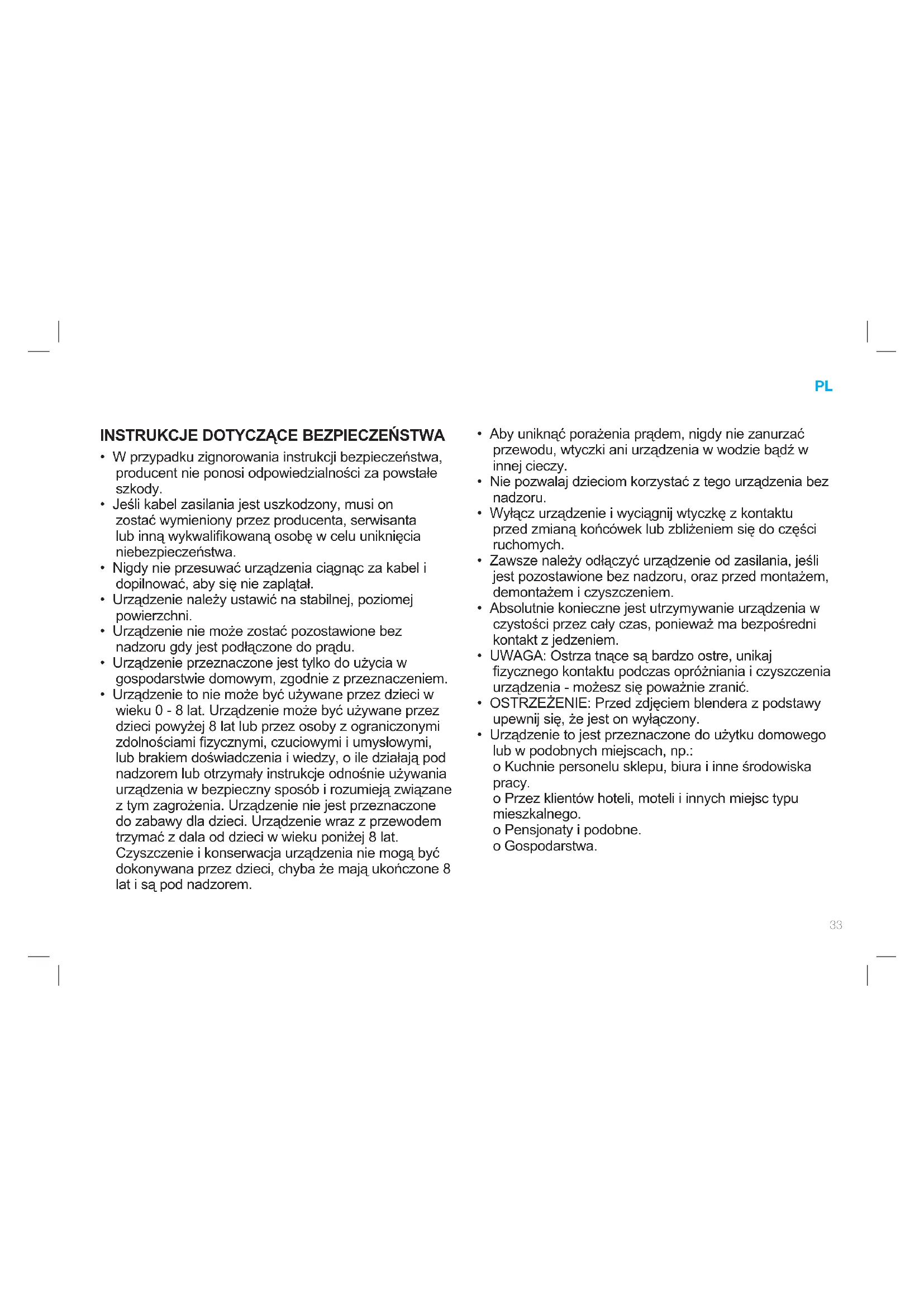 Problemy Przyczyna i rozwiązanie Urządzenie nie pracuje, brak świateł, żadnych funkcji Prawidłowo ustaw dzbanek w podstawie, podłącz do źródła zasilania. Ponownie wciśnij dzbanek, aby ustawić wyłącznik bezpieczeństwa w jego prawidłowym położeniu. Urządzenie przestaje działać po długim czasie pracy Jest to zabezpieczenie przed przeciążeniem chroniące przed uszkodzeniem silnika. Odłączyć urządzenie i pozostawić na co najmniej 30 minut do ostygnięcia. Żywność zaczyna nie być dostatecznie dobrze przerabiana Zbyt dużo lub zbyt wielkie kawałki składników potraw są poddawane przetwarzaniu jednocześnie. Spróbuj przetwarzać mniejsze ilości lub w razie potrzeby pracuj porcjami. Aby uzyskać najlepsze wyniki składniki muszą być w kawałkach nie większych niż 2cm. Nie można dobrze kruszyć lodu Wybieraj mniejsze kawałki lodu (nie większe niż 2cm) Użyj funkcję kruszenia lodu w celu uzyskania lepszych wyników kruszenia. UTYLIZACJA Jeśli chcesz zutylizować sprzęt posiadający ten symbol na obudowie i/lub w instrukcji obsługi, wykonaj poniższą procedurę: Upewnij się, że urządzenie zostanie po zakończeniu okresu żywotności przetworzone w sposób odpowiedzialny, aby zagwarantować ponowne wykorzystanie (części) urządzenia w maksymalnym stopniu. Nie wyrzucaj urządzenia z niesortowanymi odpadami, lecz przekaż je do sklepu lub do uznanego punktu zbiórki. Skontaktuj się z lokalnymi władzami, aby uzyskać informacje na temat systemu odbioru i zbierania odpadów w Twojej okolicy. Upewnij się, że urządzenie zostanie ponownie użyte, jeśli chcesz poddać je utylizacji, gdy nadal jest w dobrym stanie lub wymaga tylko drobnej naprawy. GWARANCJA