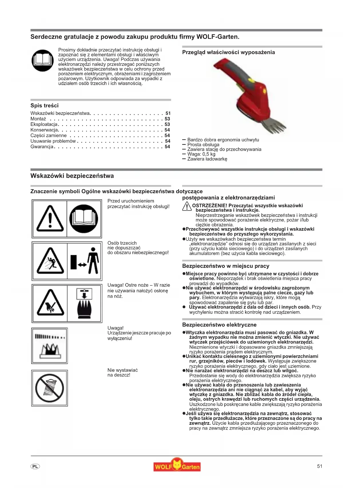 - Serdeczne gratulacje z powodu zakupu produktu firmy WOLF-Garten. Spis tre{ci Wskazówki bezpieczestwa p. 51