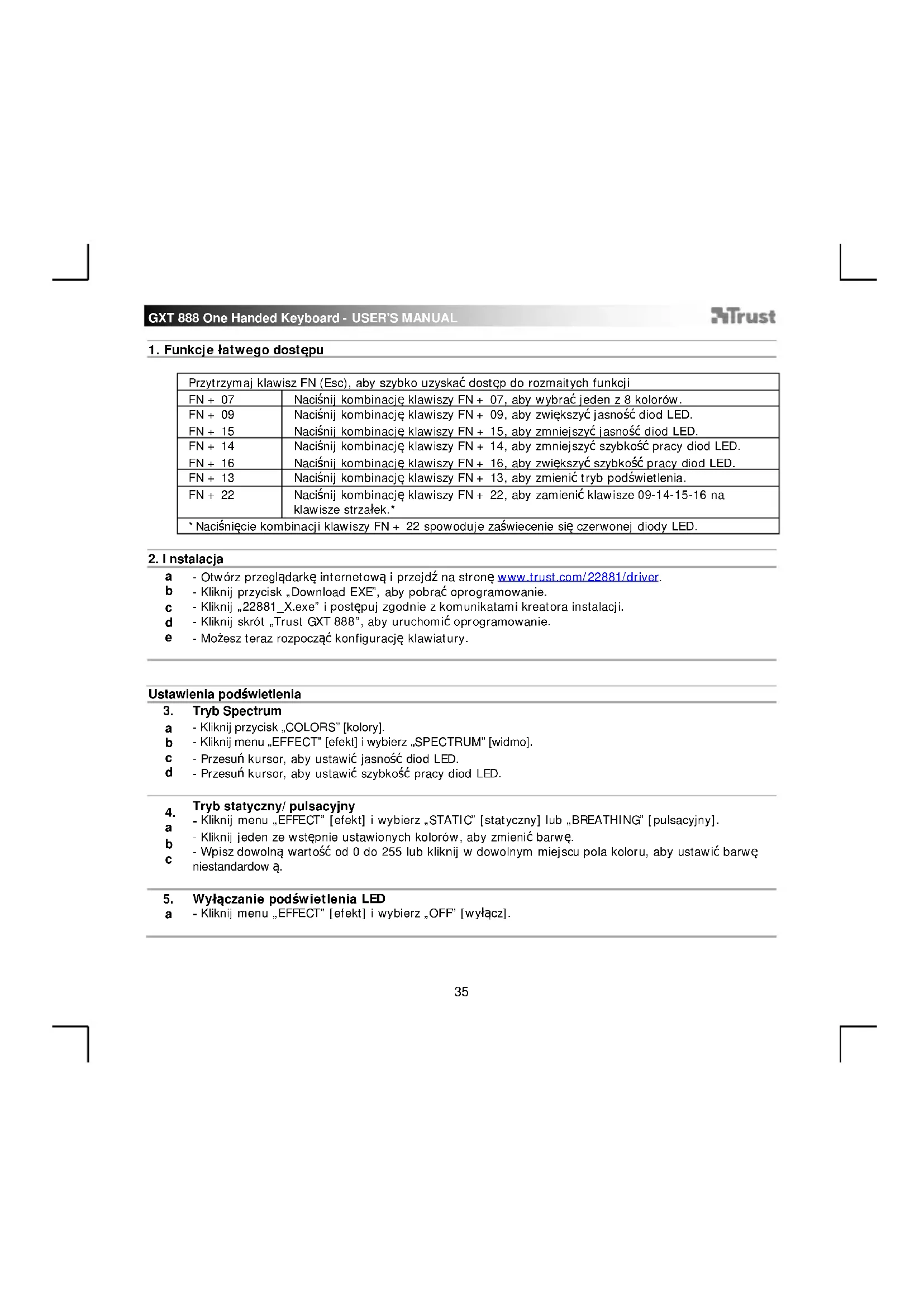 Assa GXT 888 - Klawiatura TRUST - Bezpłatna instrukcja obsługi