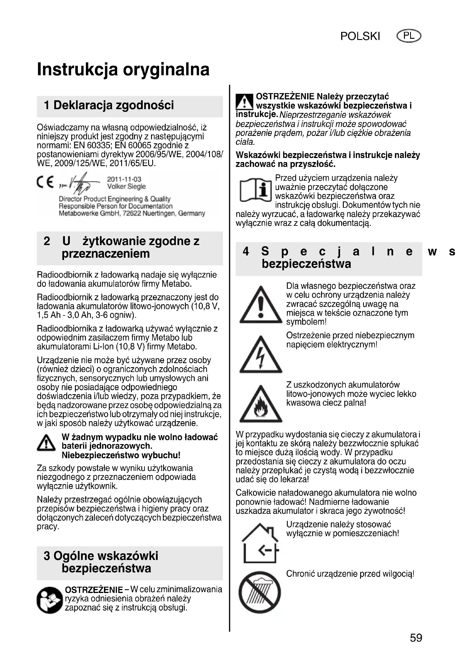 Oświadczamy na własną odpowiedzialność, iż niniejszy produkt jest zgodny z następującymi normami: EN 60335; EN 60065 zgodnie z postanowieniami dyrektyw 2006/95/WE, 2004/108/ WE, 2009/125/WE, 2011/65/EU. Radioodbiornik z ładowarką nadaje się wyłącznie do ładowania akumulatorów firmy Metabo. Radioodbiornik z ładowarką przeznaczony jest do ładowania akumulatorów litowo-jonowych (10,8 V, 1,5 Ah - 3,0 Ah, 3-6 ogniw). Radioodbiornika z ładowarką używać wyłącznie z odpowiednim zasilaczem firmy Metabo lub akumulatorami Li-Ion (10,8 V) firmy Metabo. Urządzenie nie może być używane przez osoby (również dzieci) o ograniczonych zdolnościach fizycznych, sensorycznych lub umysłowych ani osoby nie posiadające odpowiedniego doświadczenia i/lub wiedzy, poza przypadkiem, że będą nadzorowane przez osobę odpowiedzialną za ich bezpieczeństwo lub otrzymały od niej instrukcje, w jaki sposób należy użytkować urządzenie. W żadnym wypadku nie wolno ładować baterii jednorazowych. Niebezpieczeństwo wybuchu! Za szkody powstałe w wyniku użytkowania niezgodnego z przeznaczeniem odpowiada wyłącznie użytkownik. Należy przestrzegać ogólnie obowiązujących przepisów bezpieczeństwa i higieny pracy oraz dołączonych zaleceń dotyczących bezpieczeństwa pracy. OSTRZEŻENIE – W celu zminimalizowania ryzyka odniesienia obrażeń należy zapoznać się z instrukcją obsługi. OSTRZEŻENIE Należy przeczytać wszystkie wskazówki bezpieczeństwa i instrukcje. Nieprzestrzeganie wskazówek bezpieczeństwa i instrukcji może spowodować porażenie prądem, pożar i/lub ciężkie obrażenia ciała. Wskazówki bezpieczeństwa i instrukcje należy zachować na przyszłość. Przed użyciem urządzenia należy uważnie przeczytać dołączone wskazówki bezpieczeństwa oraz instrukcję obsługi. Dokumentów tych nie należy wyrzucać, a ładowarkę należy przekazywać wyłącznie wraz z całą dokumentacją. Dla własnego bezpieczeństwa oraz w celu ochrony urządzenia należy zwracać szczególną uwagę na miejsca w tekście oznaczone tym symbolem! Ostrzeżenie przed niebezpiecznym napięciem elektrycznym! Z uszkodzonych akumulatorów litowo-jonowych może wyciec lekko kwasowa ciecz palna! W przypadku wydostania się cieczy z akumulatora i jej kontaktu ze skórą należy bezzwłocznie spłukać to miejsce dużą ilością wody. W przypadku przedostania się cieczy z akumulatora do oczu należy przep łukać je czystą wodą i bezzwłocznie udać się do lekarza! Całkowicie naładowanego akumulatora nie wolno ponownie ładować! Nadmierne ładowanie uszkadza akumulator i skraca jego żywotność! Urządzenie należy stosować wyłącznie w pomieszczeniach! Chronić urządzenie przed wilgocią! Instrukcja oryginalna 1 Deklaracja zgodności 2Użytkowanie zgodne z przeznaczeniem 3 Ogólne wskazówki bezpieczeństwa 4Specjalne wskazówki bezpieczeństwa60 POLSKI