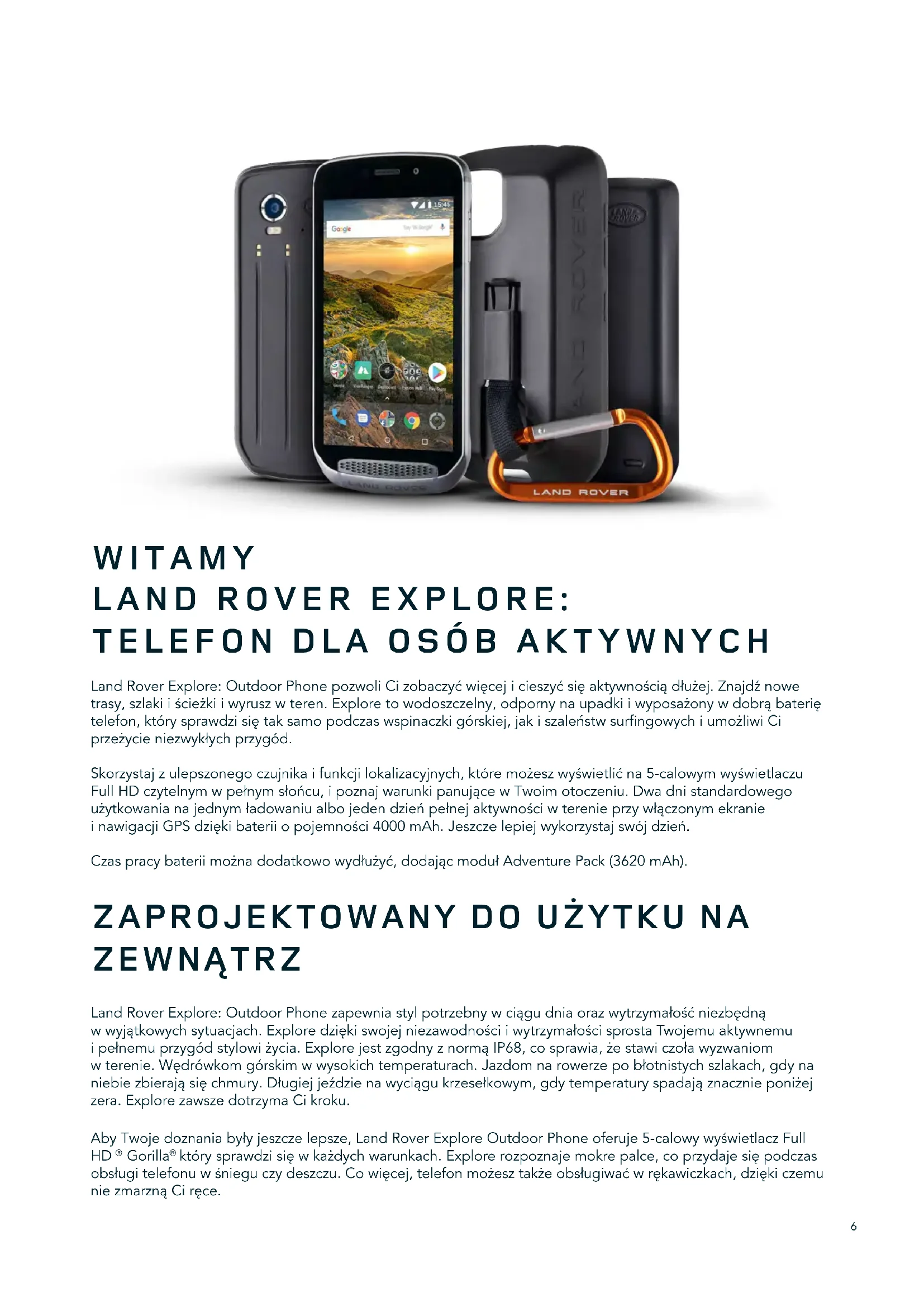 ZEWNĄTRZ LandRoverExplore:OutdoorPhonezapewniastylpotrzebnywciągudniaorazwytrzymałośćniezbędną wwyjątkowychsytuacjach.ExploredziękiswojejniezawodnościiwytrzymałościsprostaTwojemuaktywnemu ipełnemuprzygódstylowiżycia.ExplorejestzgodnyznormąIP68,cosprawia,żestawiczoławyzwaniom wterenie.Wędrówkomgórskimwwysokichtemperaturach.Jazdomnarowerzepobłotnistychszlakach,gdyna niebiezbierająsięchmury.Długiejjeździenawyciągukrzesełkowym,gdytemperaturyspadająznacznieponiżej zera.ExplorezawszedotrzymaCikroku. AbyTwojedoznaniabyłyjeszczelepsze,LandRoverExploreOutdoorPhoneoferuje5-calowywyświetlaczFull