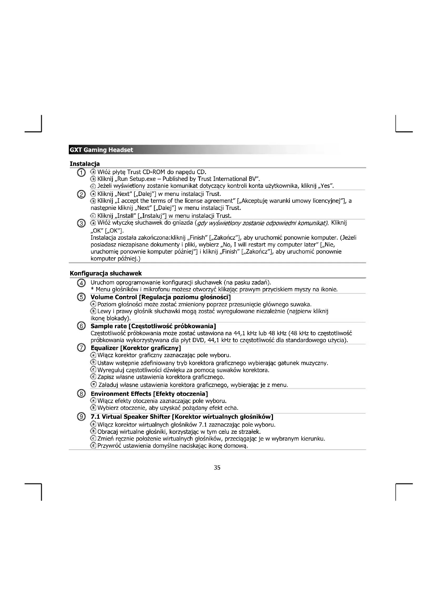 Włóż płytę Trust CD-ROM do napędu CD. Kliknij „Run Setup.exe – Published by Trust International BV”. Jeżeli wyświetlony zostanie komunikat dotyczący kontroli konta użytkownika, kliknij „Yes”. Kliknij „Next” [„Dalej”] w menu instalacji Trust. Kliknij „I accept the terms of the license agreement” [„Akceptuję warunki umowy licencyjnej”], a następnie kliknij „Next” [„Dalej”] w menu instalacji Trust. Kliknij „Install” [„Instaluj”] w menu instalacji Trust. Włóż wtyczkę słuchawek do gniazda ( gdy wyświetlony zostanie odpowiedni komunikat). Kliknij „OK” [„OK”]. Instalacja została zakończona:kliknij „Finish” [„Zakończ”], aby uruchomić ponownie komputer. (Jeżeli posiadasz niezapisane dokumenty i pliki, wybierz „No, I will restart my computer later” [„Nie, uruchomię ponownie komputer później”] i kliknij „Finish” [„Zakończ”], aby uruchomić ponownie komputer później.)
