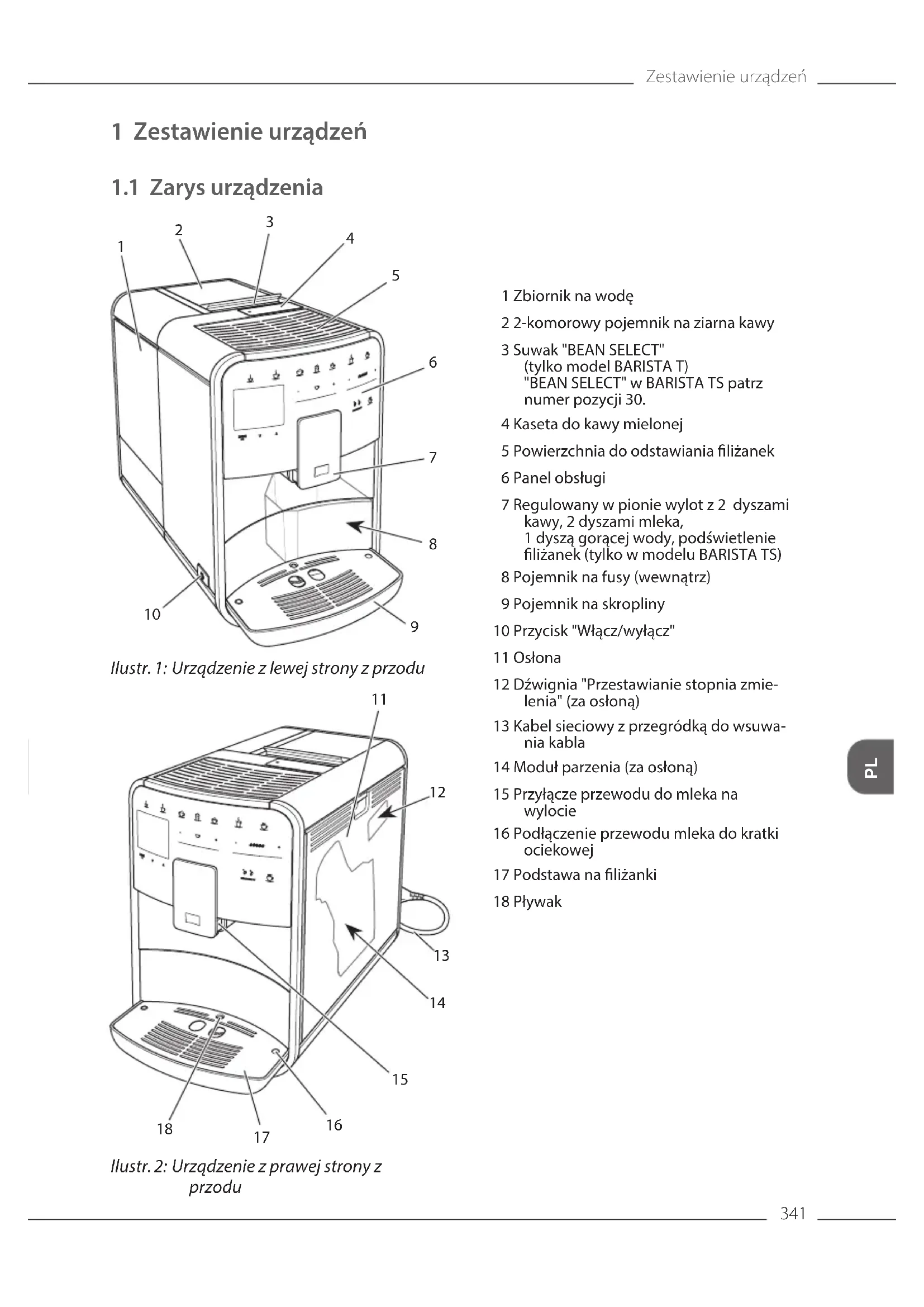 Ilustr. 2: Urządzenie z prawej strony z przodu 1 Zbiornik na wodę 2 2-komorowy pojemnik na ziarna kawy 3 Suwak "BEAN SELECT" (tylko model BARISTAT) "BEAN SELECT" w BARISTA TS patrz numer pozycji 30. 4 Kaseta do kawy mielonej 5 Powierzchnia do odstawiania liżanek 6 Panel obsługi 7 Regulowany w pionie wylot z 2 dyszami kawy, 2 dyszami mleka, 1dyszą gorącej wody, podświetlenie liżanek (tylko w modelu BARISTATS) 8 Pojemnik na fusy (wewnątrz) 9 Pojemnik na skropliny 10 Przycisk "Włącz/wyłącz" 11 Osłona 12 Dźwignia "Przestawianie stopnia zmie- lenia" (za osłoną) 13 Kabel sieciowy z przegródką do wsuwa- nia kabla 14 Moduł parzenia (za osłoną) 15 Przyłącze przewodu do mleka na wylocie 16 Podłączenie przewodu mleka do kratki ociekowej 17 Podstawa na liżanki 18 PływakZestawienie urządzeń