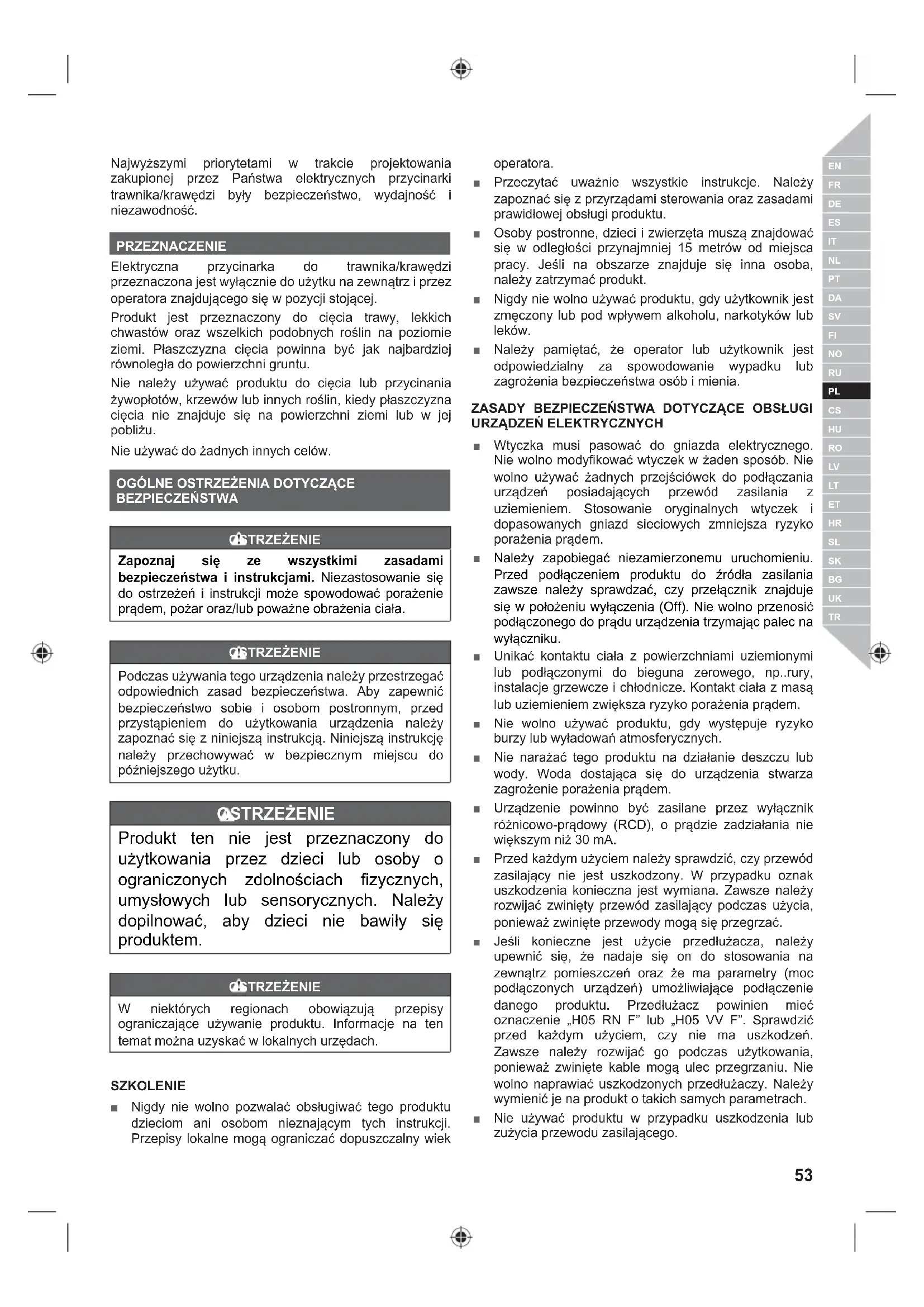 Najwyższymi priorytetami w trakcie projektowania zakupionej przez Państwa elektrycznych przycinarki trawnika/krawędzi były bezpieczeństwo, wydajność i niezawodność. PRZEZNACZENIE Elektryczna przycinarka do trawnika/krawędzi przeznaczona jest wyłącznie do użytku na zewnątrz i przez operatora znajdującego się w pozycji stojącej. Produkt jest przeznaczony do cięcia trawy, lekkich chwastów oraz wszelkich podobnych roślin na poziomie ziemi. Płaszczyzna cięcia powinna być jak najbardziej równoległa do powierzchni gruntu. Nie należy używać produktu do cięcia lub przycinania żywopłotów, krzewów lub innych roślin, kiedy płaszczyzna cięcia nie znajduje się na powierzchni ziemi lub w jej pobliżu. Nie używać do żadnych innych celów.