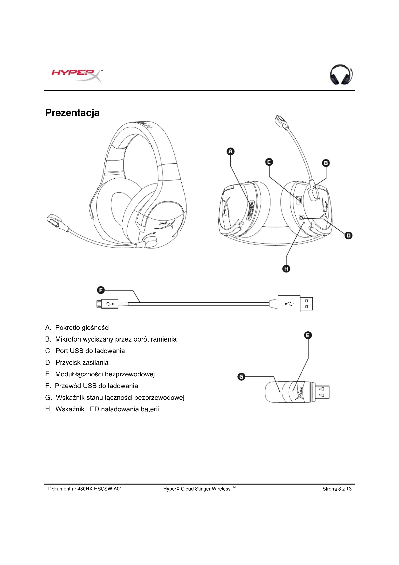 A. Pokrętło głośności B. Mikrofon wyciszany przez obrót ramienia C. Port USB do ładowania D. Przycisk zasilania E. Moduł łączności bezprzewodowej F. Przewód USB do ładowania G. Wskaźnik stanu łączności bezprzewodowej H. Wskaźnik LED naładowania bateriiDokument nr 480HX-HSCSW.A01 HyperX Cloud Stinger Wireless