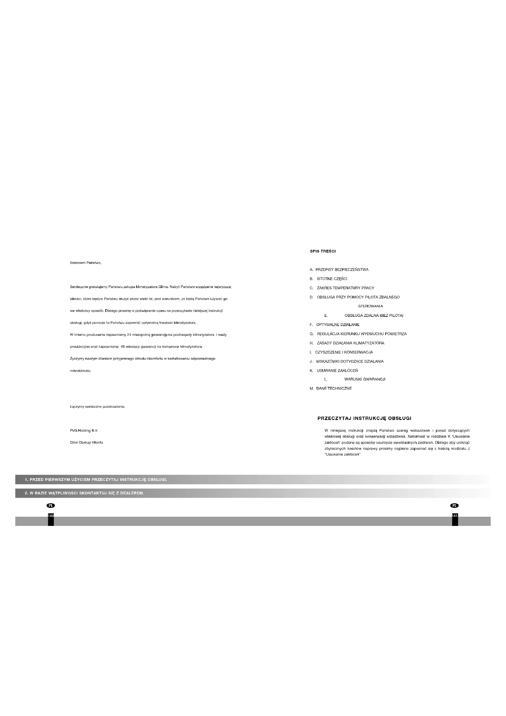 Szanowni Państwo, Serdecznie gratulujemy Państwu zakupu klimatyzatora Qlima. Nabyli Państwo urządzenie najwyższej jakości, które będzie Państwu służyć przez wiele lat, pod warunkiem, że będą Państwo używać go we właściwy sposób. Dlatego prosimy o poświęcenie czasu na przeczytanie niniejszej instrukcji obsługi, gdyż pomoże to Państwu zapewnić optymalną trwałość klimatyzatora. W imieniu producenta zapewniamy 24 miesięczną gwarancję na podzespoły klimatyzatora i wady produkcyjne oraz zapewniamy 48 miesięcy gwarancji na kompresor klimatyzatora. Życzymy naszym klientom przyjemnego chłodu i komfortu w kształtowaniu odpowiedniego mikroklimatu Łączymy serdeczne pozdrowienia, PVG Holding B.V. Dział Obsługi Klienta 140 141Przed instalacją klimatyzatora należy sprawdzić czy: