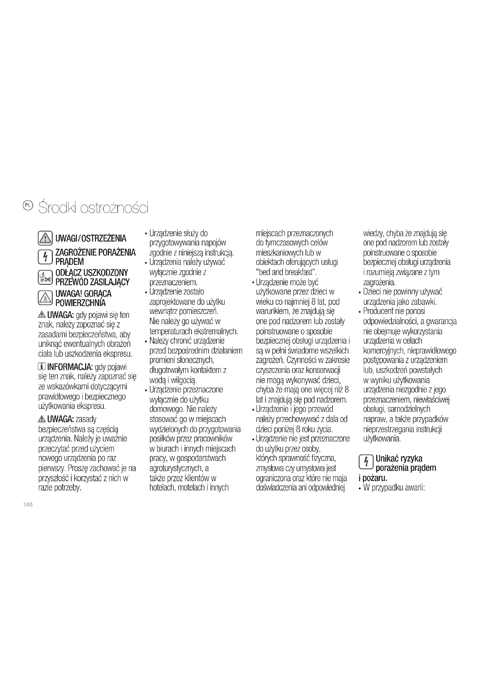 POWIERZCHNIA UWAGA: gdy pojawi się ten znak, należy zapoznać się z zasadami bezpieczeństwa, aby uniknąć ewentualnych obrażeń ciała lub uszkodzenia ekspresu. INFORMACJA: gdy pojawi się ten znak, należy zapoznać się ze wskazówkami dotyczącymi prawidłowego i bezpiecznego użytkowania ekspresu. UWAGA: zasady bezpieczeństwa są częścią urządzenia. Należy je uważnie przeczytać przed użyciem nowego urządzenia po raz pierwszy. Proszę zachować je na przyszłość i korzystać z nich w razie potrzeby.